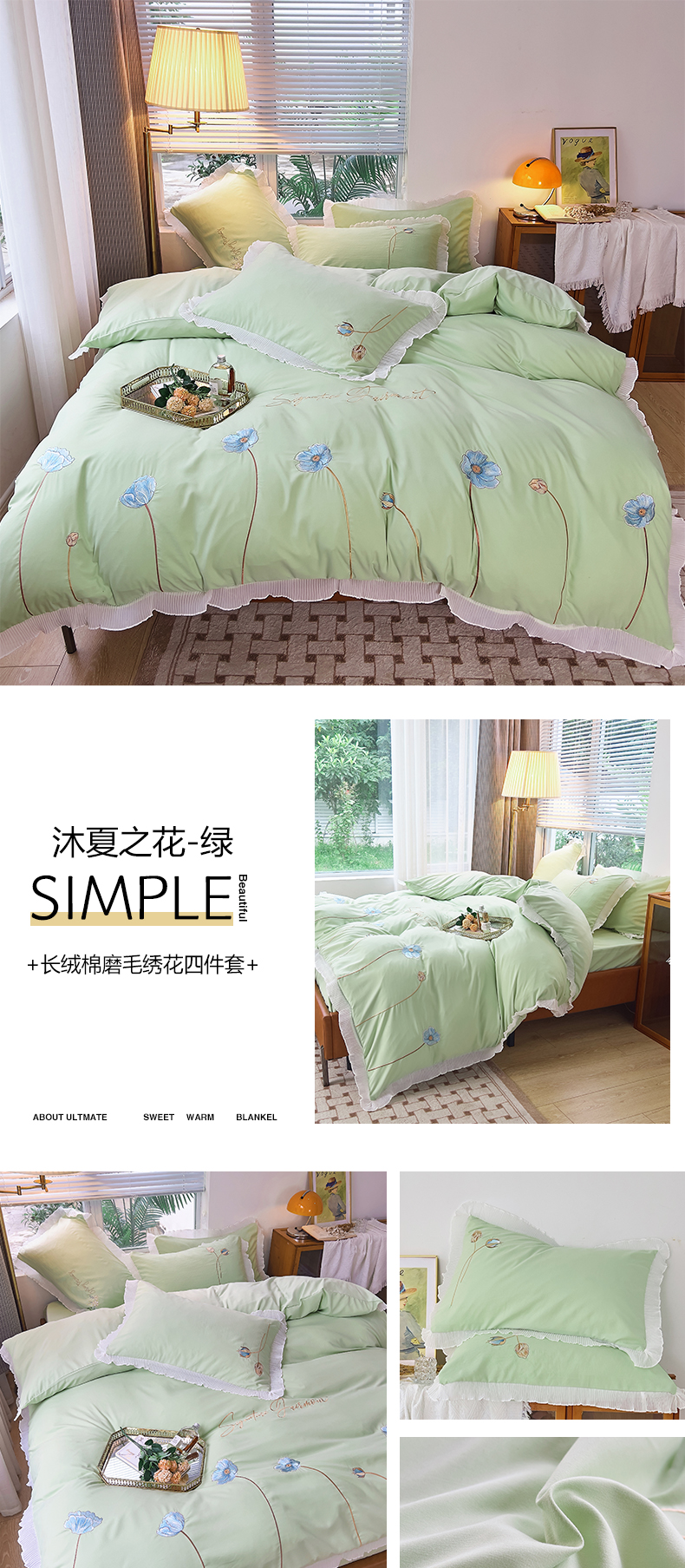 青泽家纺 2025新款母婴级ins风韩版绣花荷叶边水洗棉磨毛四件套 手捧花绿