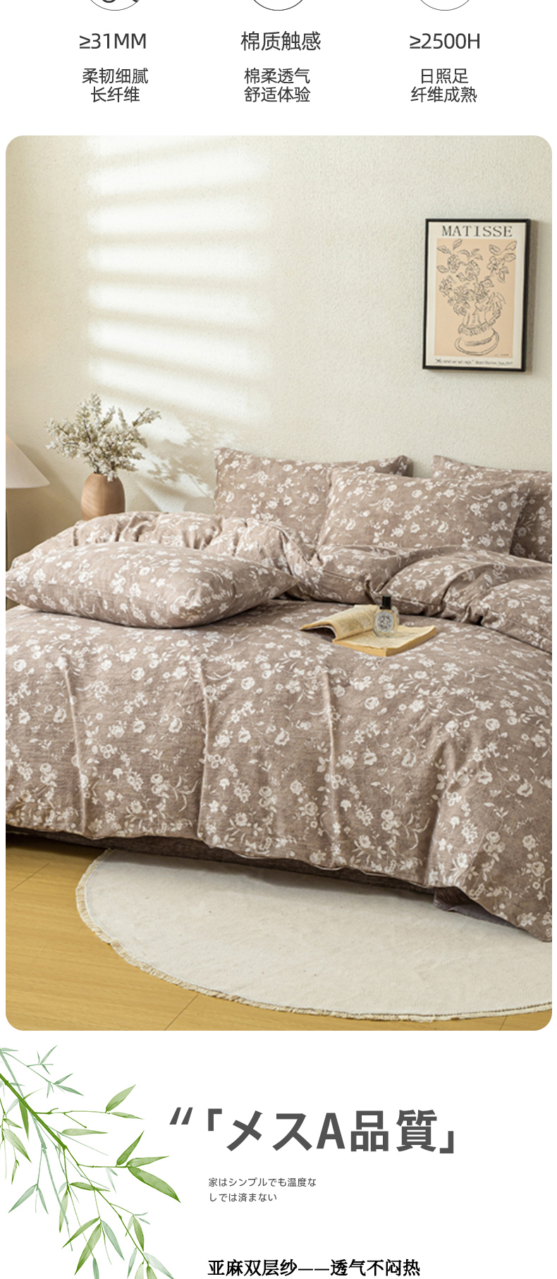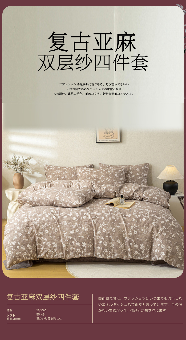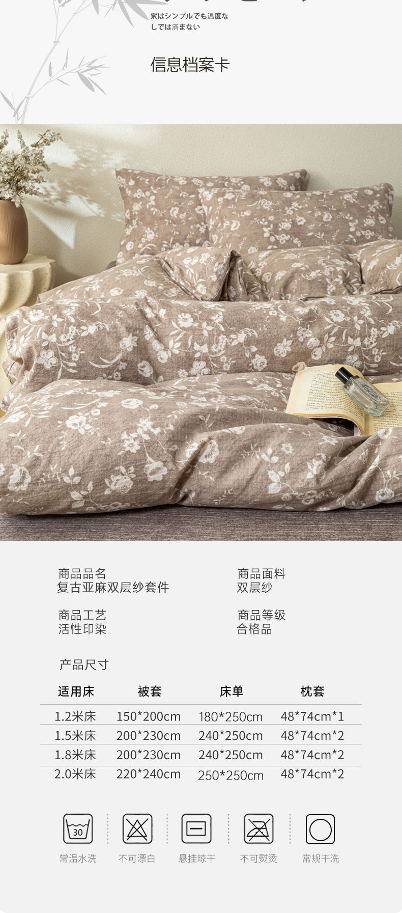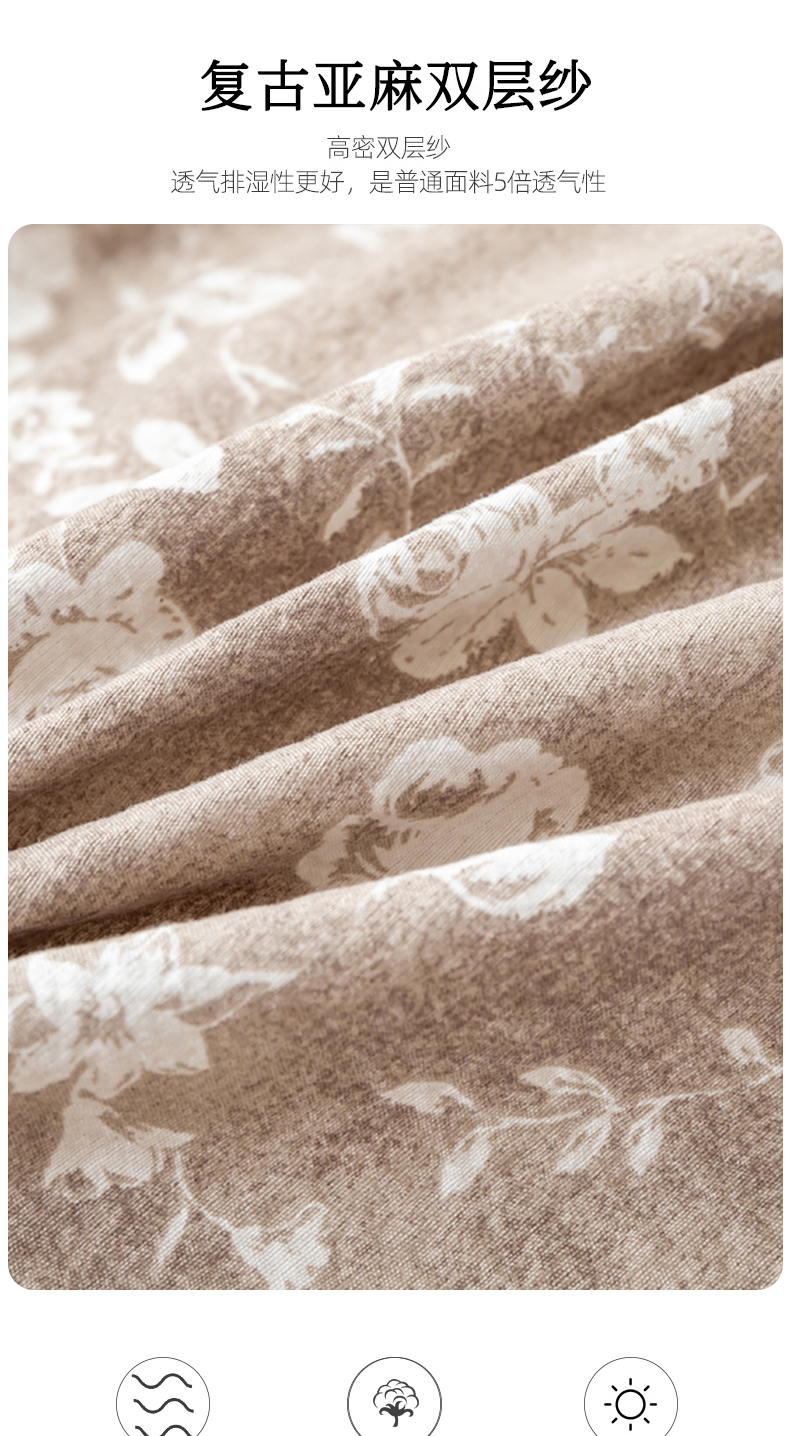 商品名称:漫仙阁家纺 2025新款加厚高克重原麻复古风印花四件套 花蕾-咖