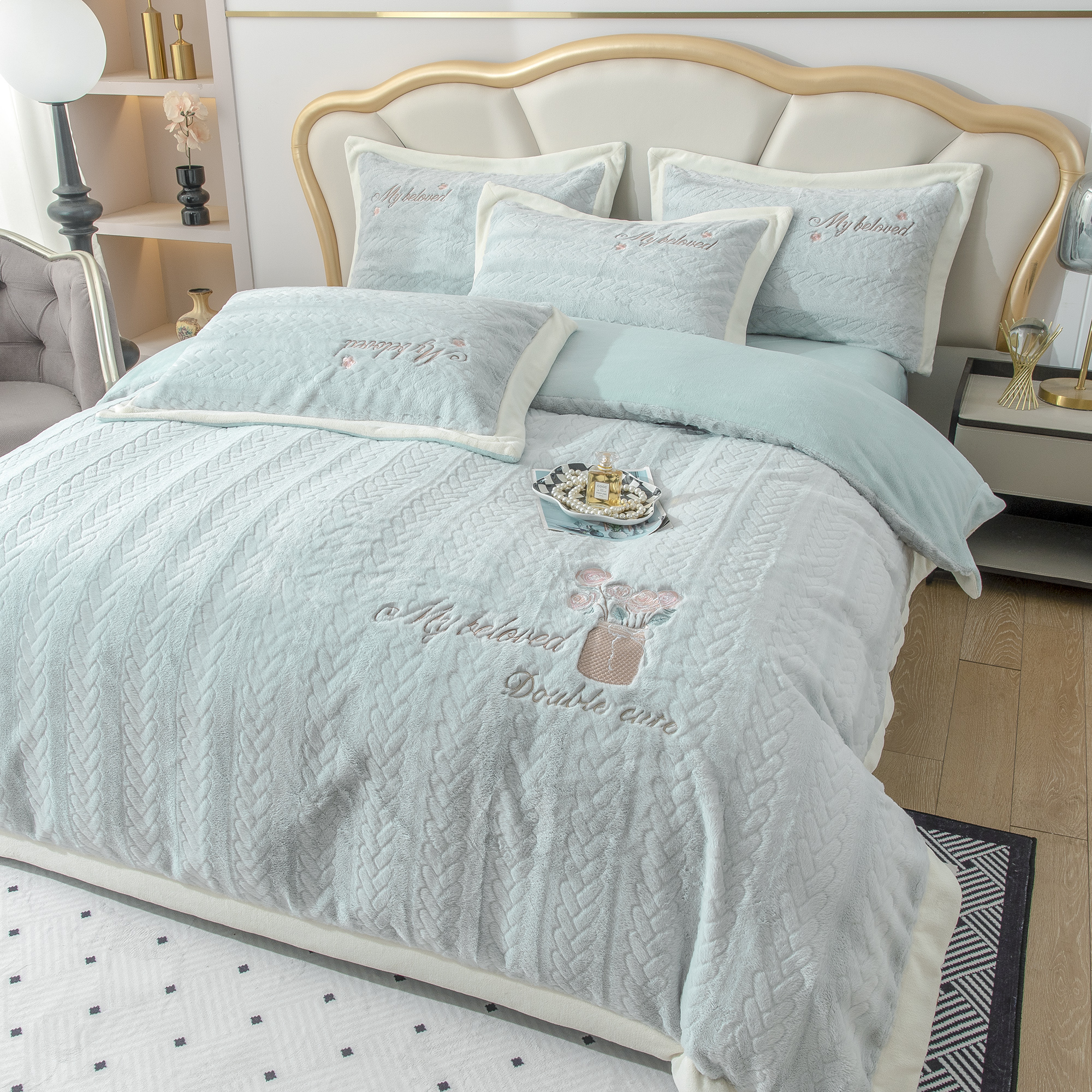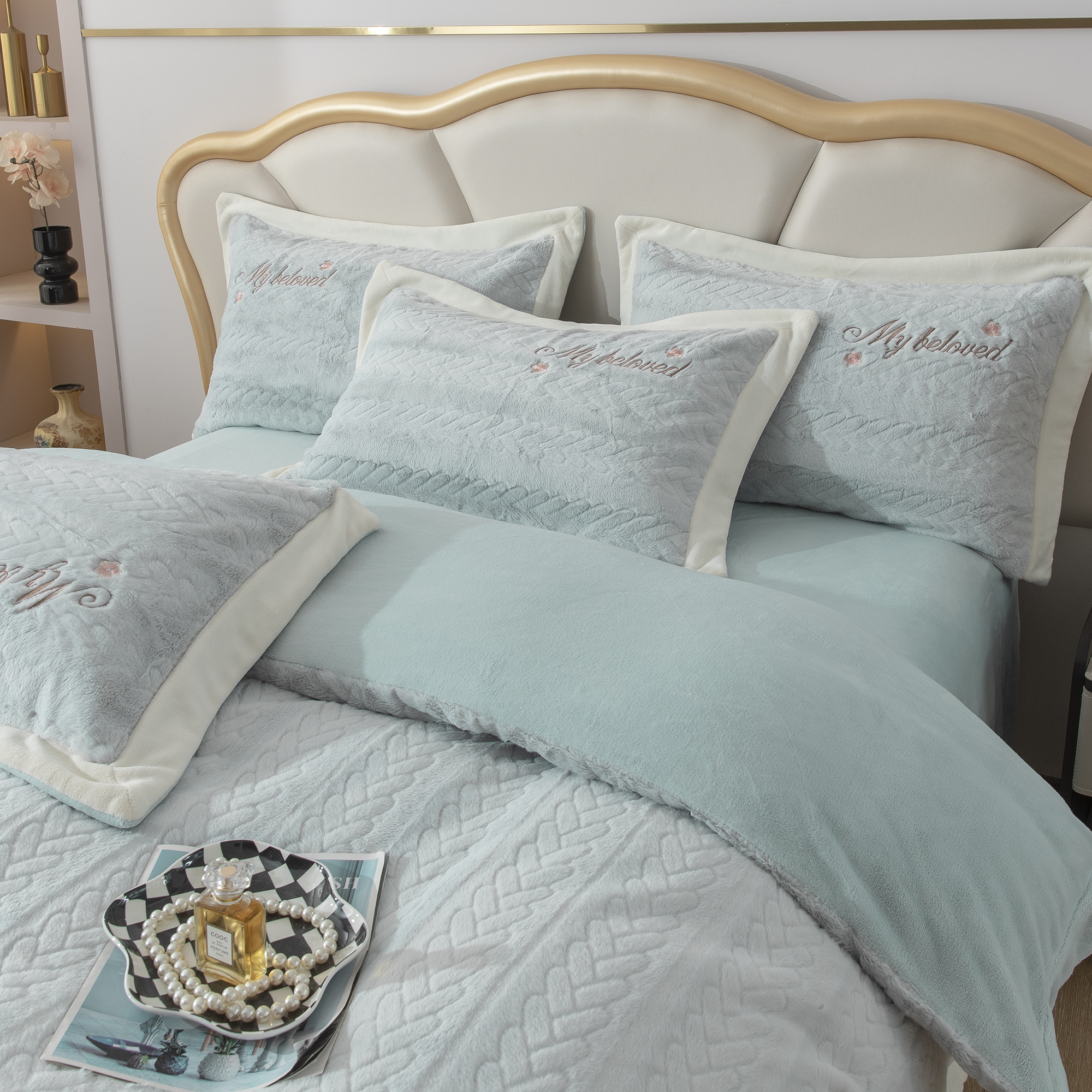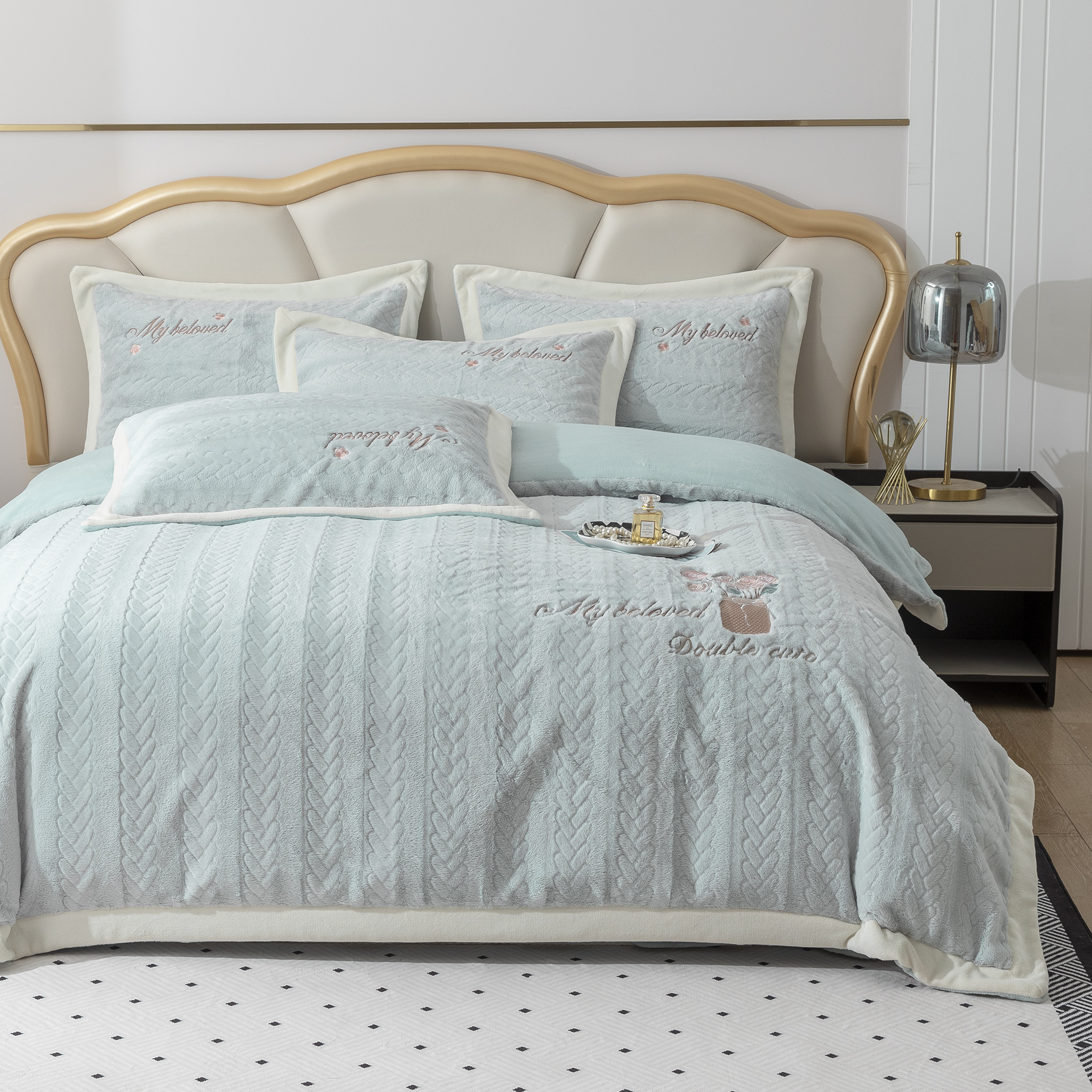 贝尔 2025新款纯色高克重牛奶绒刺绣四件套-羽魅 羽魅-浅绿,羽魅-浅绿