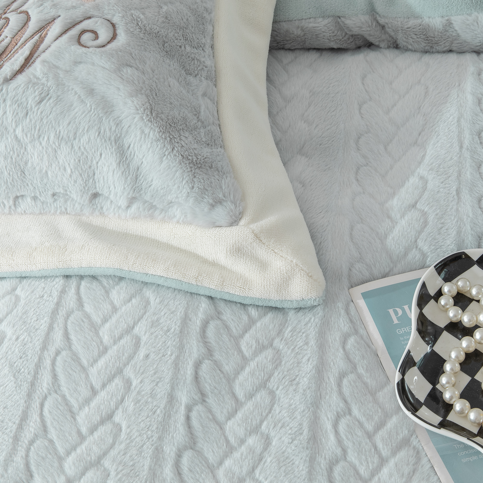 贝尔 2025新款10斤重花时光-兔毛绒拼角刺绣纯色高克重四件套(赠送拎袋) 天空蓝