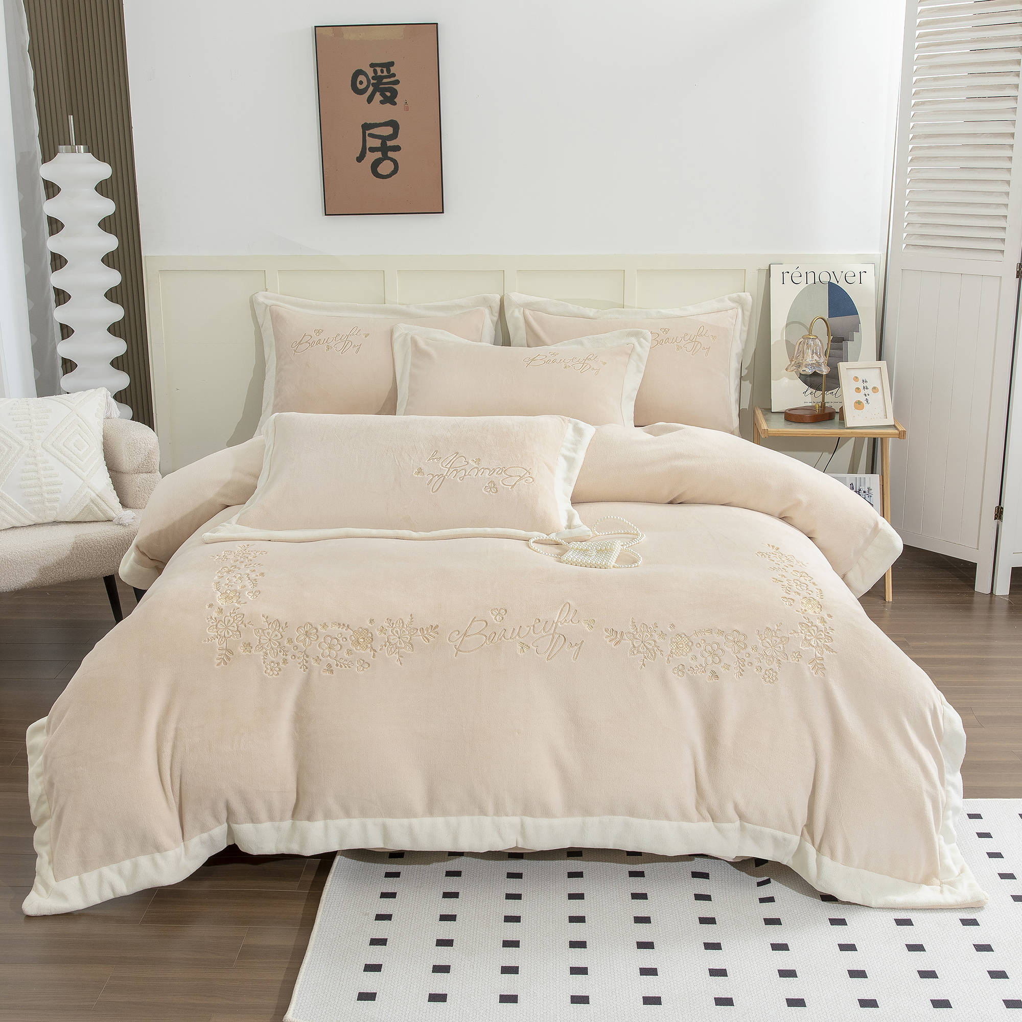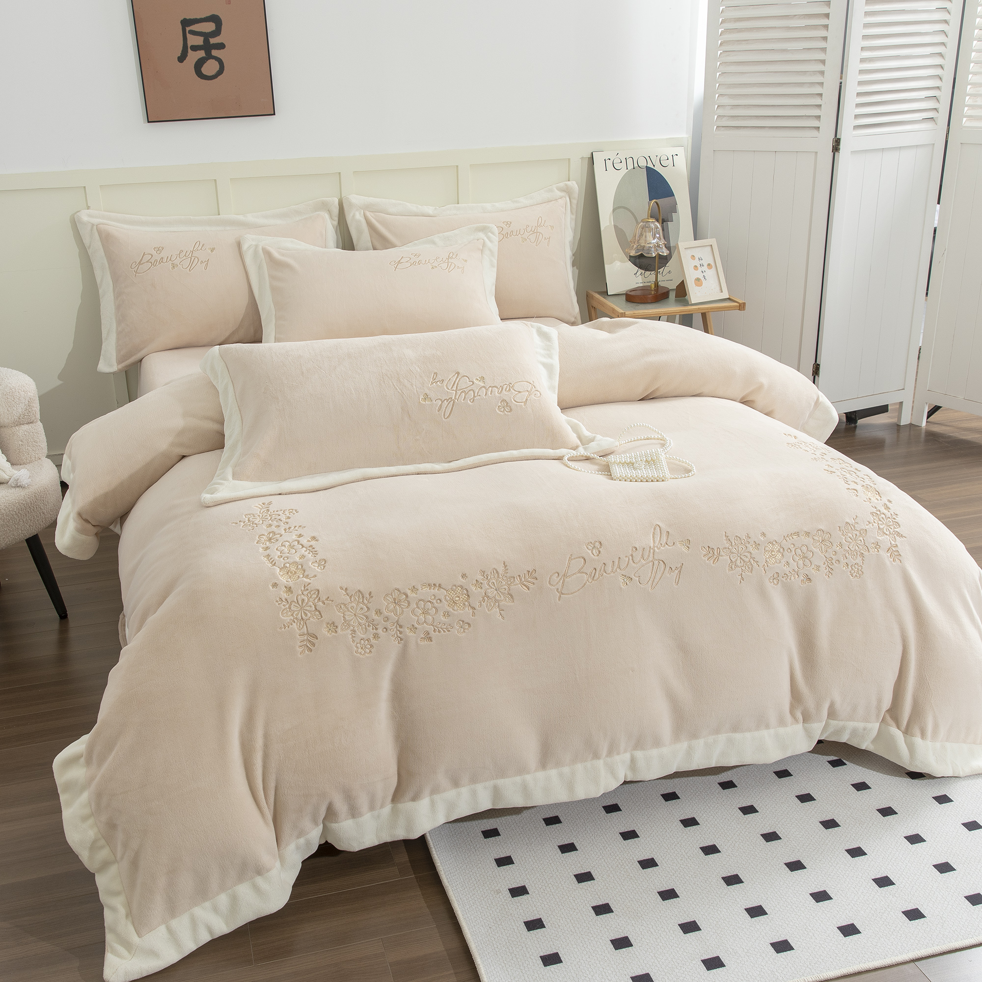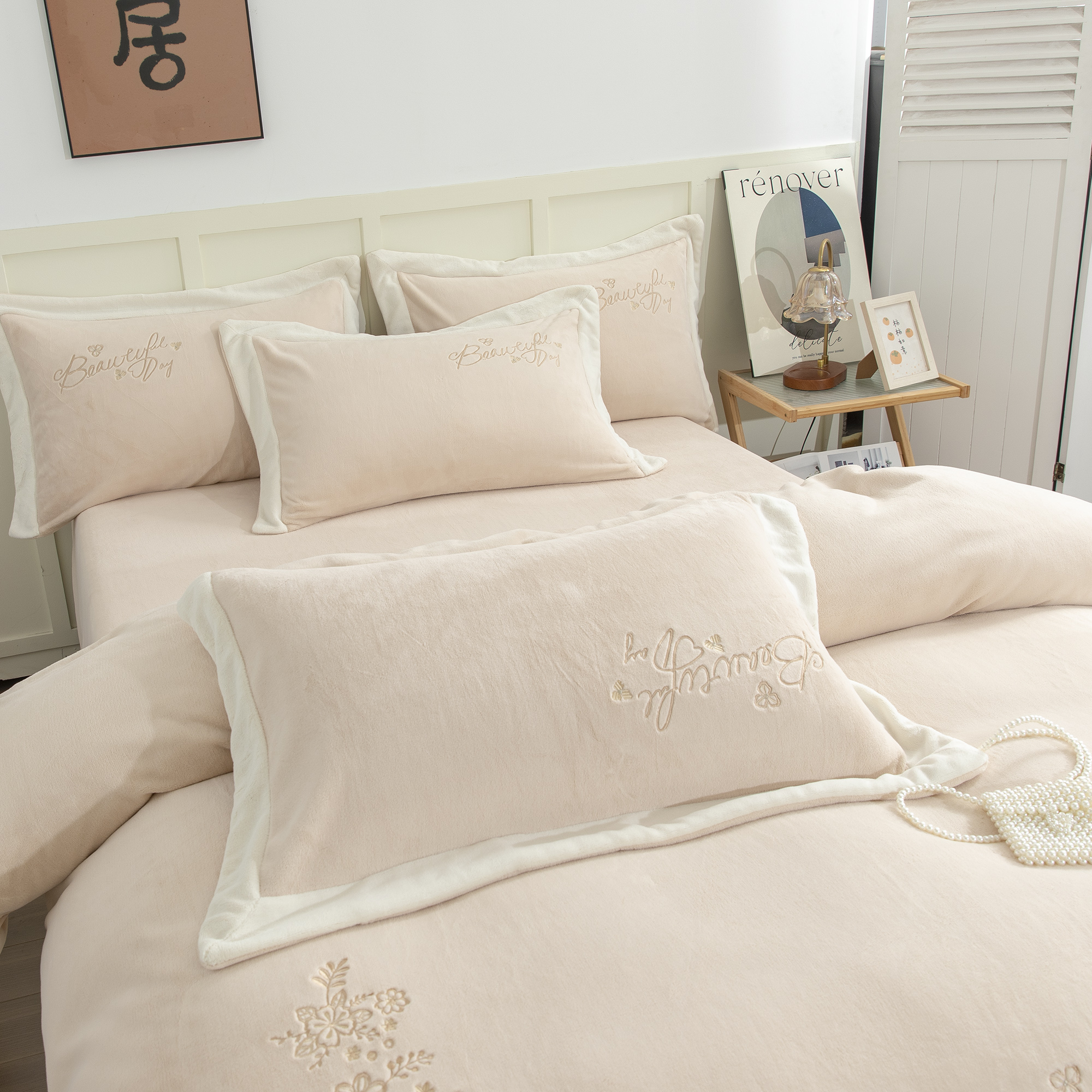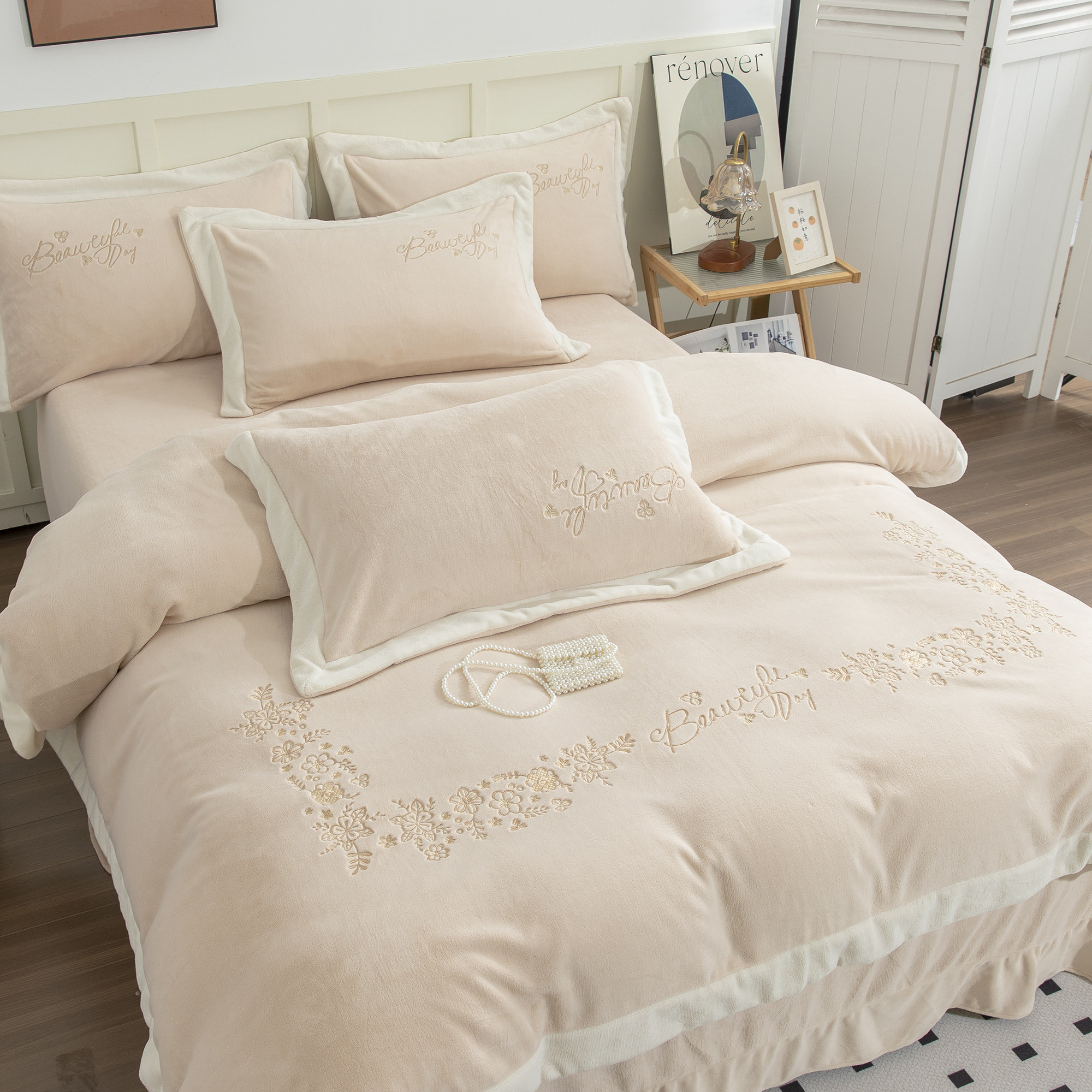 贝尔 2025新款纯色高克重牛奶绒刺绣四件套-羽魅 羽魅-豆沙,羽魅-豆沙