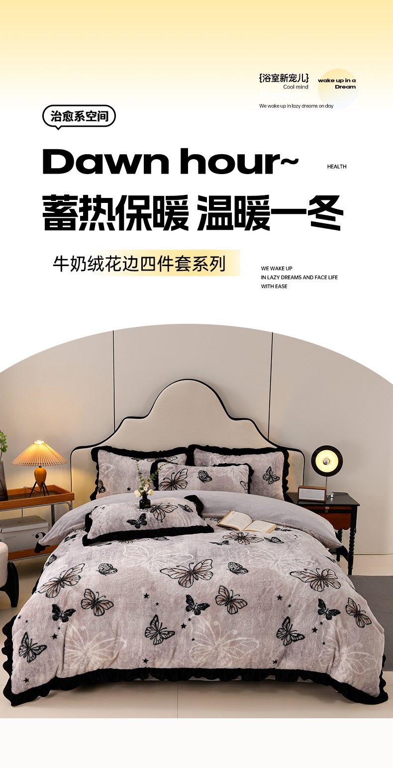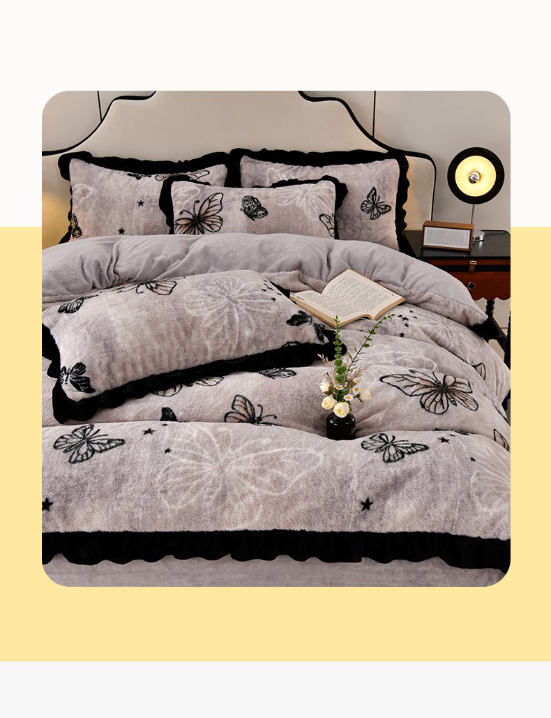 畅畅家纺 2025新款冬季9斤重加厚皮草绒兔毛绒轻奢赫本风牛奶绒花边四件套 轻奢-蝴蝶