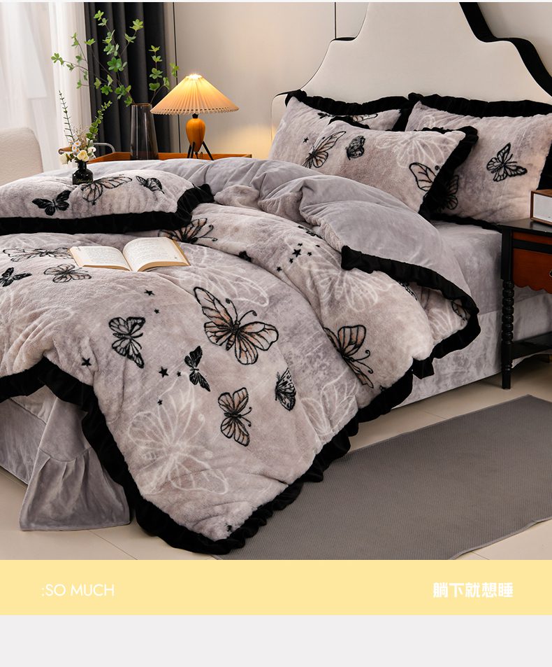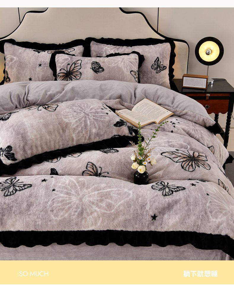 商品名称:畅畅家纺 2025新款冬季9斤重加厚皮草绒兔毛绒轻奢赫本风牛奶绒花边四件套 轻奢-蝴蝶