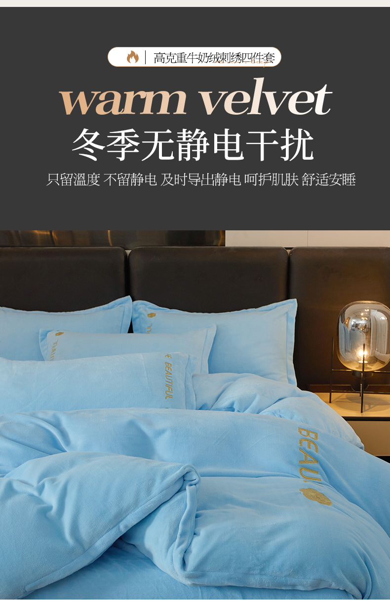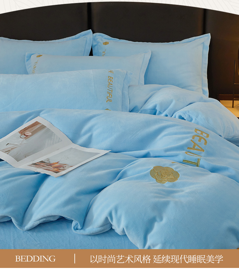 商品名称:悦织湾家纺 2025新款绣花200克重牛奶绒四件套刺绣3.5万针7斤重高密加厚保暖跨境专供外贸出口电商热销款 山茶花-天空蓝