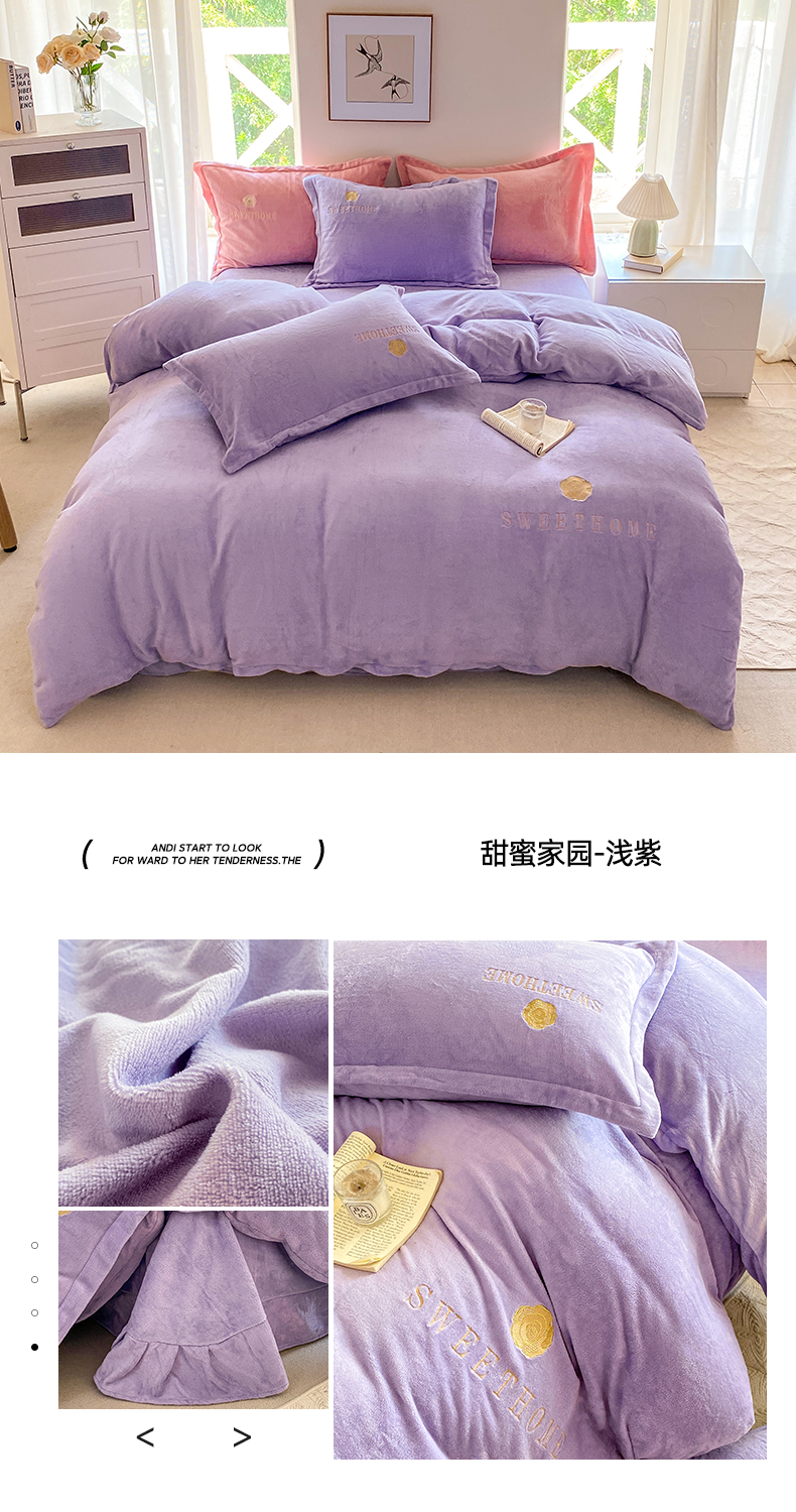 悦织湾家纺 2025新款绣花200克重牛奶绒四件套刺绣3.5万针7斤重高密加厚保暖跨境专供外贸出口电商热销款 山茶花-天空蓝