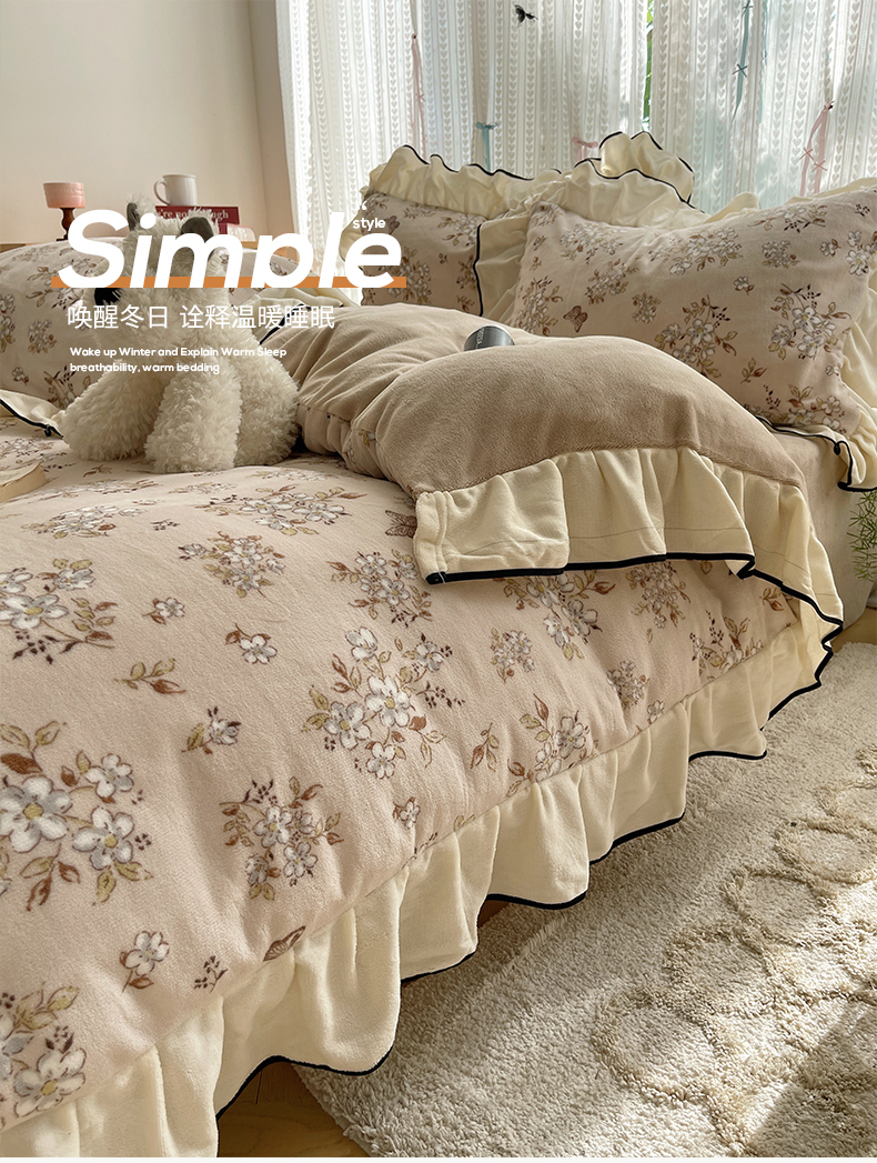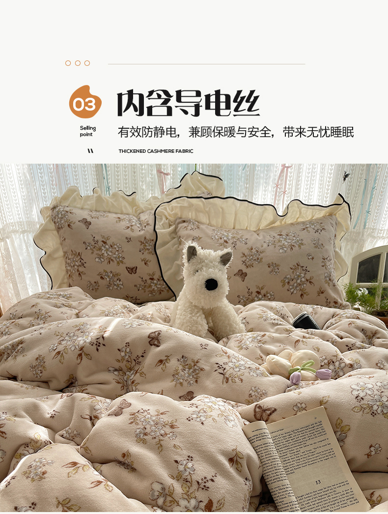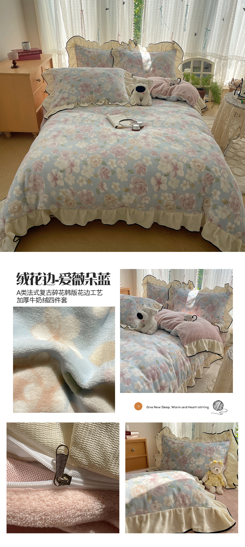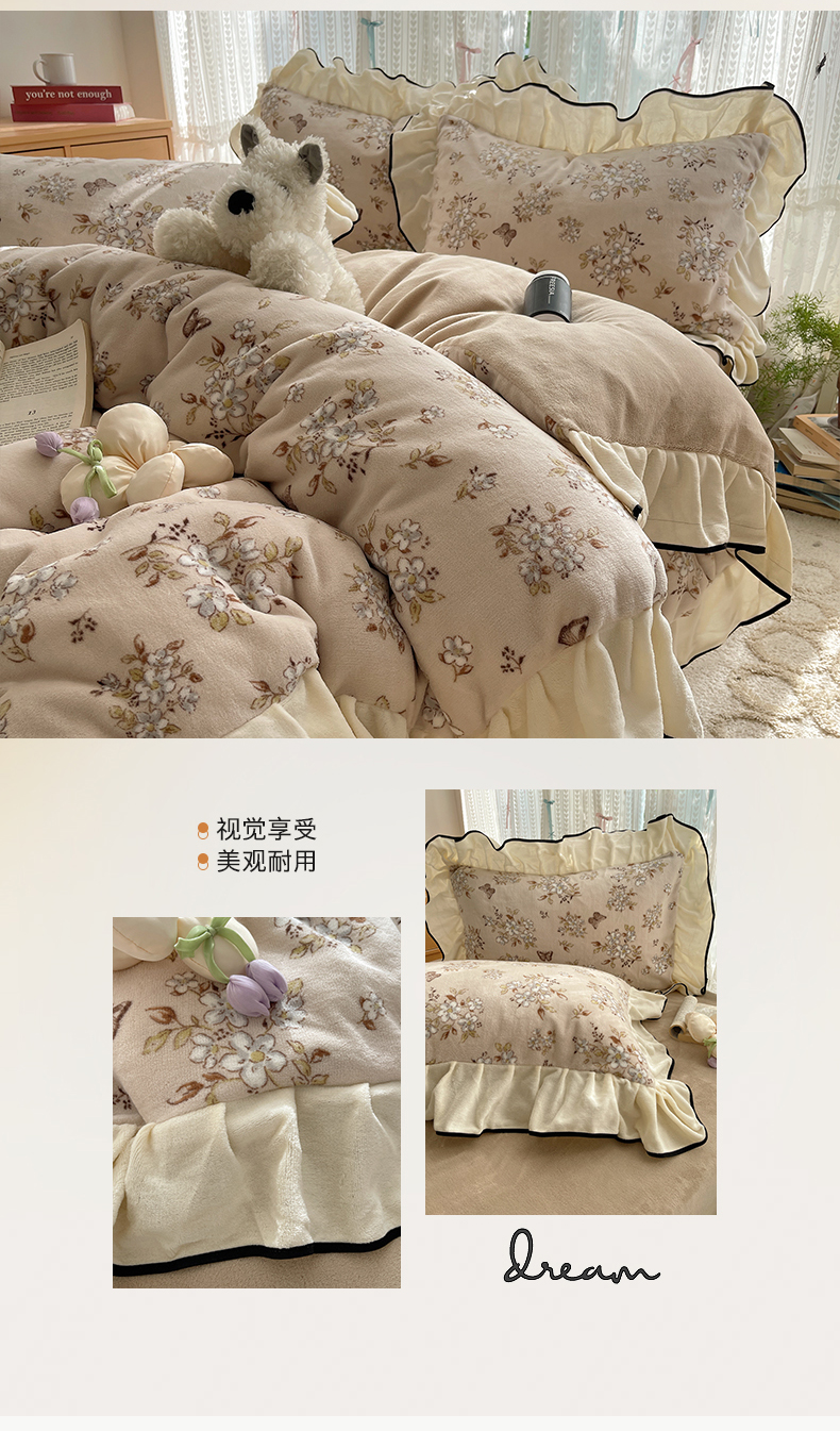 商品名称:桃子家居 2025新款A类法式复古碎花牛奶绒韩版花边工艺加厚牛奶绒四件套 绒花边-蝶樱