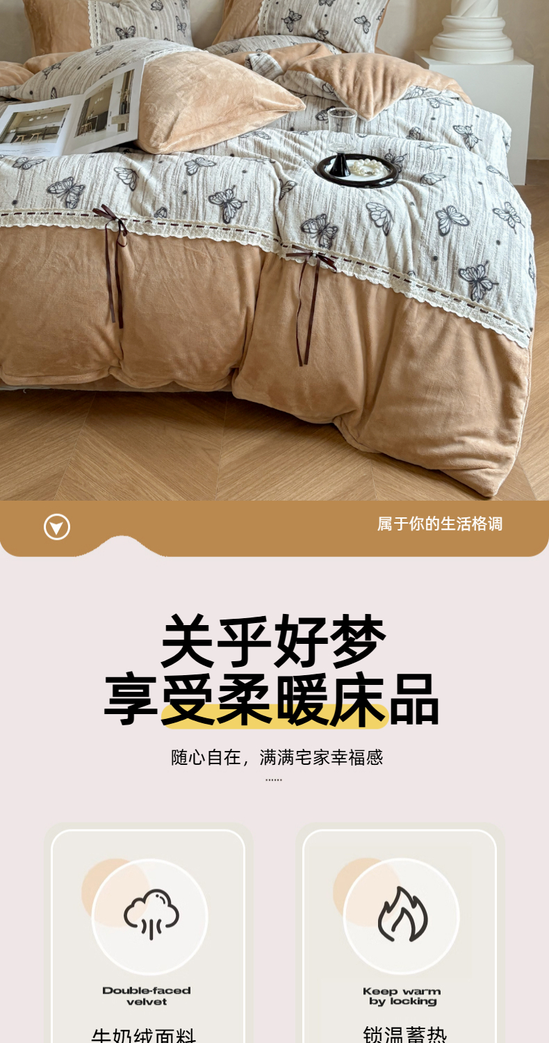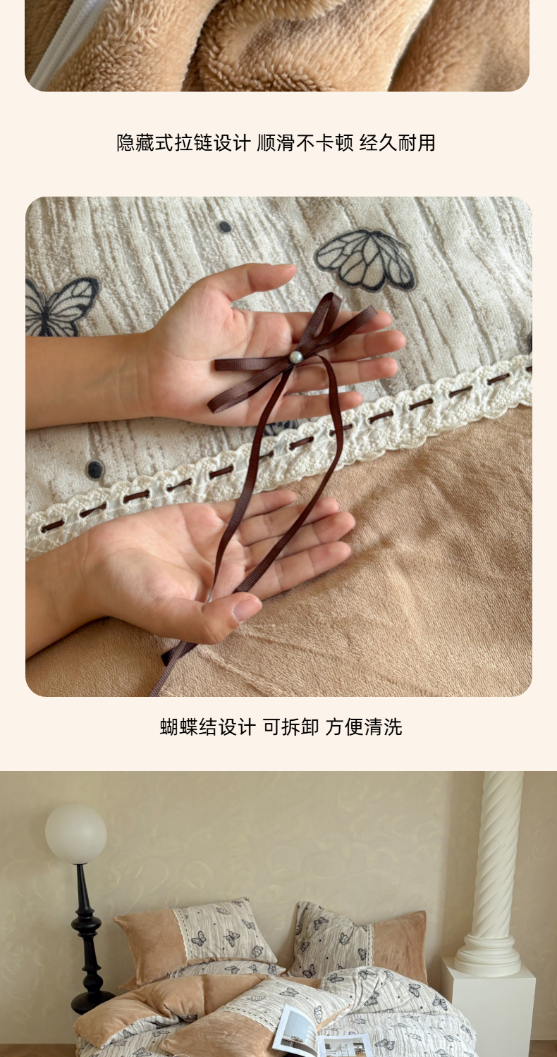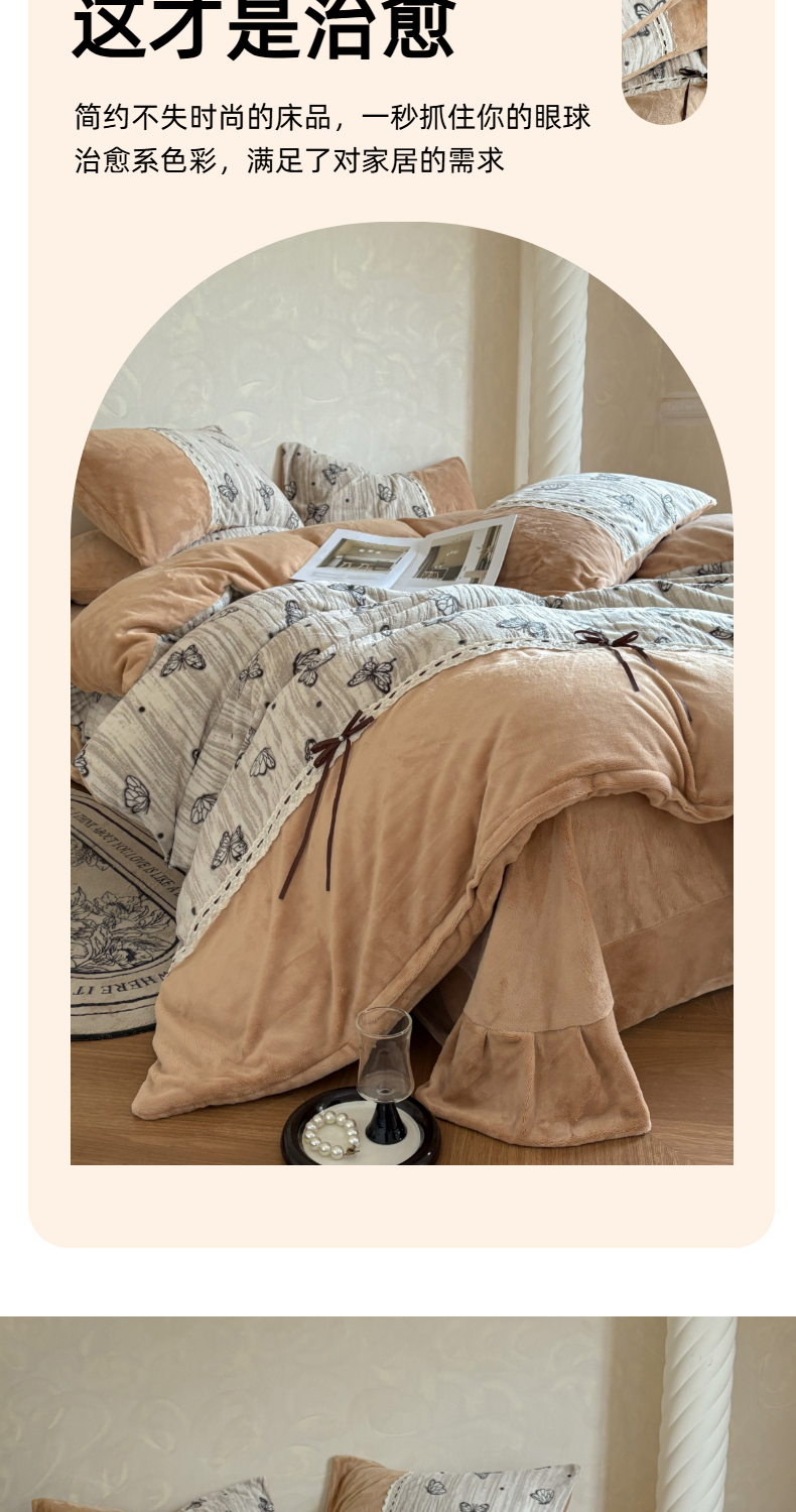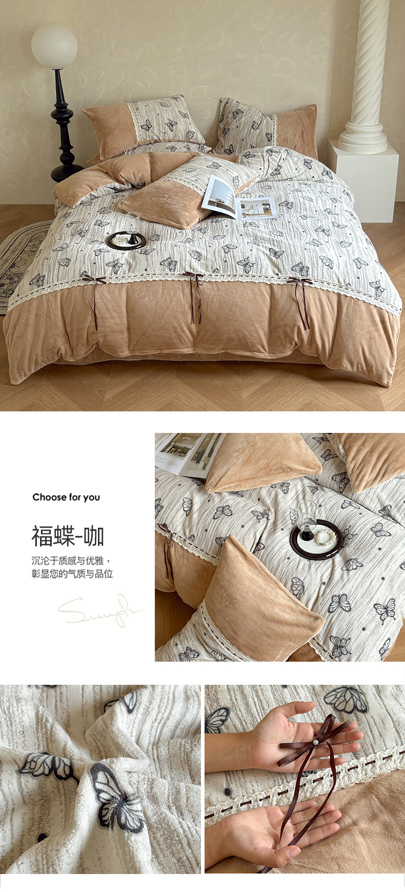 当前位置: 91家纺网 > 商品网购 > 床品套件 > 四件套 > 牛奶绒四件套 > 昊川家纺 2025新款牛奶绒雕花绒轻奢花边蝴蝶结拼接款四件套 福蝶-咖