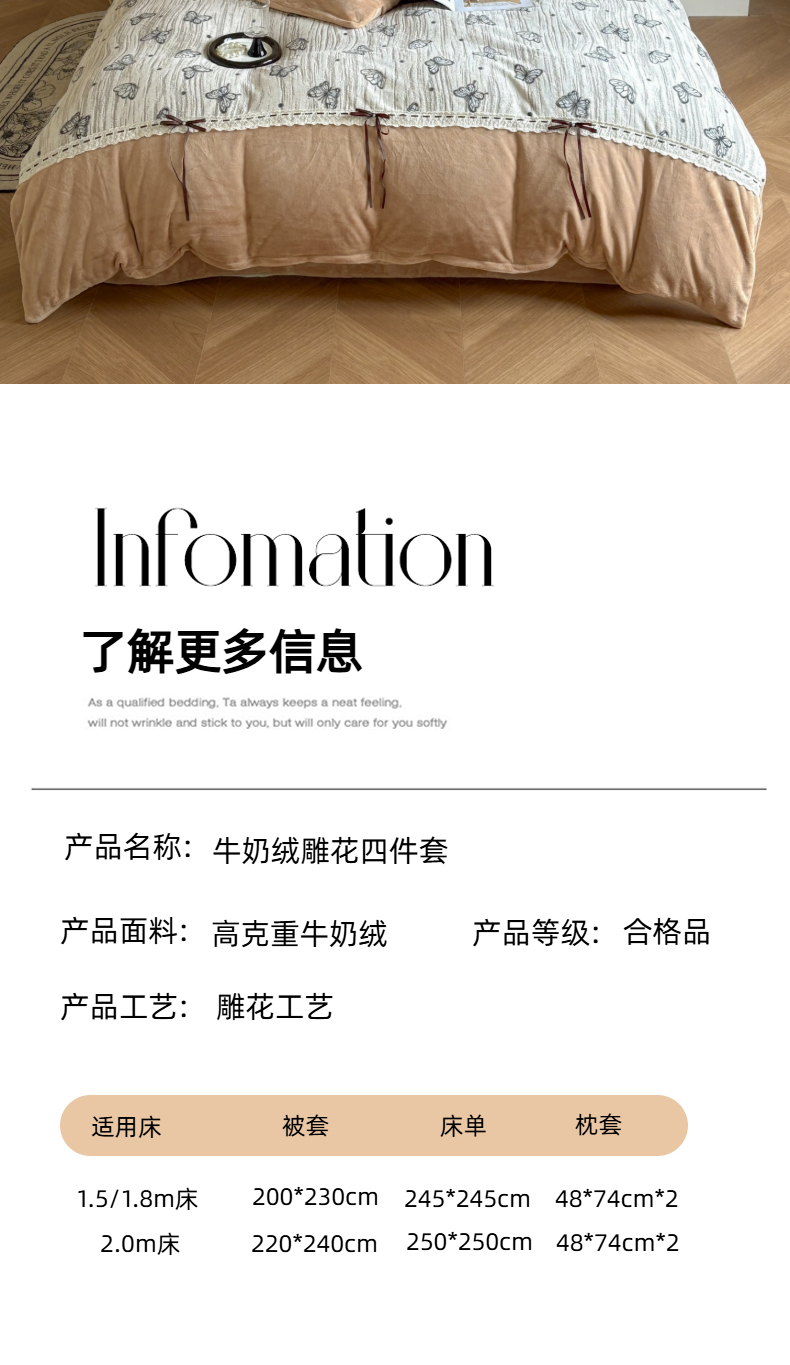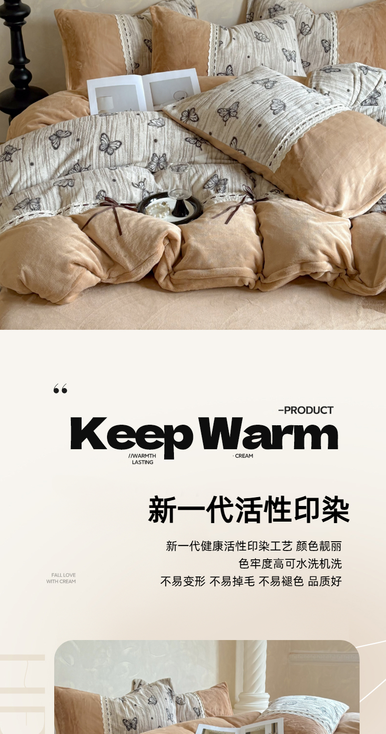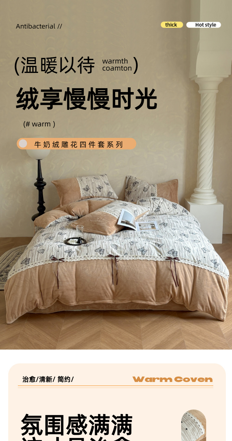 当前位置: 91家纺网 > 商品网购 > 床品套件 > 四件套 > 牛奶绒四件套 > 昊川家纺 2025新款牛奶绒雕花绒轻奢花边蝴蝶结拼接款四件套 福蝶-咖