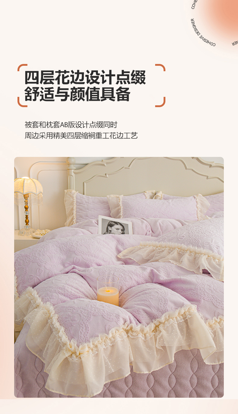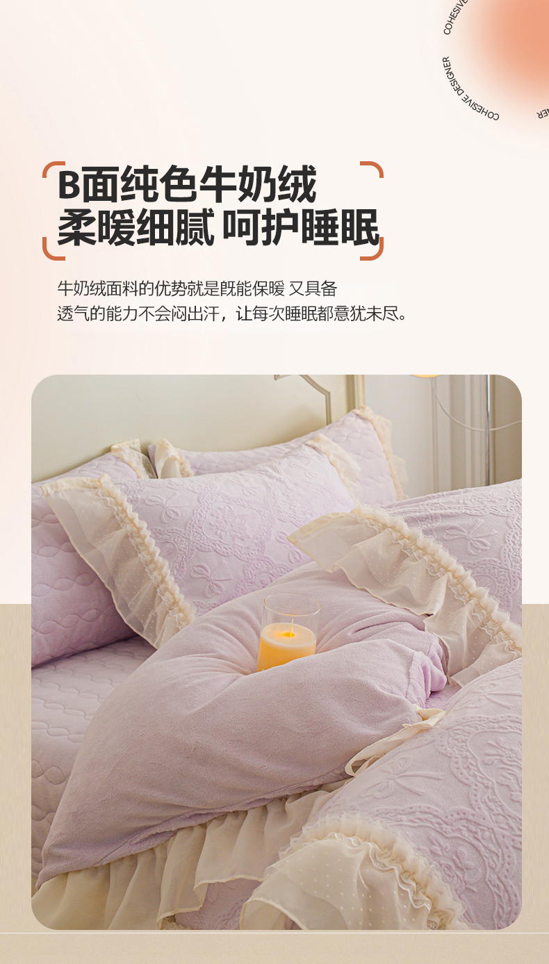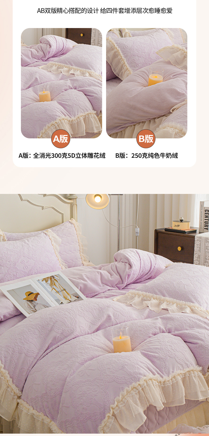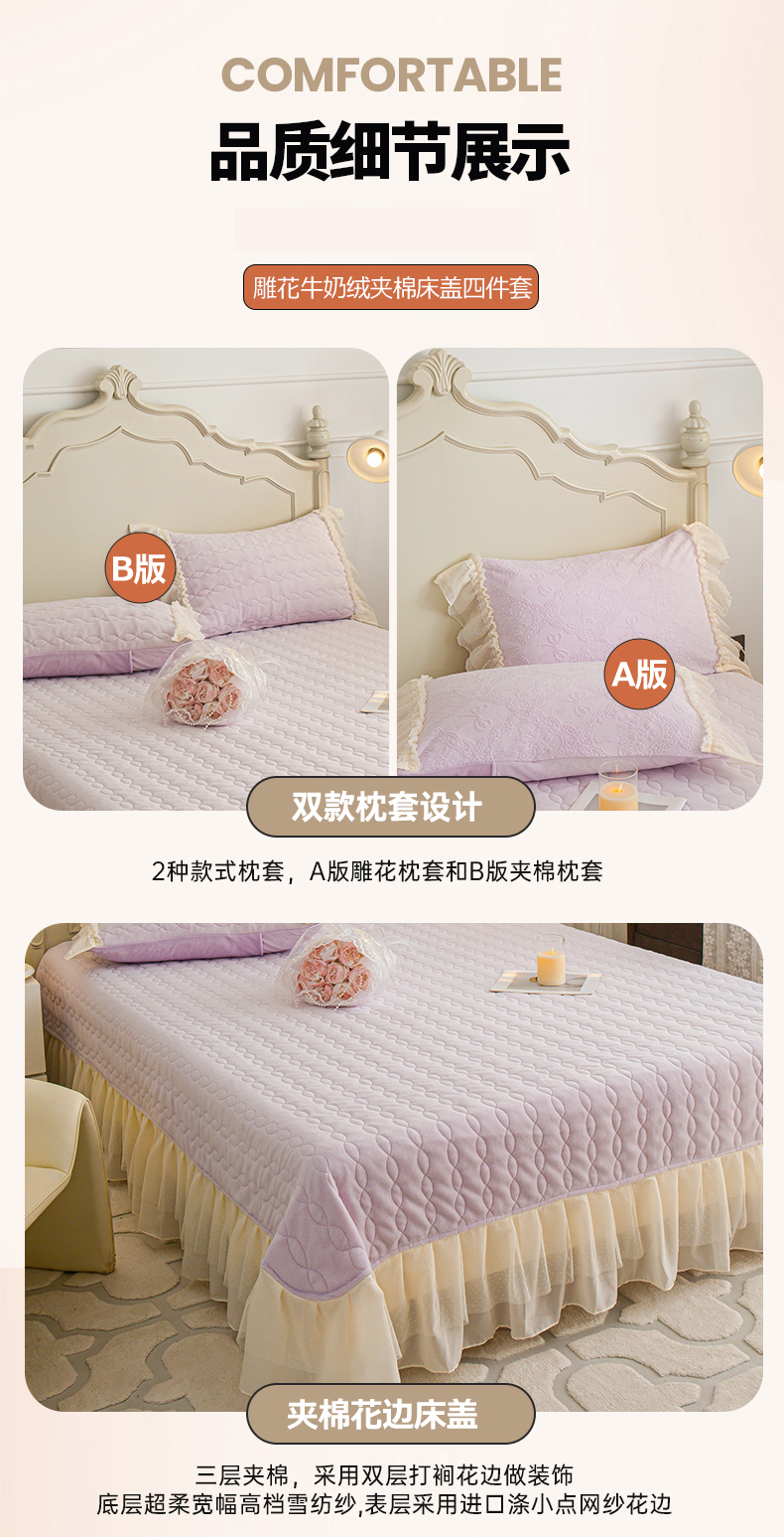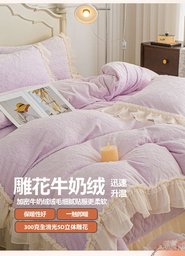 当前位置: 91家纺网 > 商品网购 > 床品套件 > 四件套 > 牛奶绒四件套 > 胜权家纺 2025秋冬新款A类全消光高克重5D雕花牛奶绒仙女风夹棉床盖四件套系列 梦安娜-靓紫