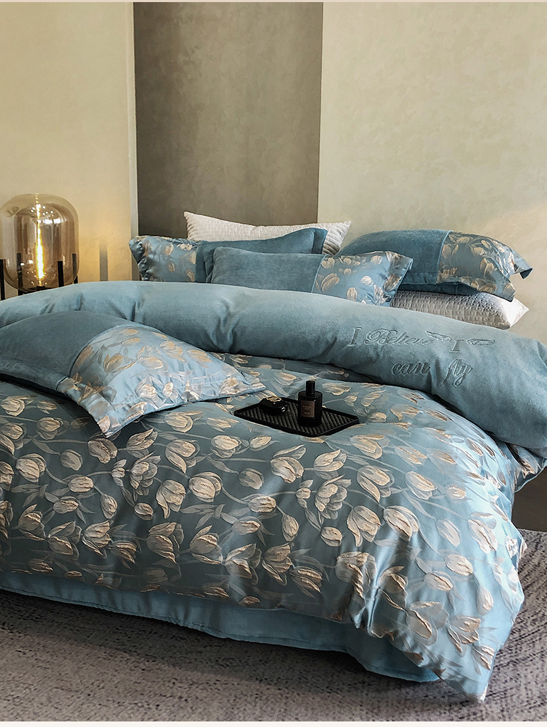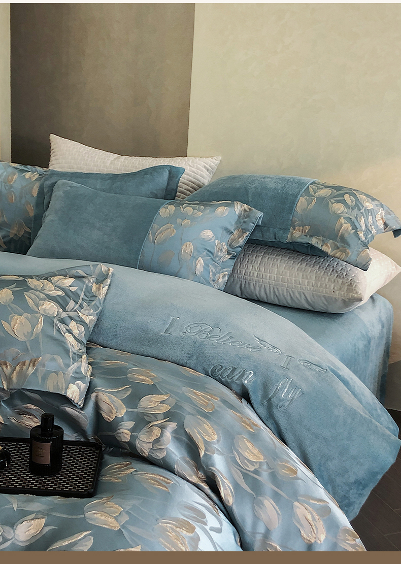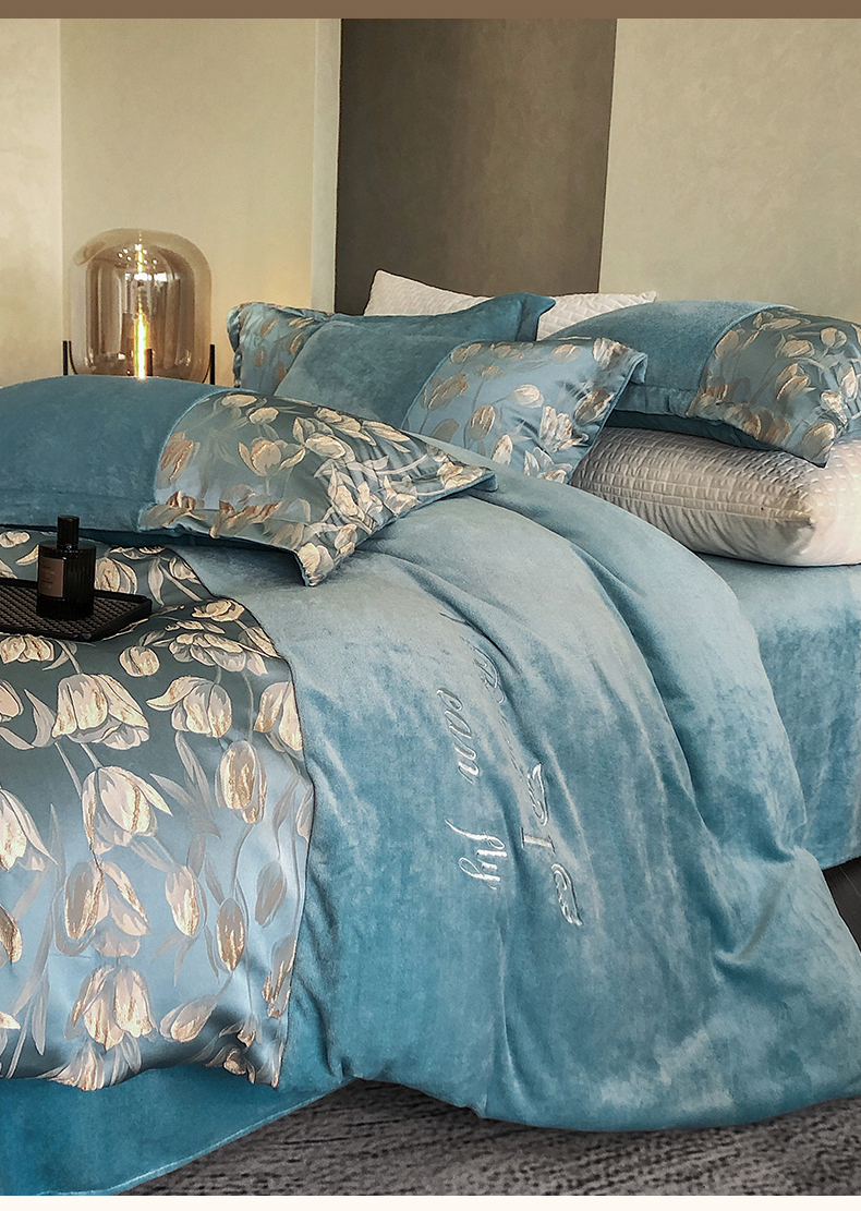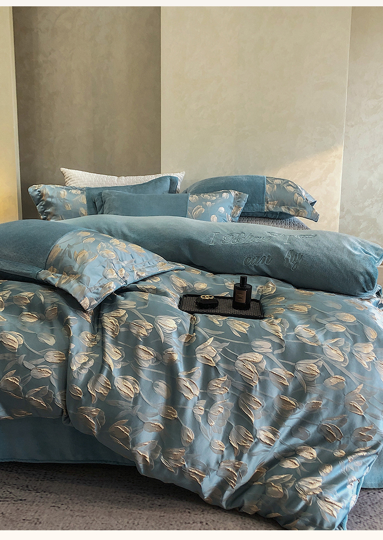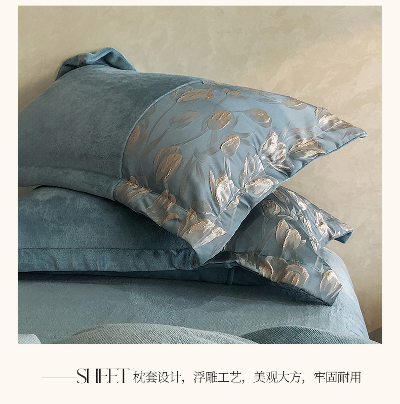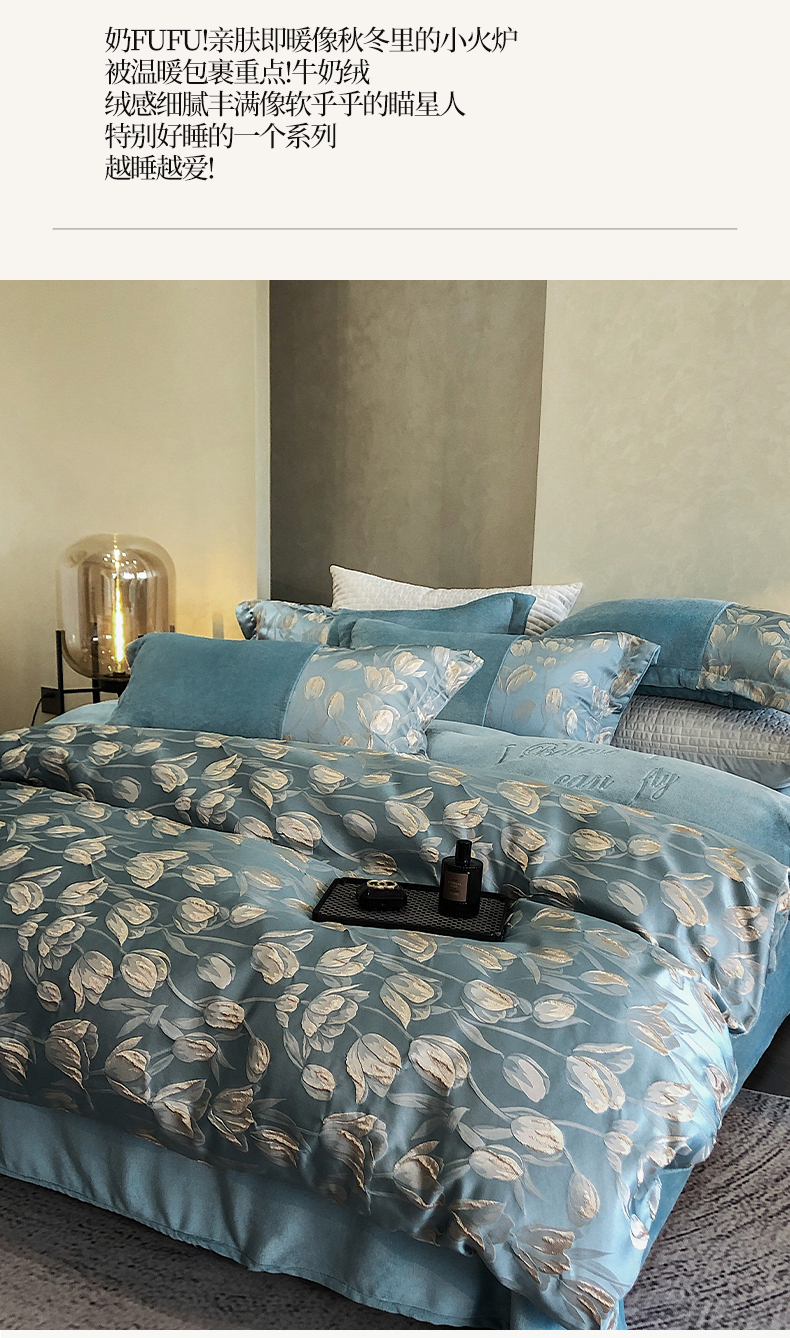 商品名称:换种生活 2025新款A类浮雕牛奶绒刺绣四件套 郁金香-冰蓝