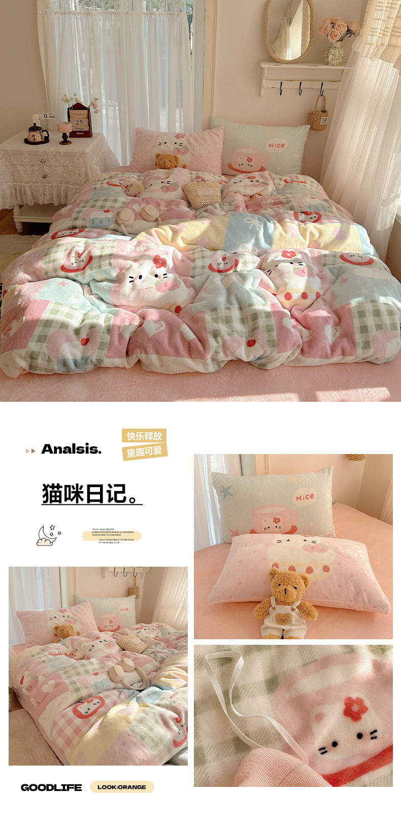 美乐迪家纺 2025秋冬新款牛奶绒四件套 猫咪日记