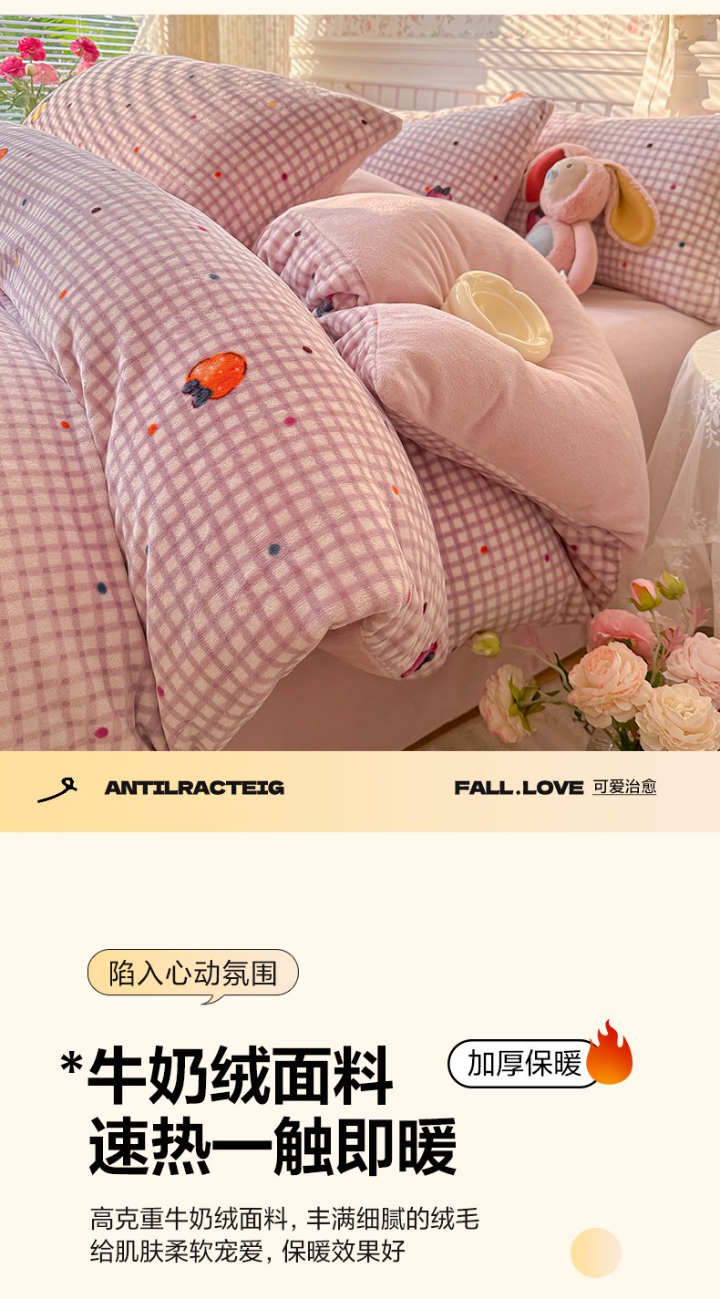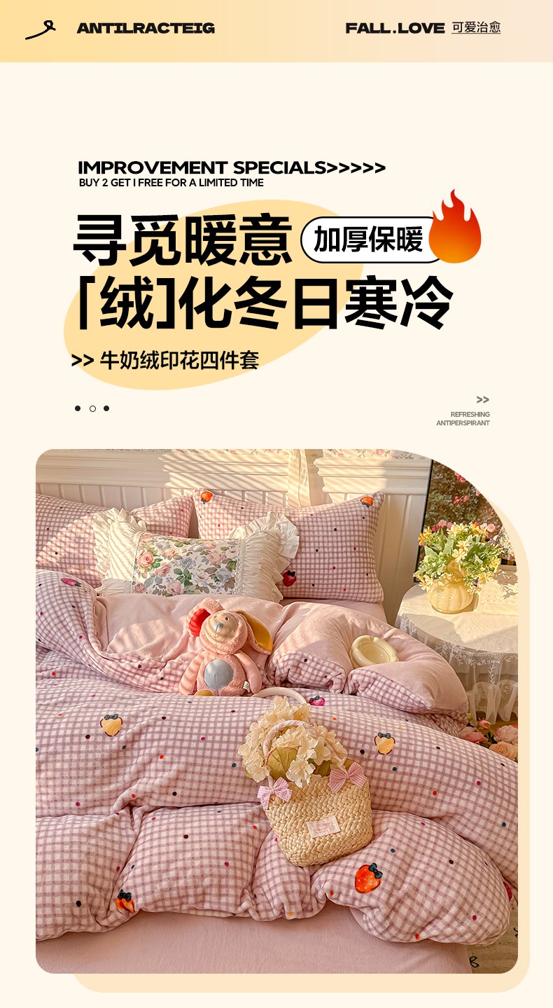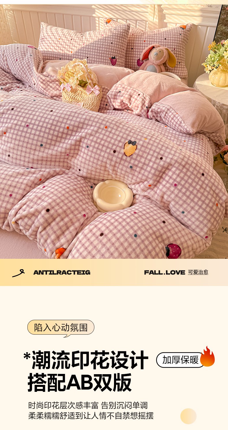 当前位置: 91家纺网 > 商品网购 > 床品套件 > 四件套 > 牛奶绒四件套 > 韩巢家纺 2025新款高克重印花牛奶绒床品四件套 彩色草莓