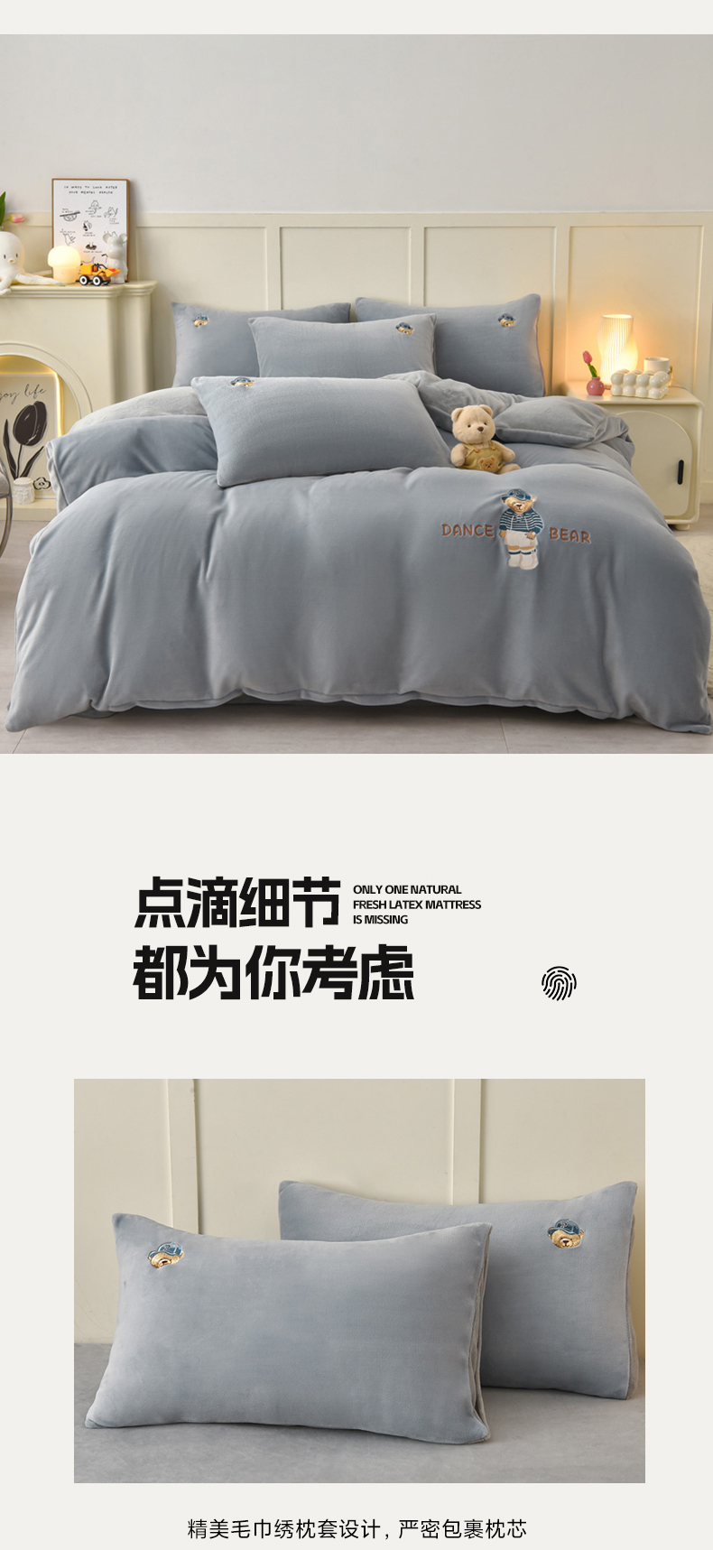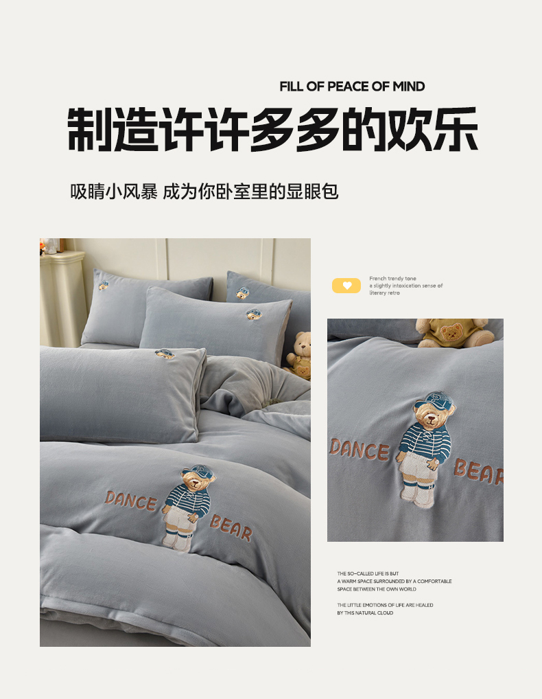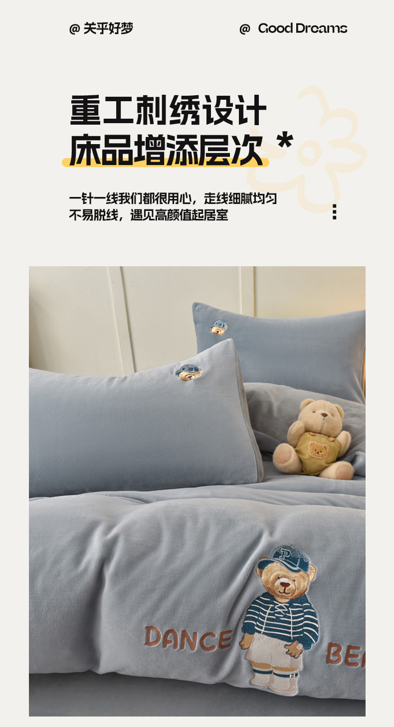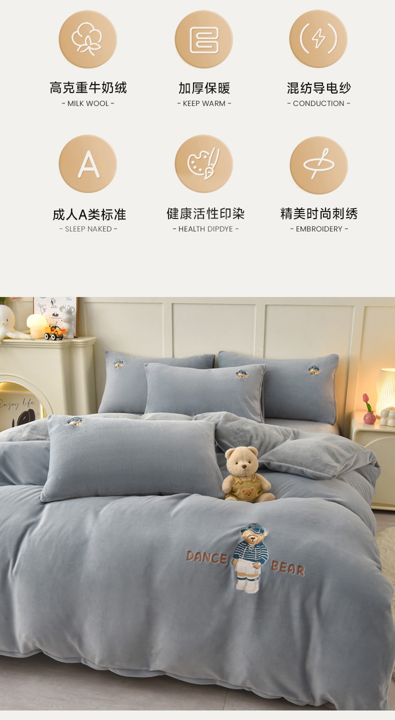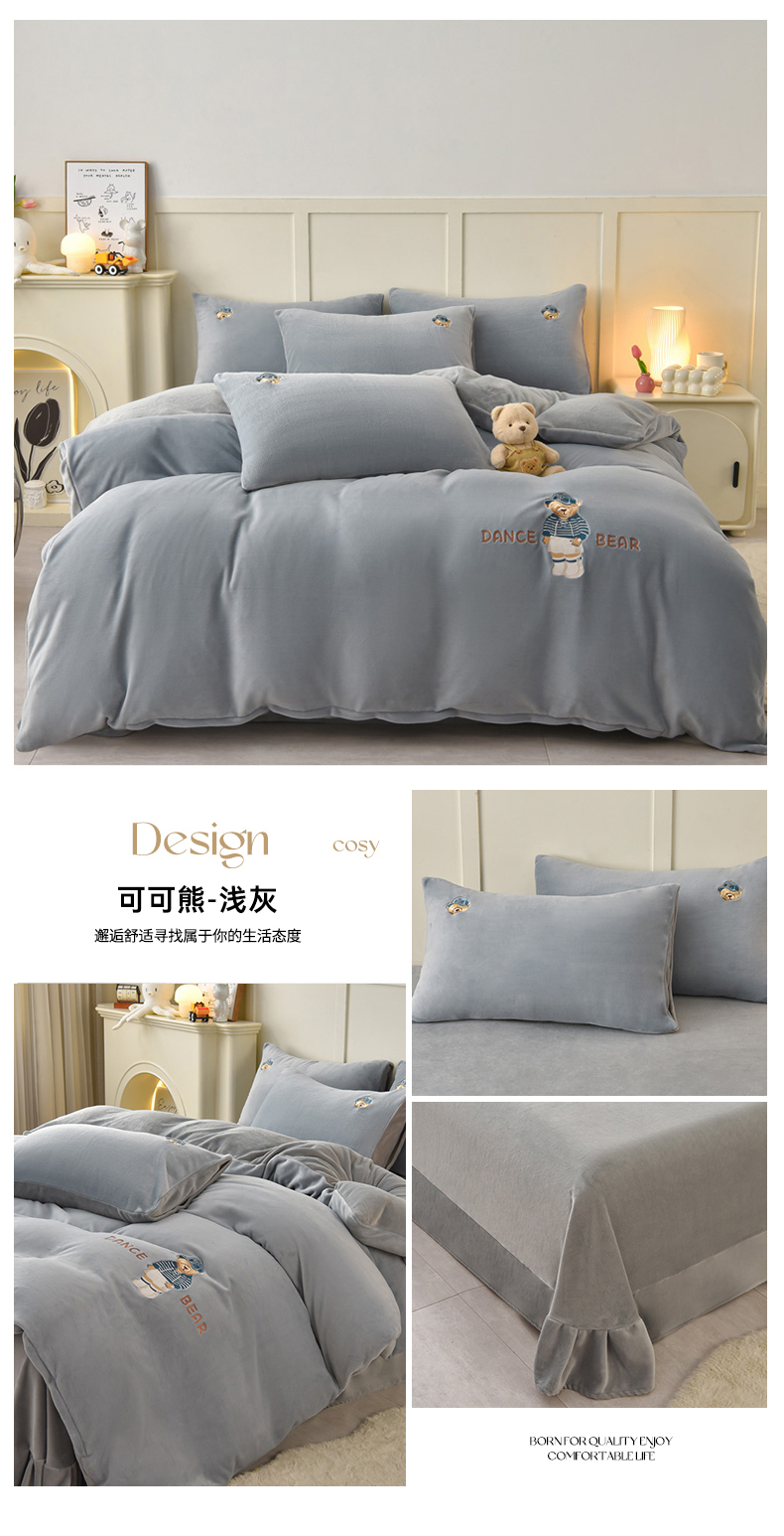 商品名称:牵依 2025新款高克重绣花牛奶绒四件套 可可熊-浅灰