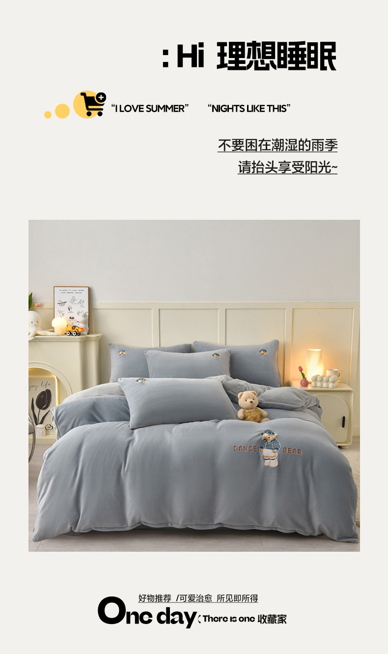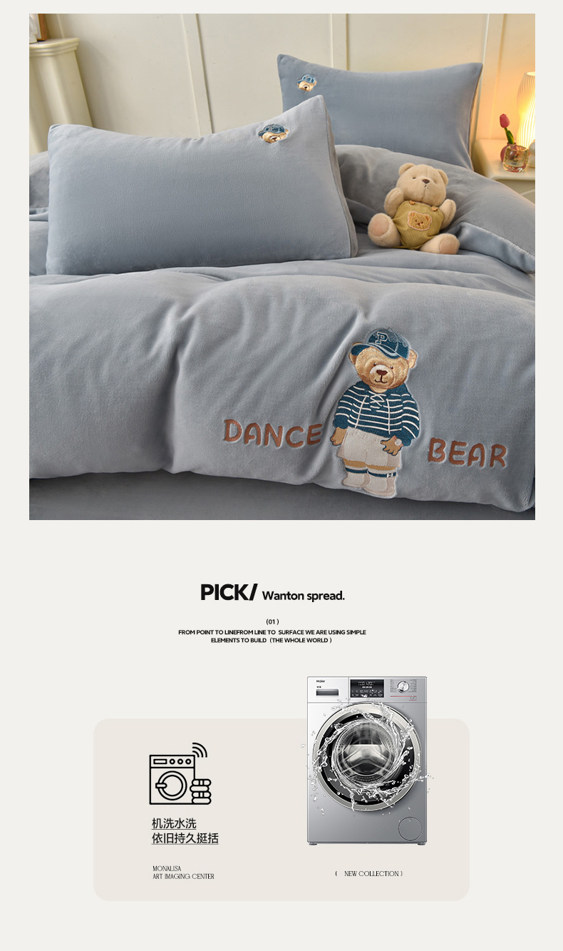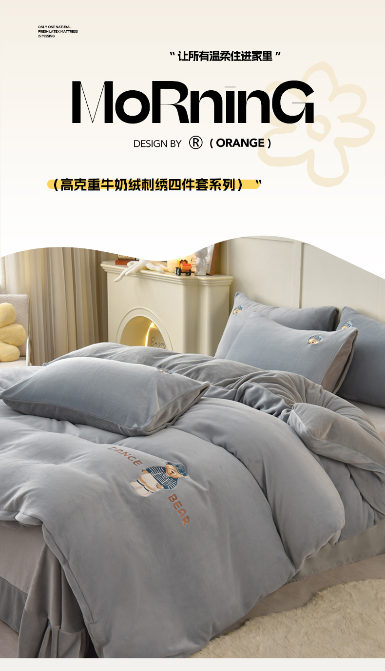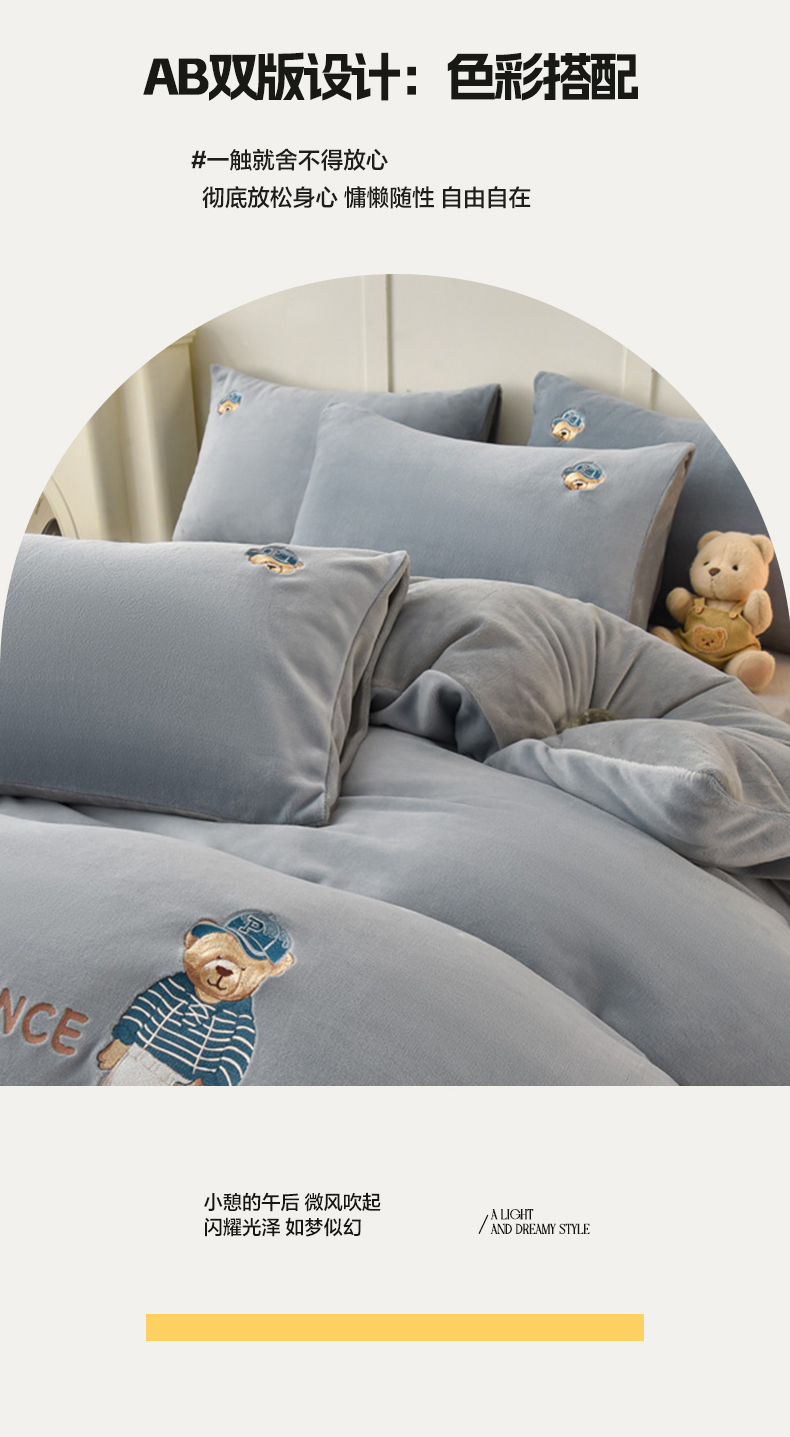 商品名称:牵依 2025新款高克重绣花牛奶绒四件套 可可熊-浅灰