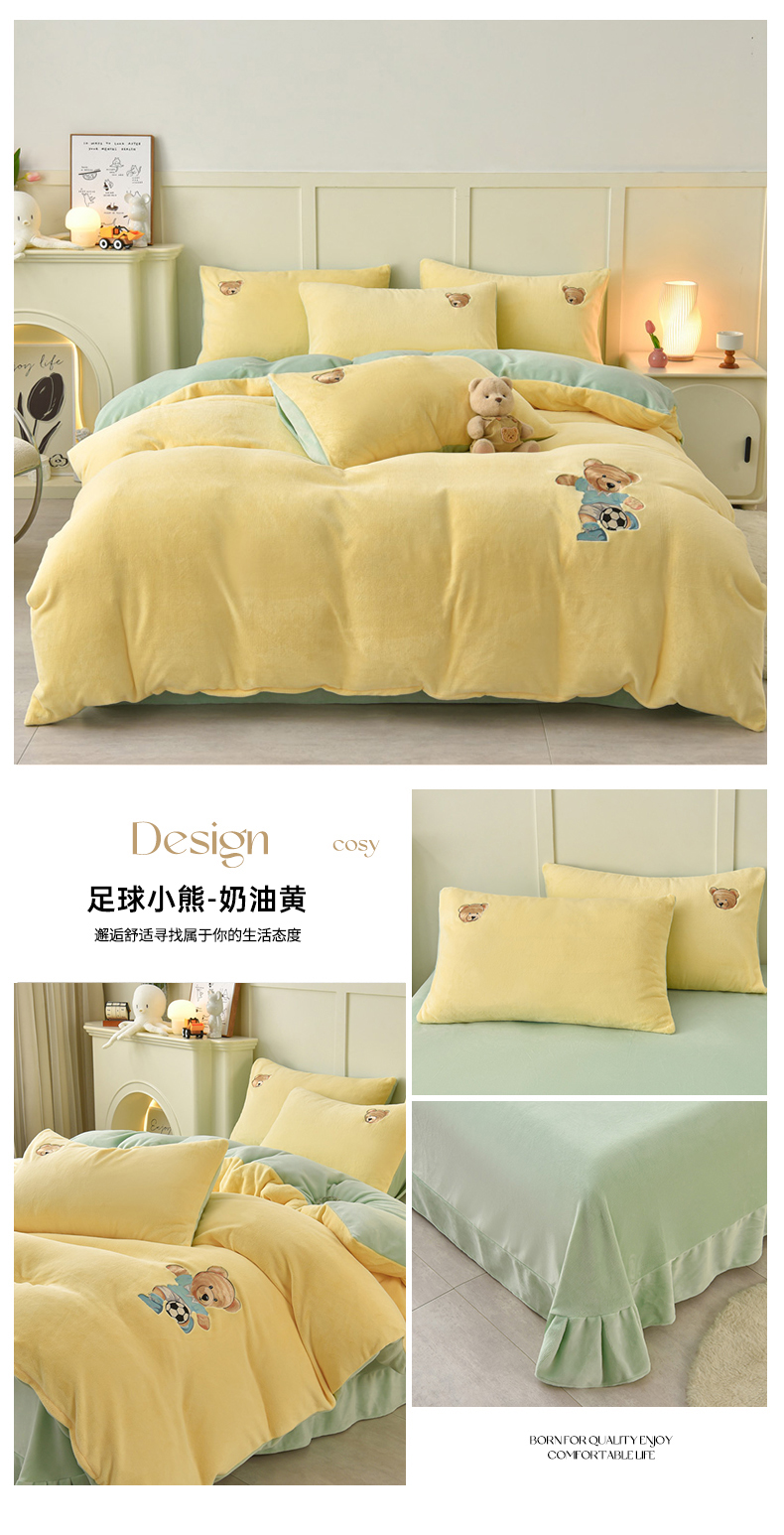 (总)牵依 2025新款高克重绣花牛奶绒四件套,可可熊-宾利蓝,足球小熊-奶油黄,苏姑娘-奶咖,足球小熊-果绿,苏姑娘-浅紫,可可熊-浅灰,可可熊-奶咖