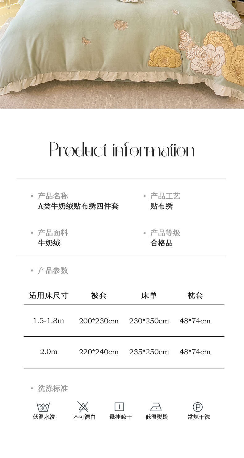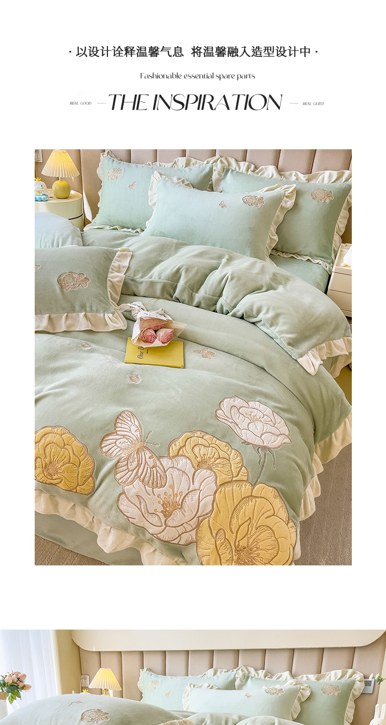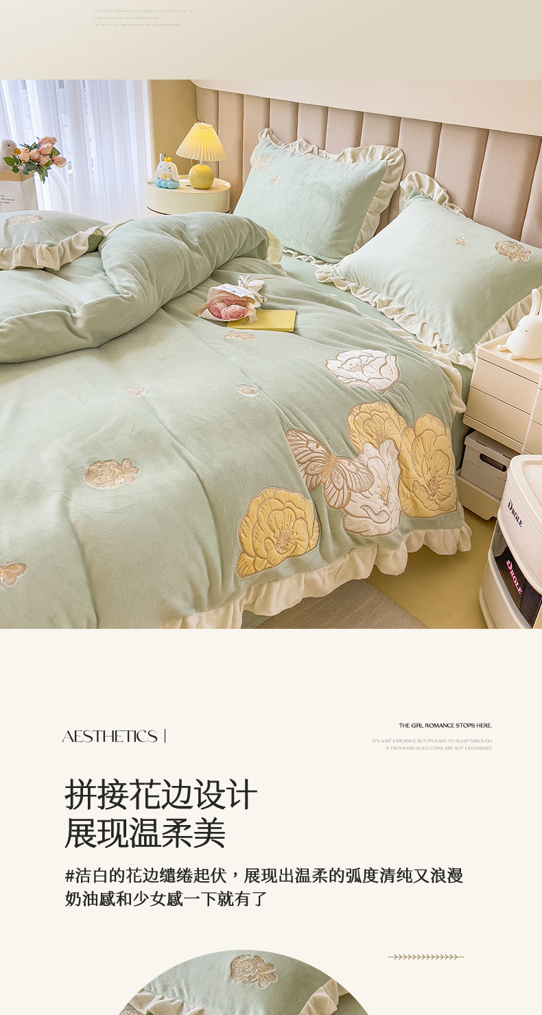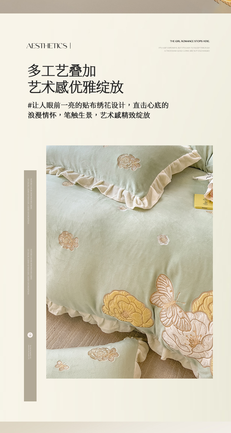 商品名称:曲之慕 2025新款韩版牛奶绒花朵贴布绣四件套 花韵-抹茶绿