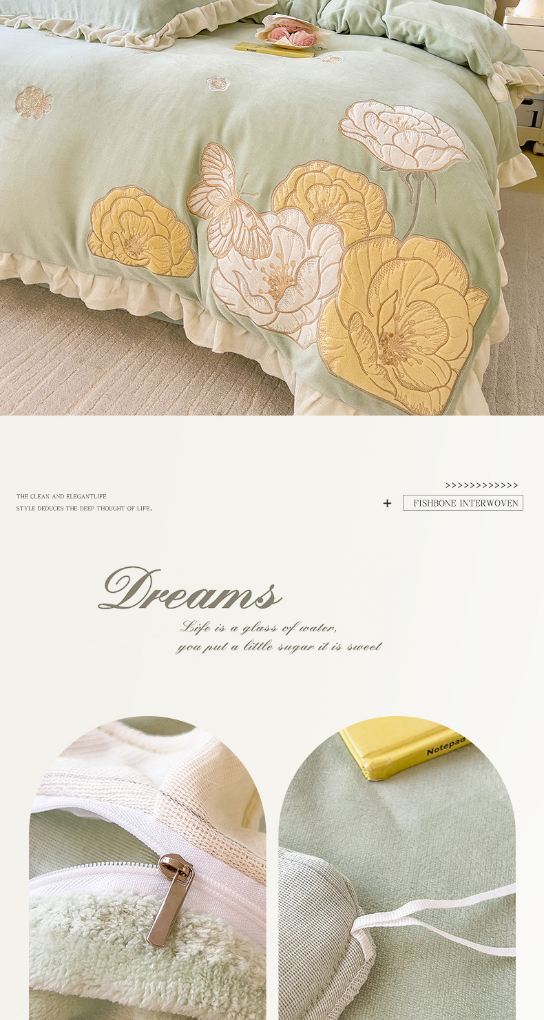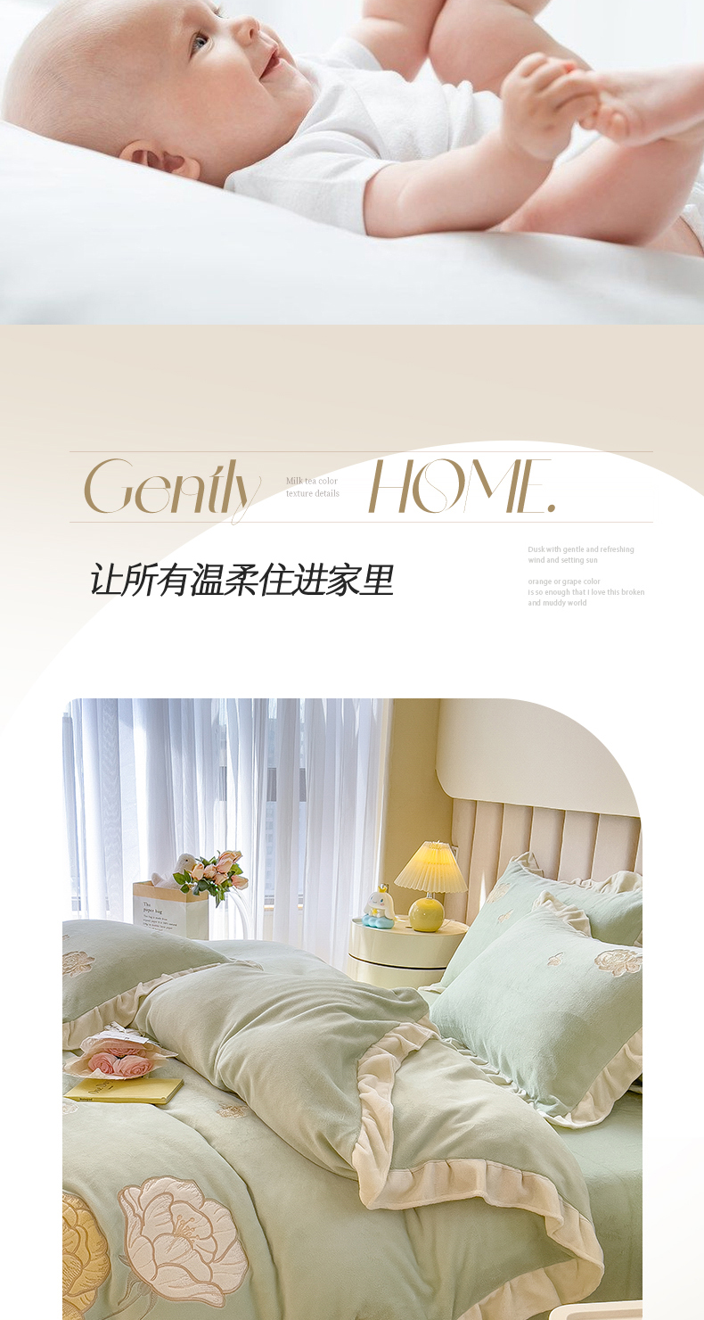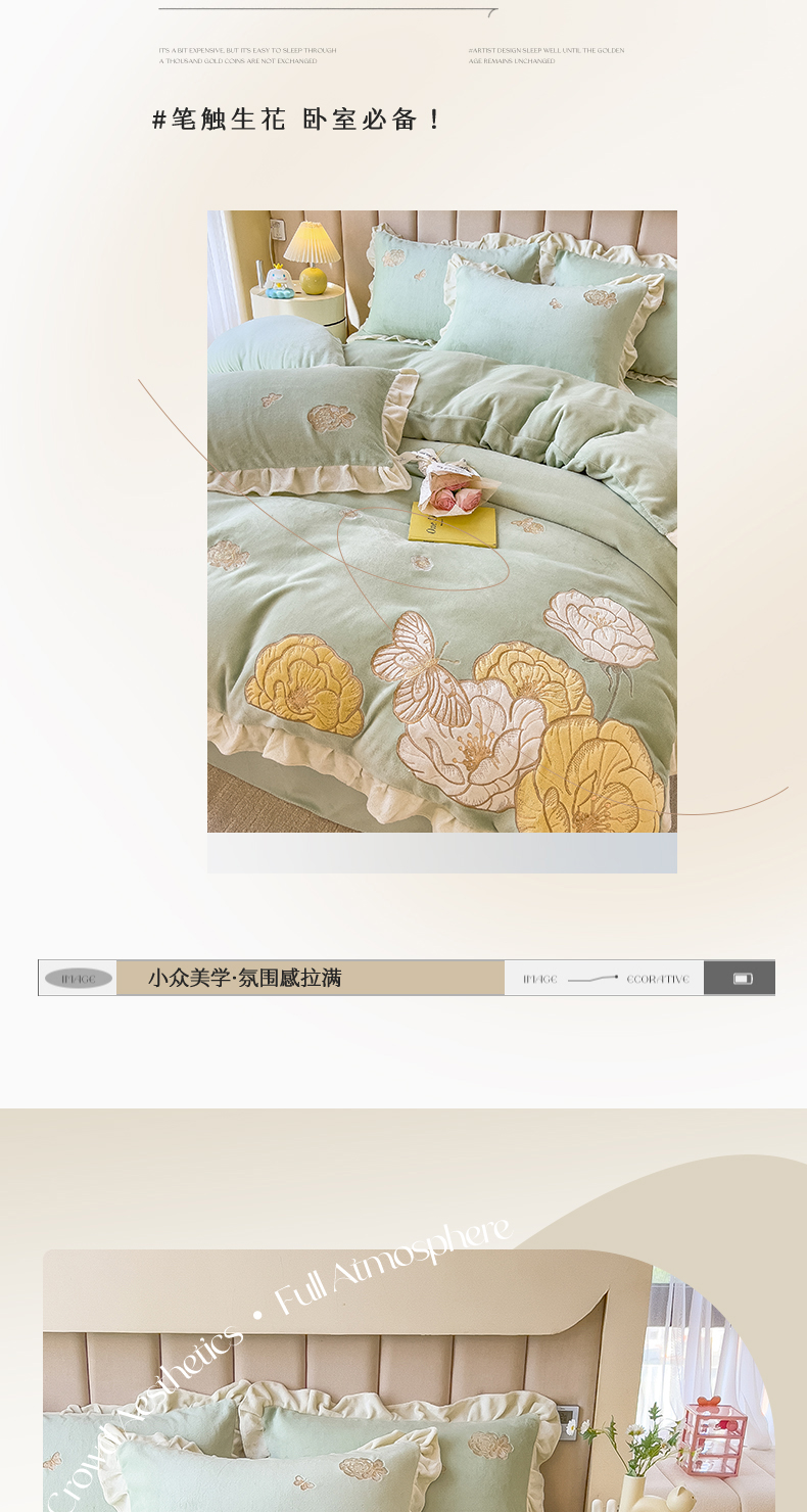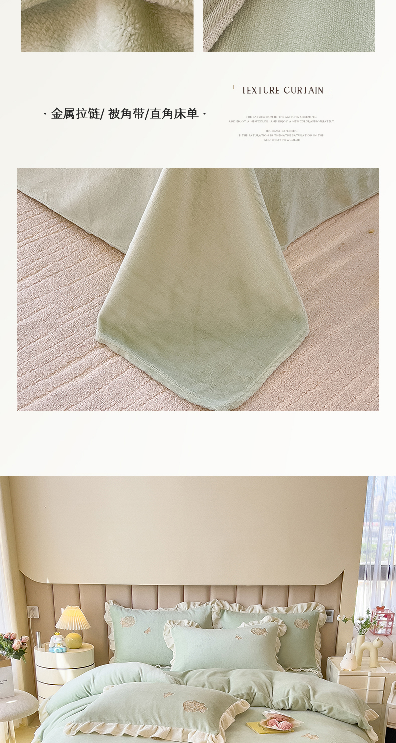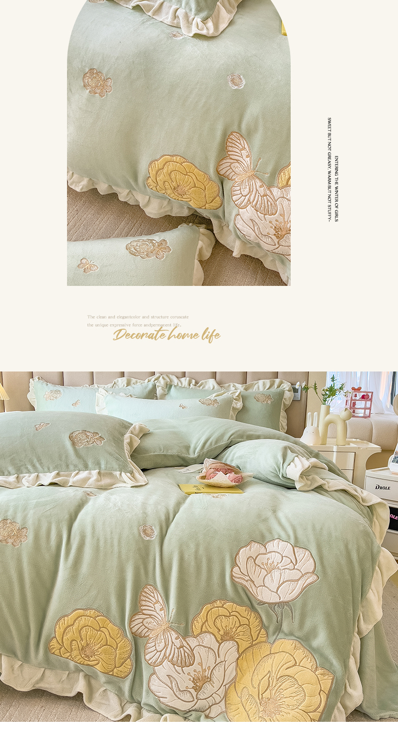 商品名称:曲之慕 2025新款韩版牛奶绒花朵贴布绣四件套 花韵-抹茶绿