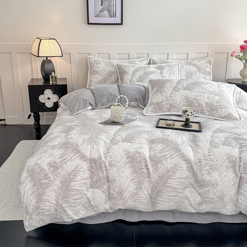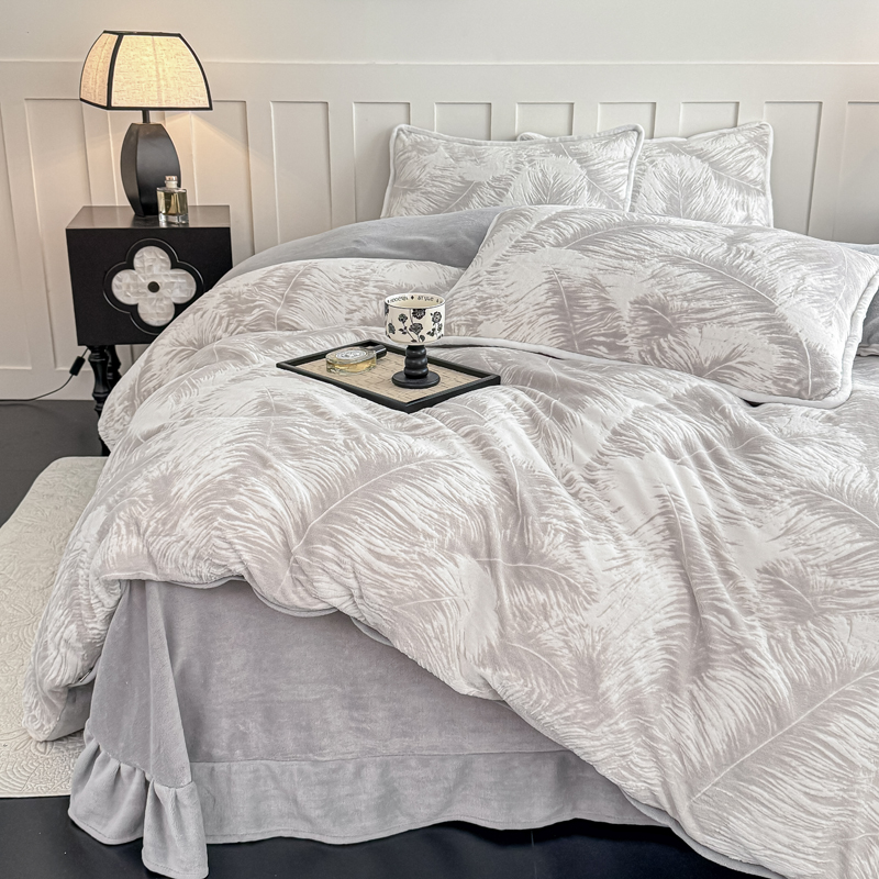 赛丽雅 2025新款包边雕花烂花牛奶绒四件套 大羽毛-灰