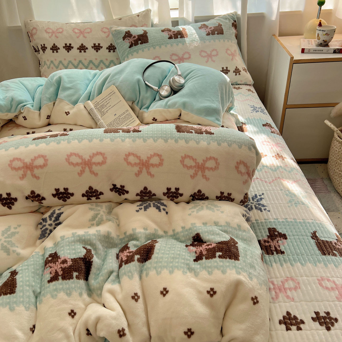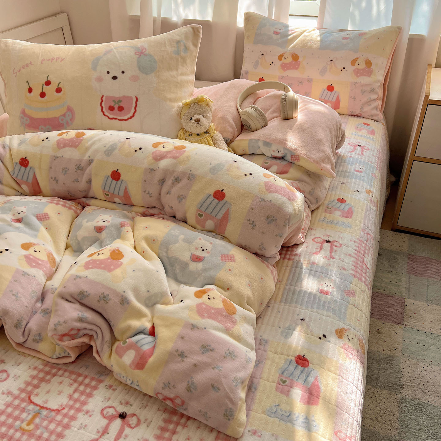 商品名称:桃喜 2025新款A类200g牛奶绒(含导电丝)印花床盖款四件套 房子小狗