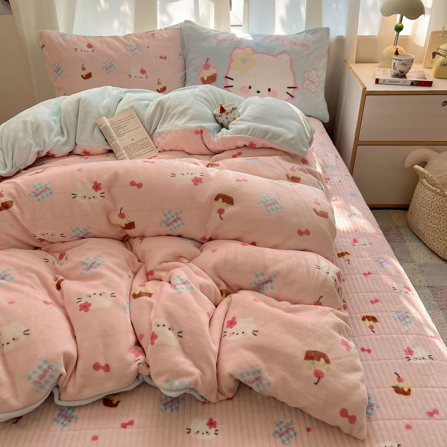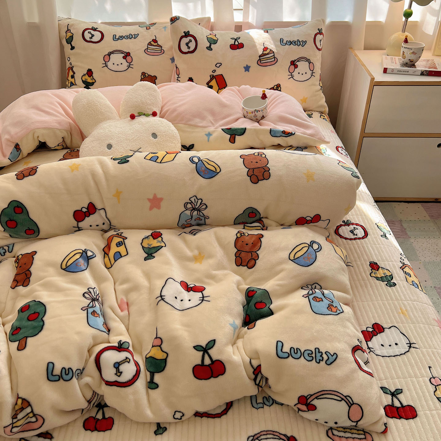 (总)桃喜 2026新款全棉混搭卡通印花学生三件套四件套,费尔岛蝴蝶结小狗,费尔岛小熊,可爱动物团,可爱小兔子,星星猫咪