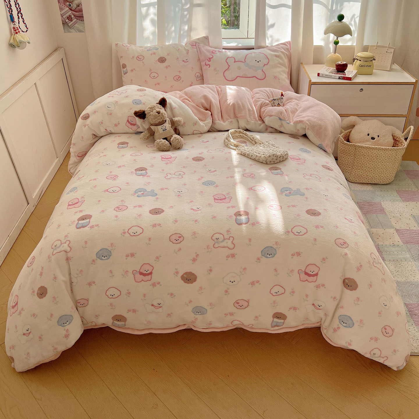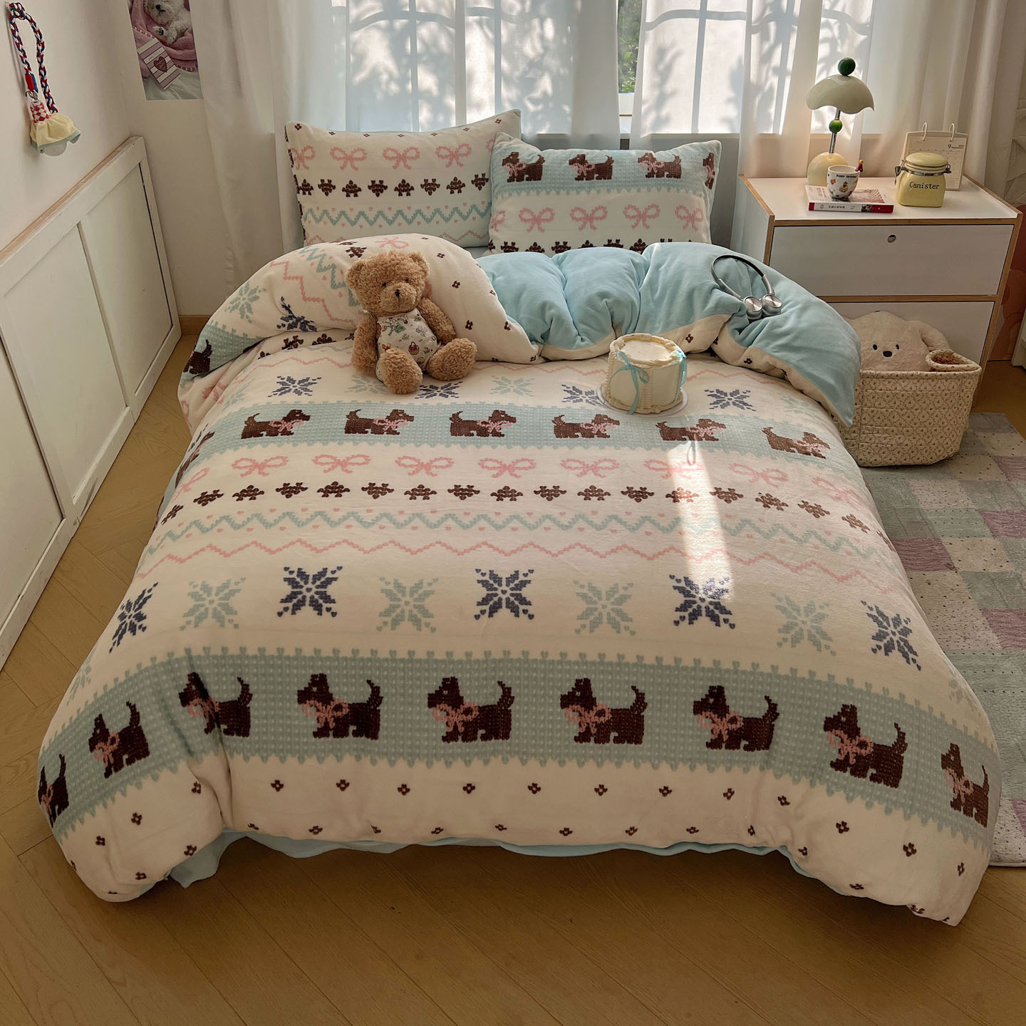 商品名称:桃喜 2025新款A类200g牛奶绒(含导电丝)印花床单款四件套 费尔岛狗狗蓝