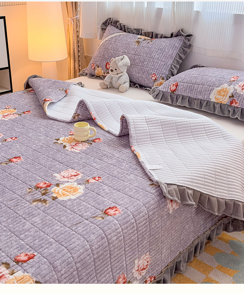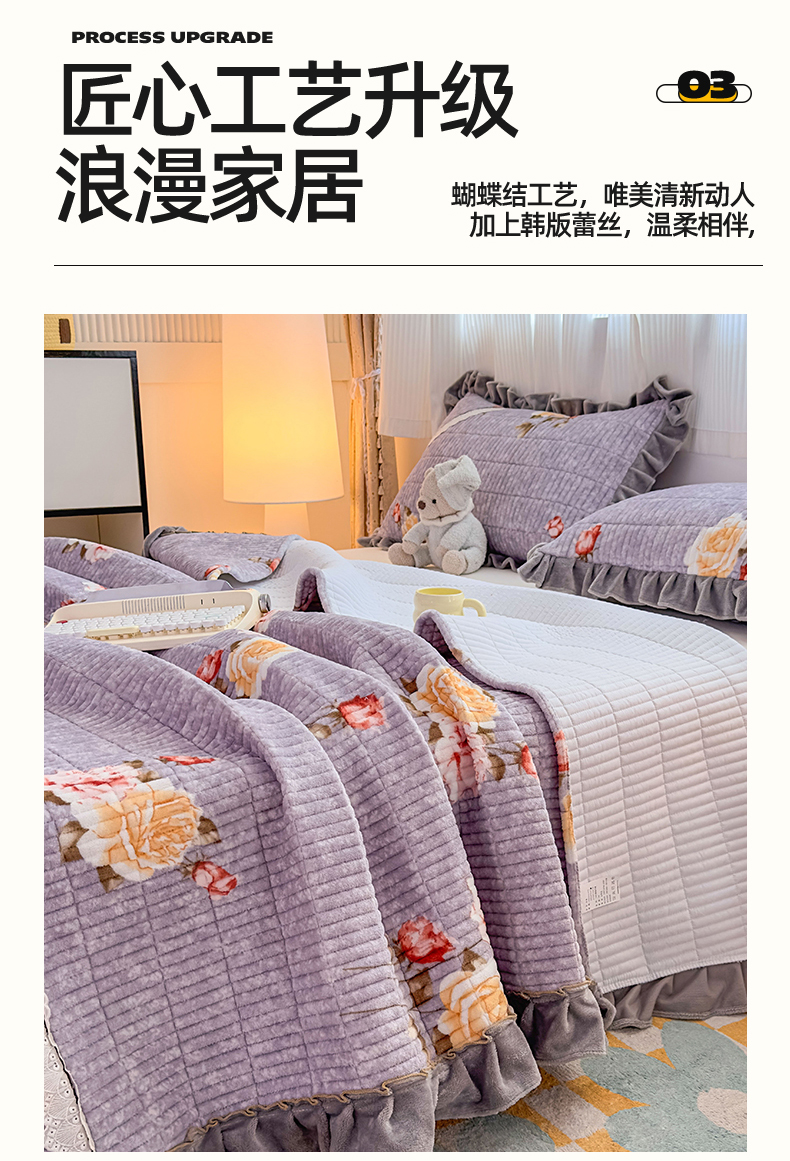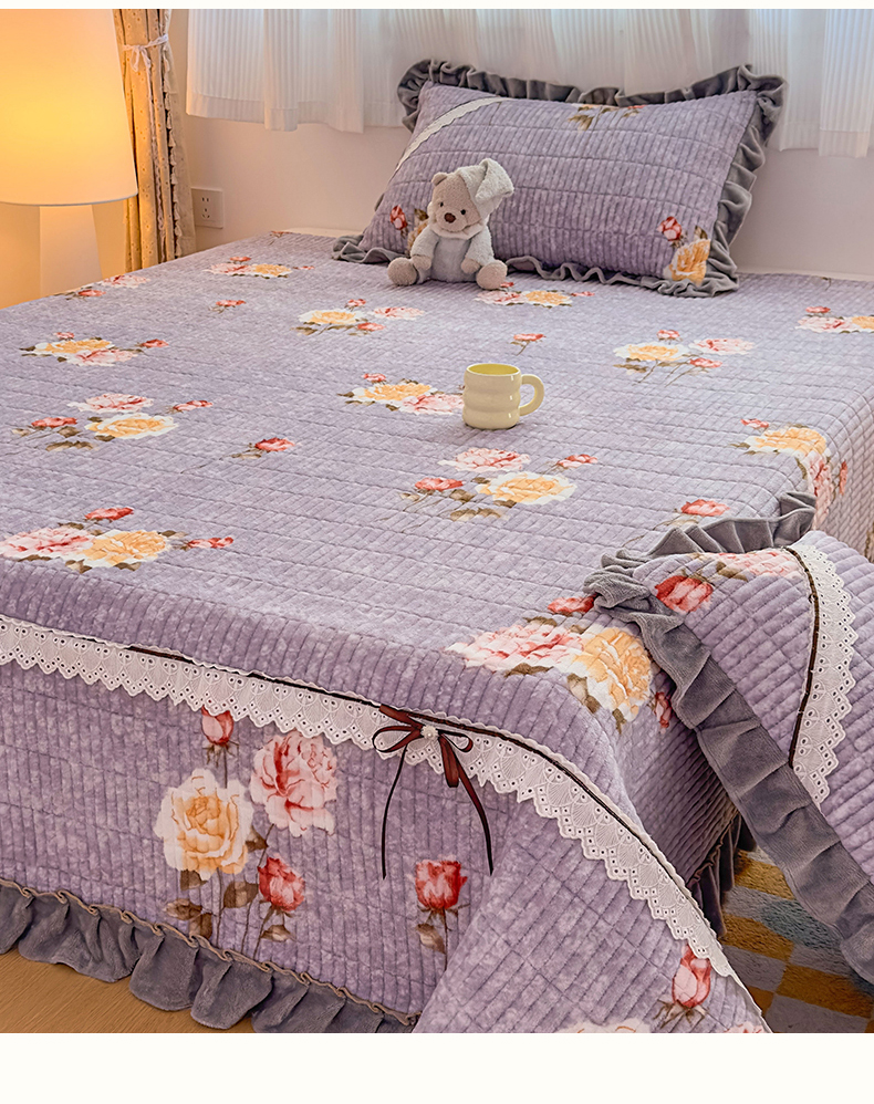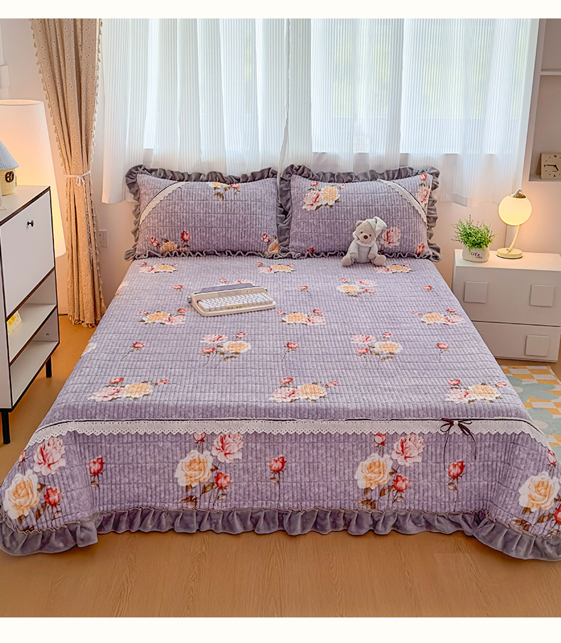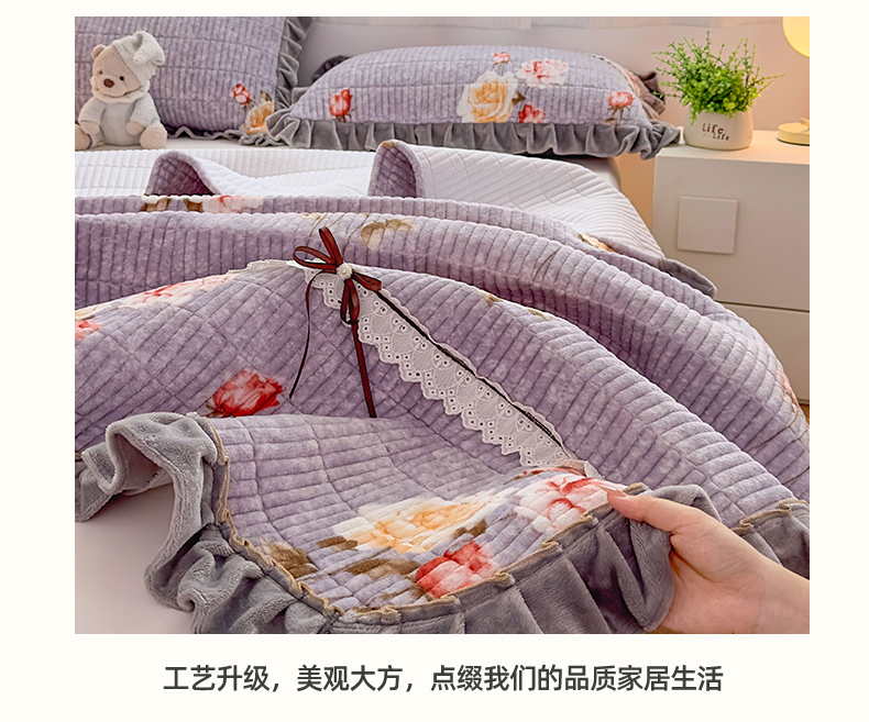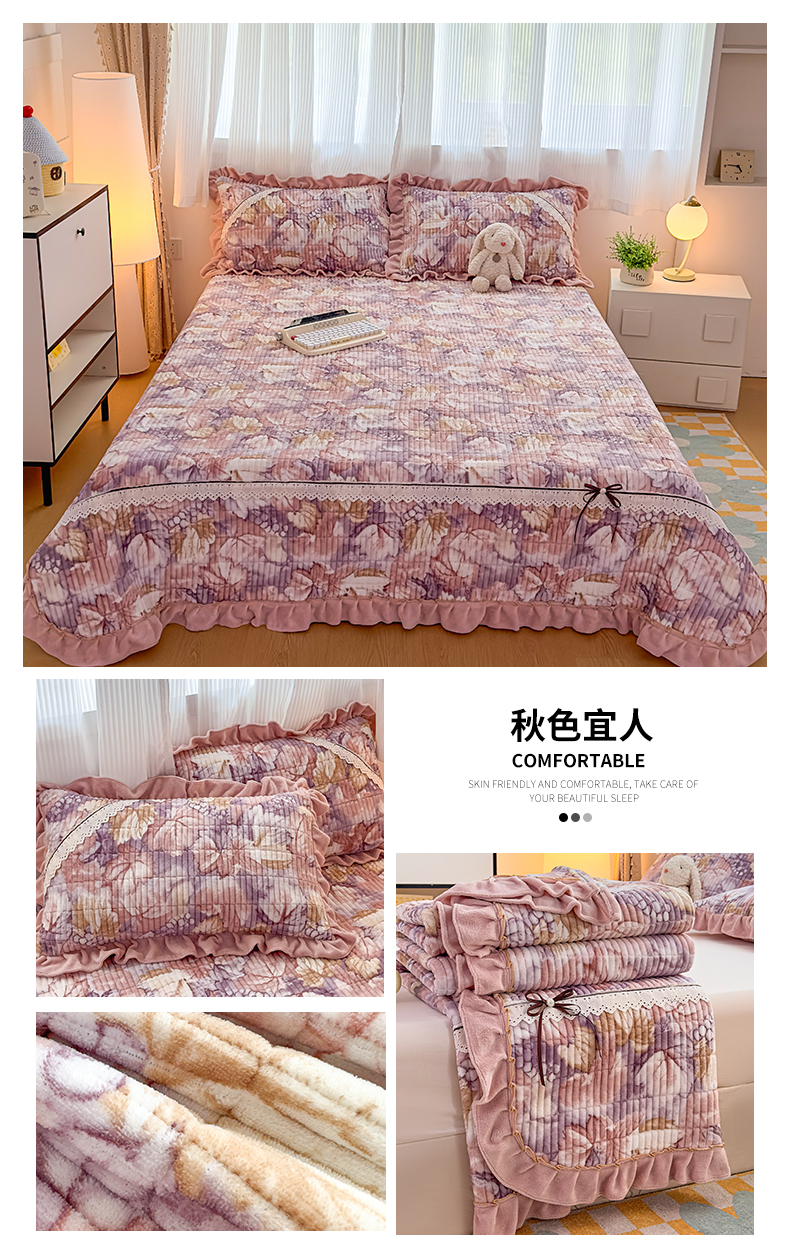 当前位置: 91家纺网 > 商品网购 > 床品套件 > 三件套 > 恒爱家纺 2025新款牛奶绒夹棉花边床盖系列三件套 争奇斗艳-紫