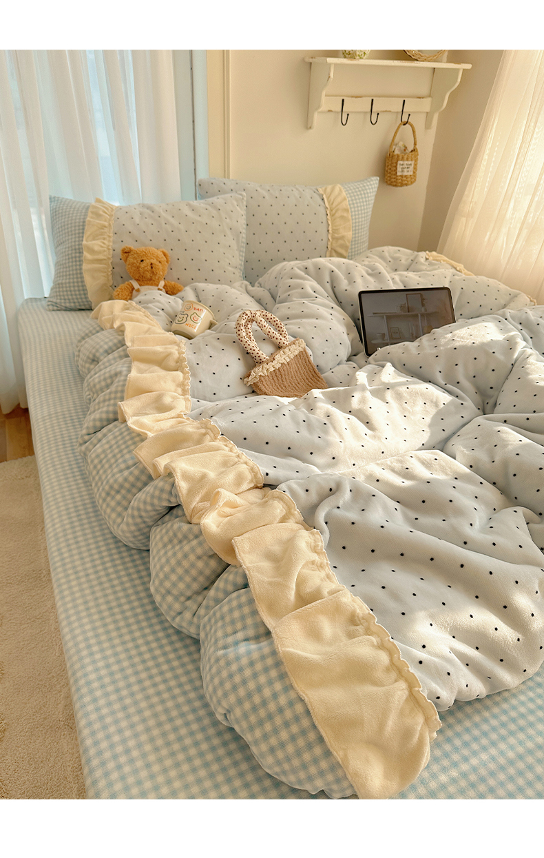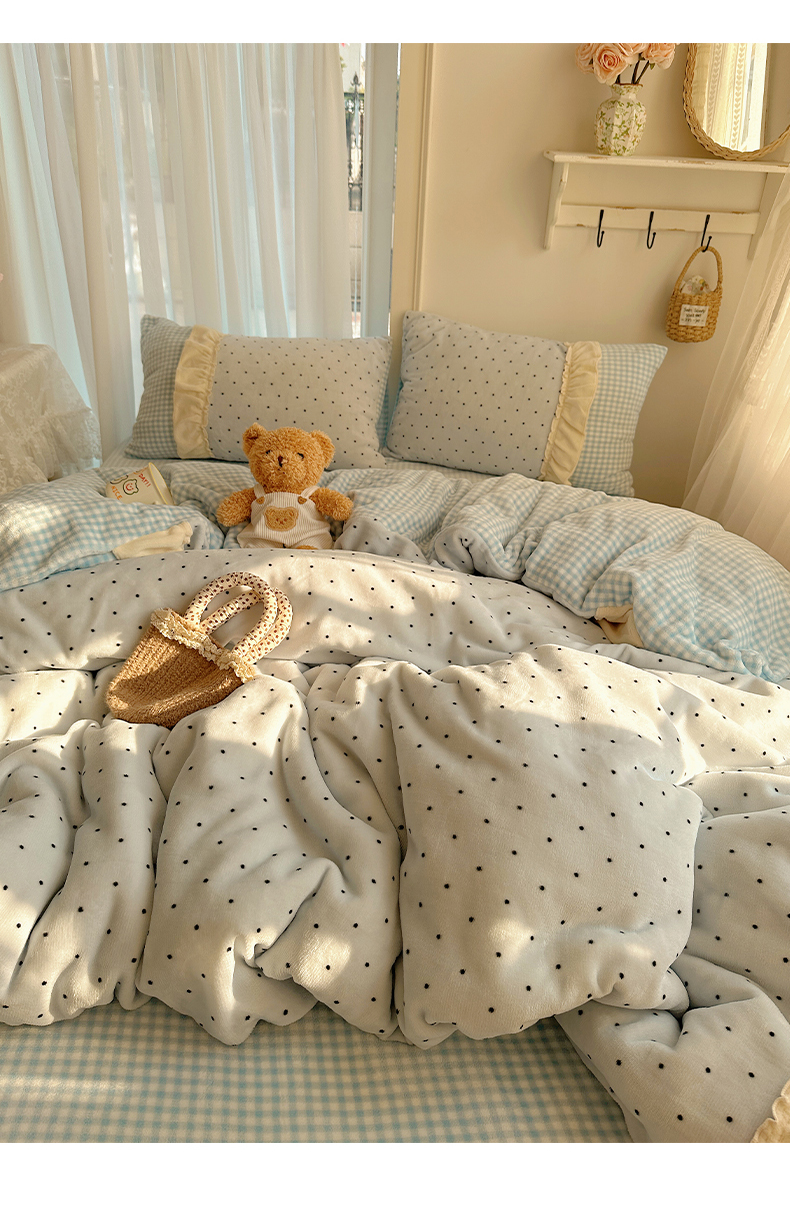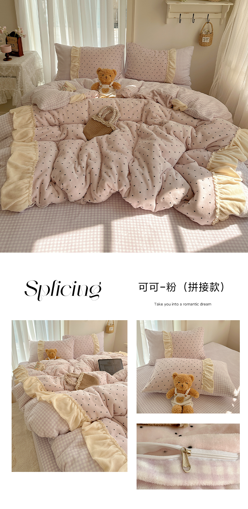 商品名称:瑞莱 2025年秋冬新款波点牛奶绒四件套(拼接款) 可可-蓝(拼接款)