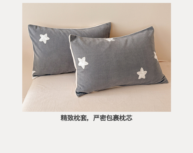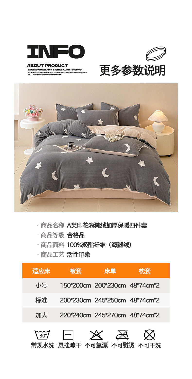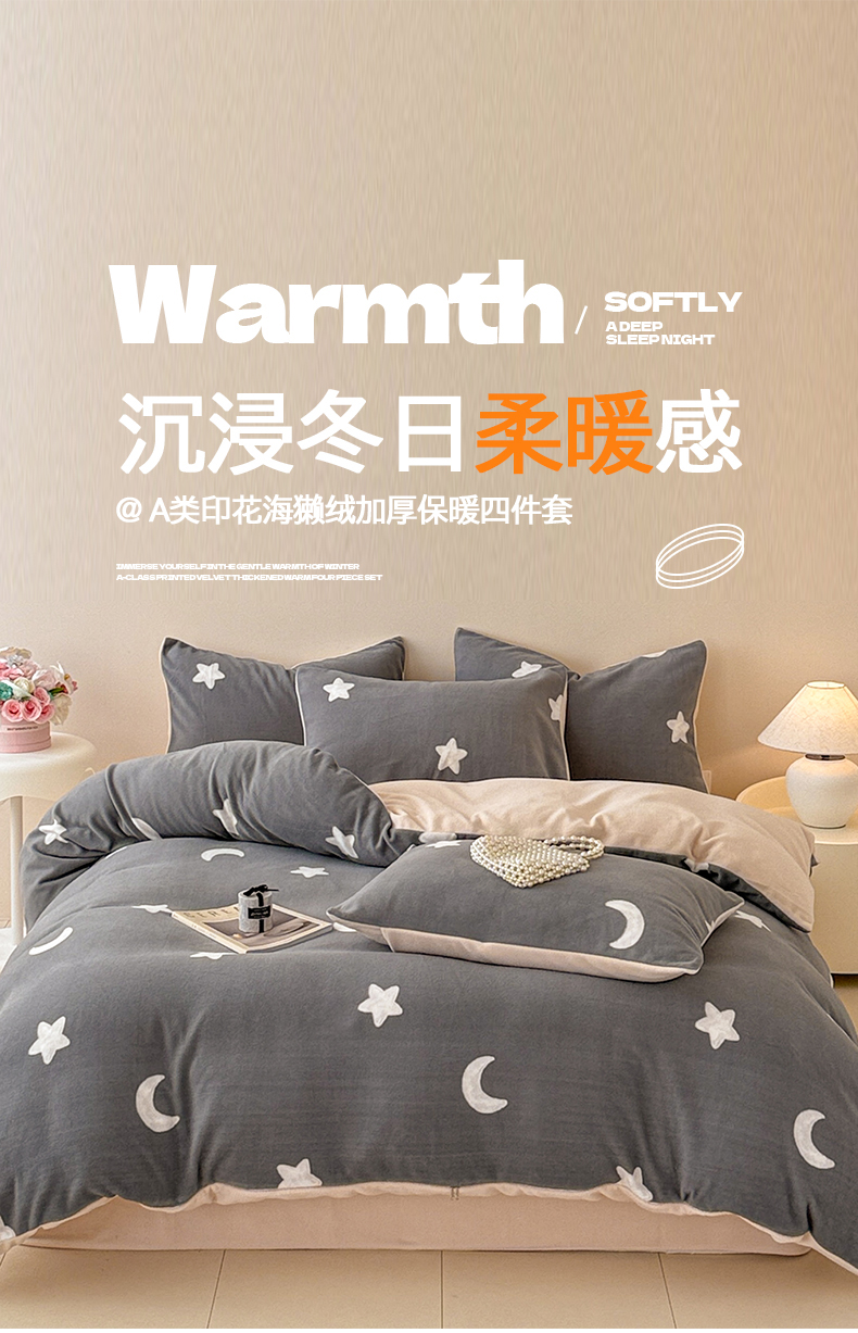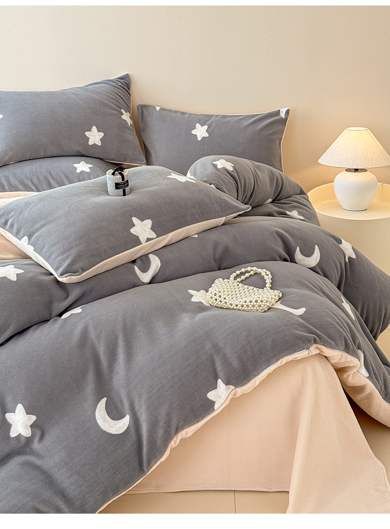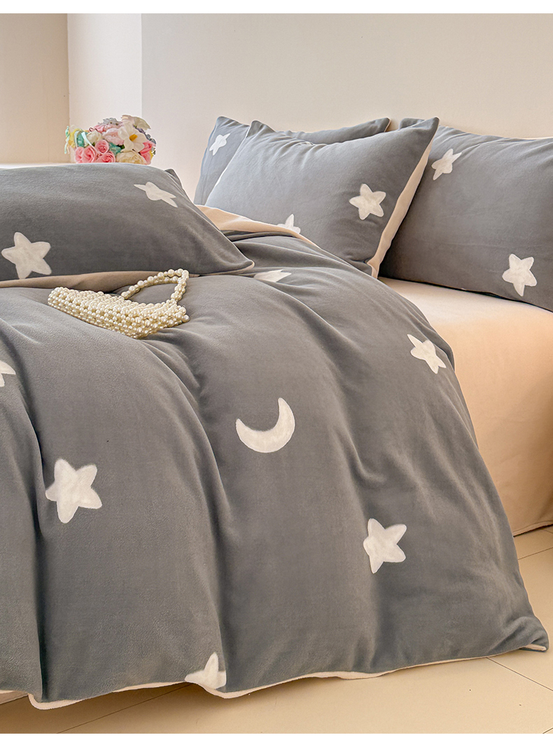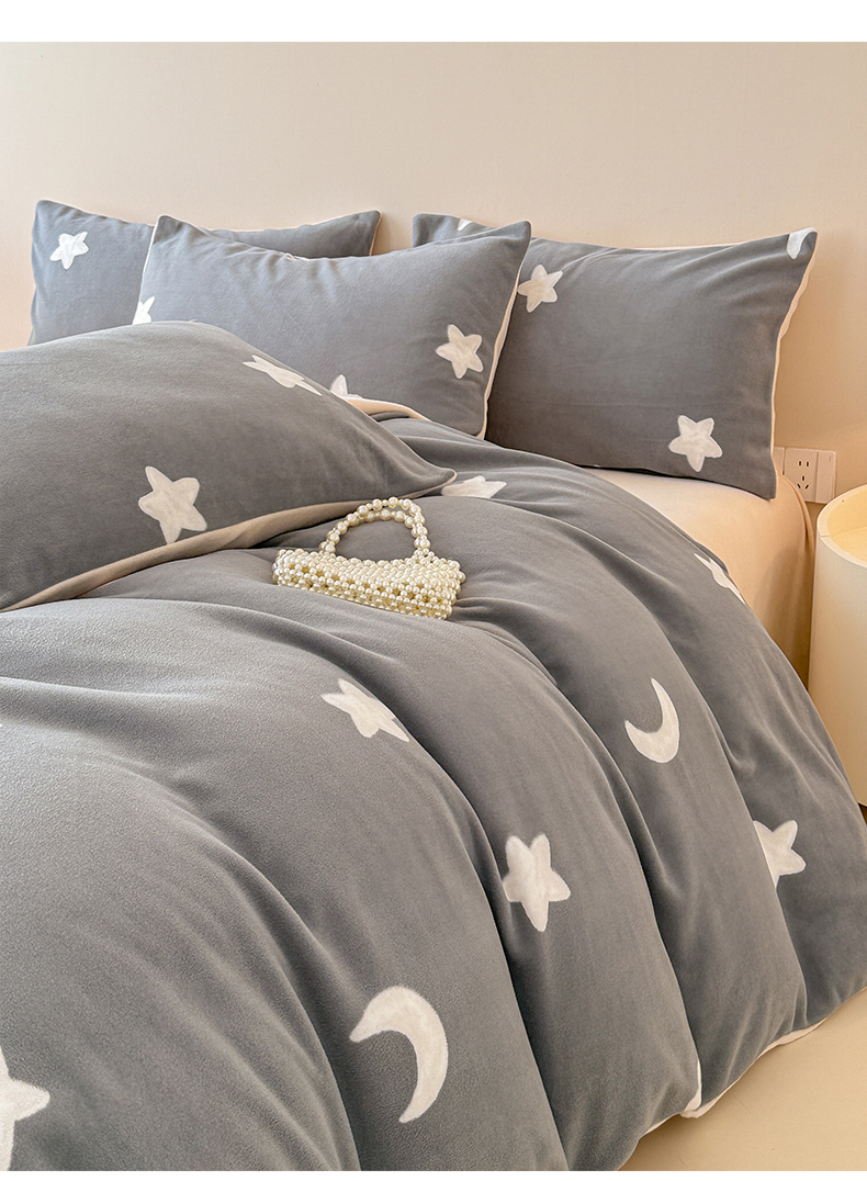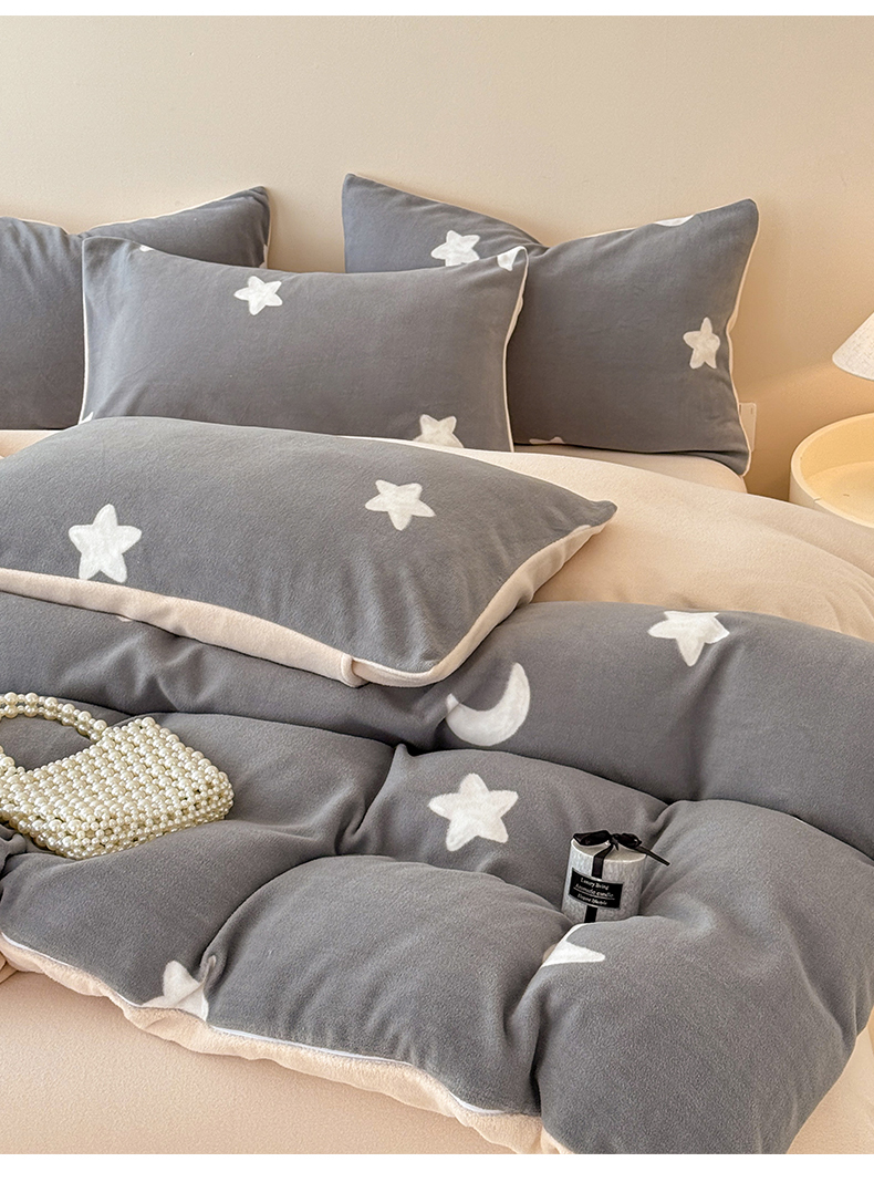 商品名称:懒猫家纺 2025新款印花海獭绒加厚保暖四件套 星星月亮-灰