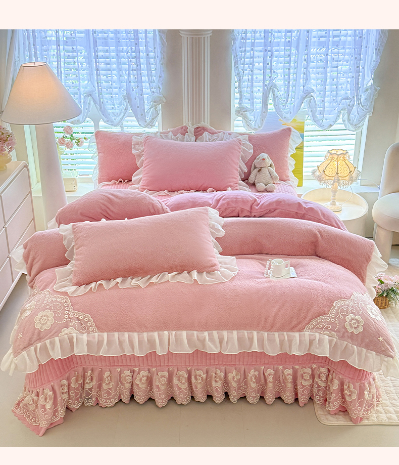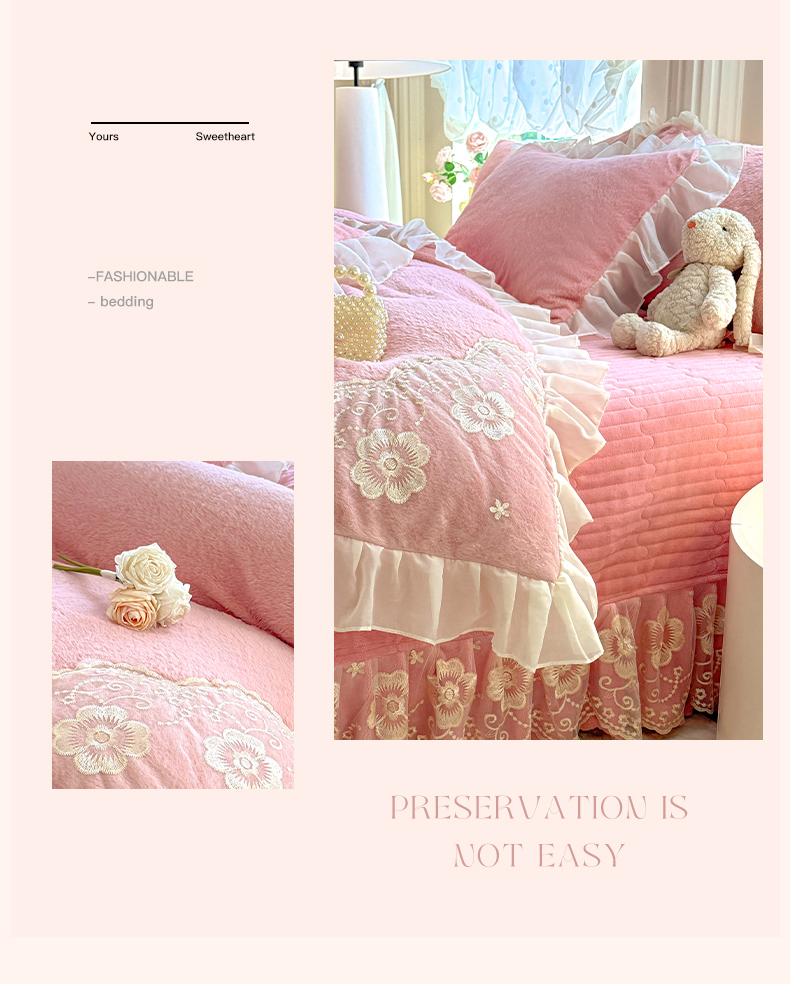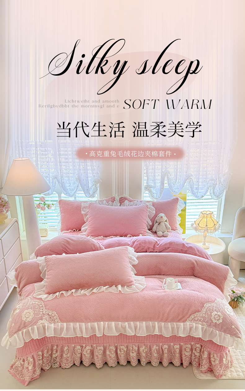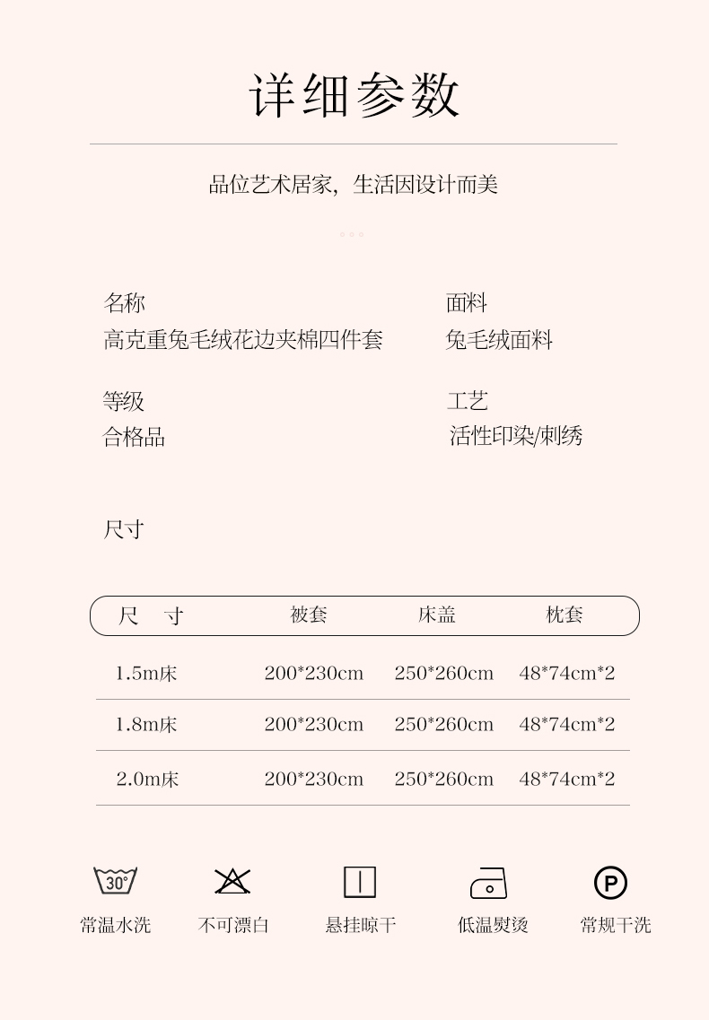商品名称:唐人居 2025新款高克重兔毛绒花边夹棉床盖四件套-满满爱 满满爱-浅灰