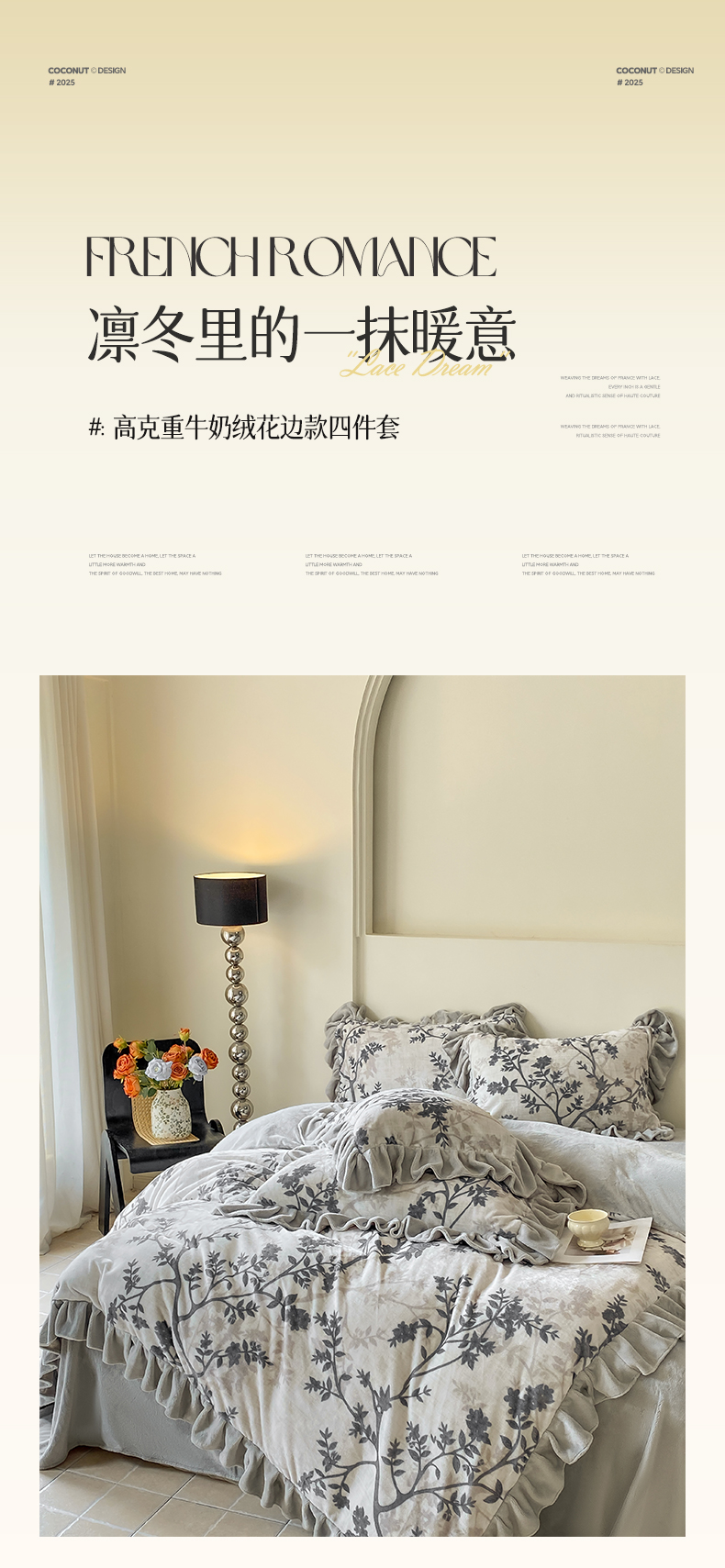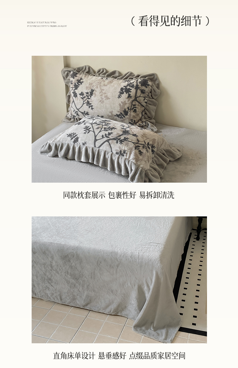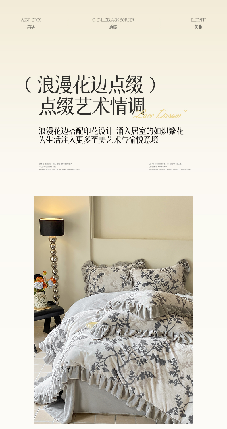 当前位置: 91家纺网 > 商品网购 > 床品套件 > 四件套 > 牛奶绒四件套 > 锦彩家居 2025新款高克重牛奶绒花边款四件套-花屿愿 山奈 米