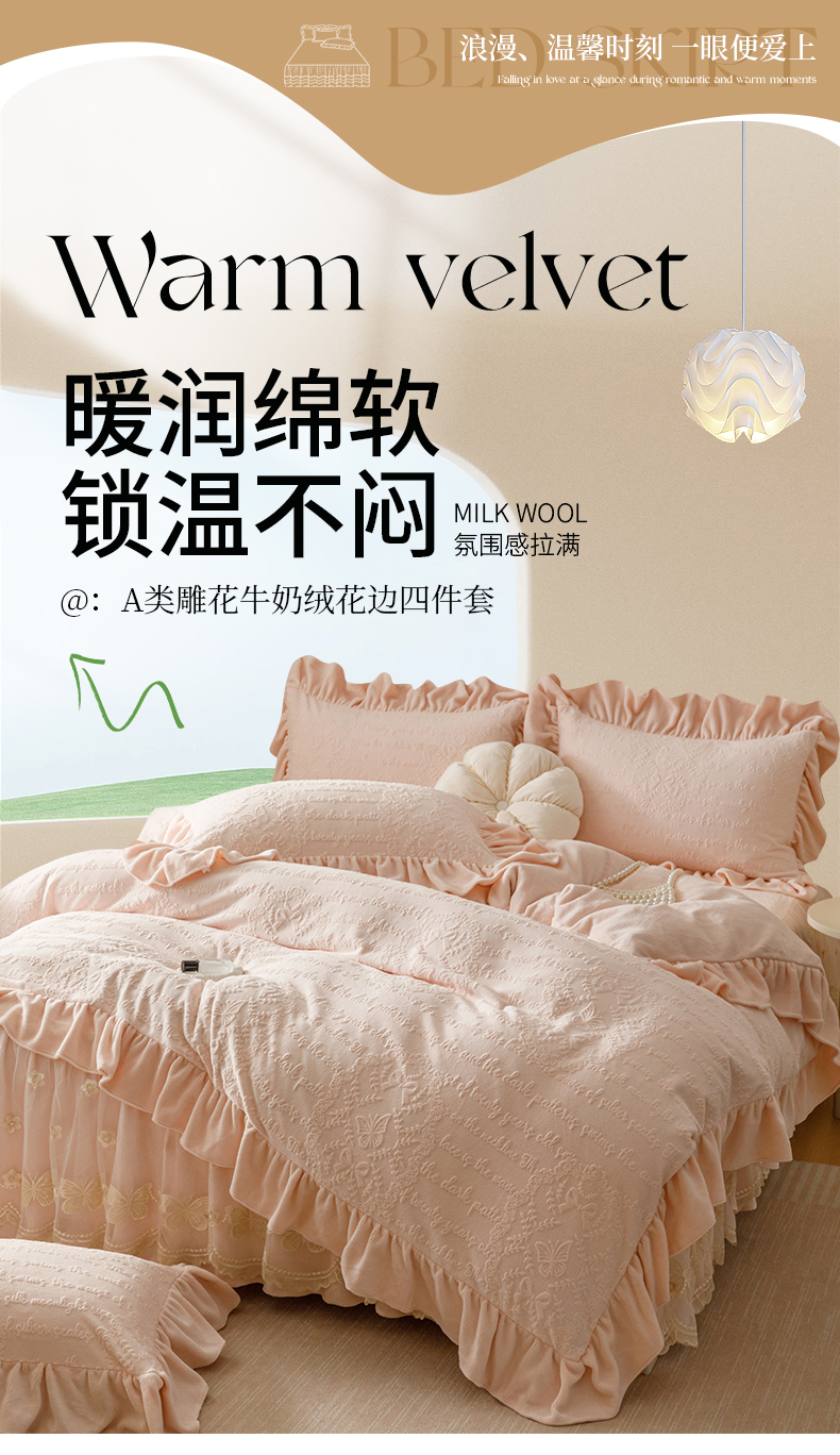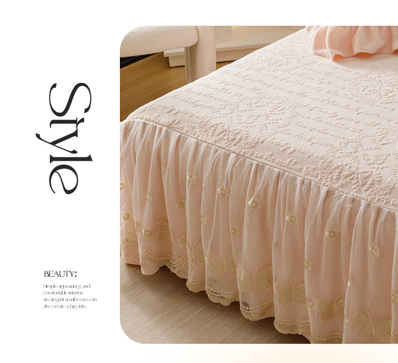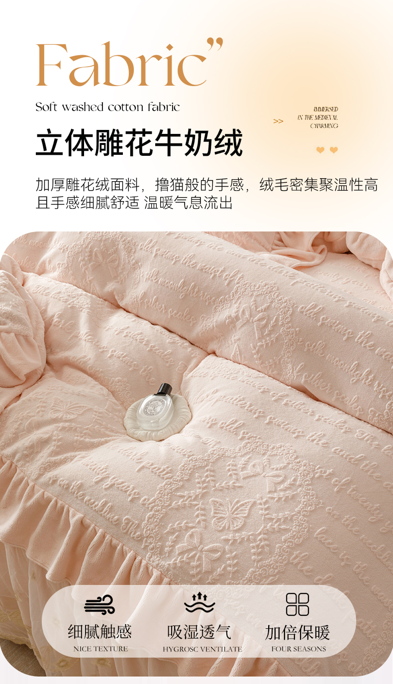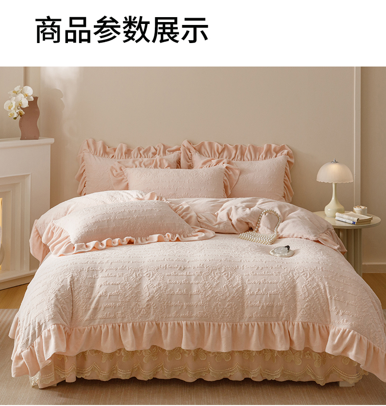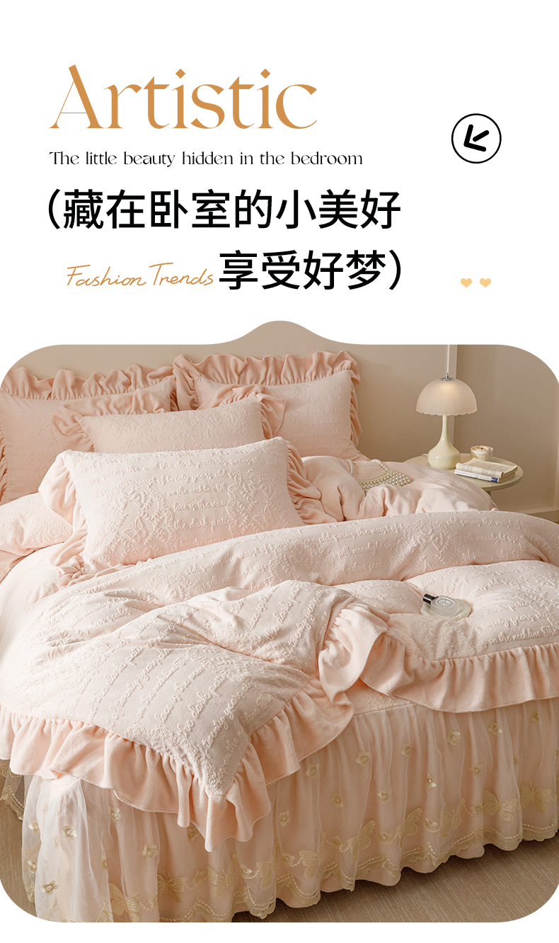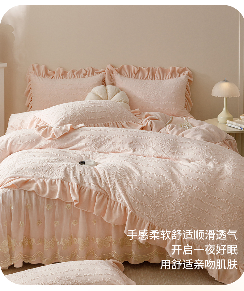 当前位置: 91家纺网 > 商品网购 > 床品套件 > 四件套 > 牛奶绒四件套 > (总)好儿喜家纺 2025新款雕花牛奶绒床裙款四件套-蝶韵