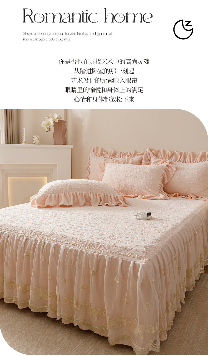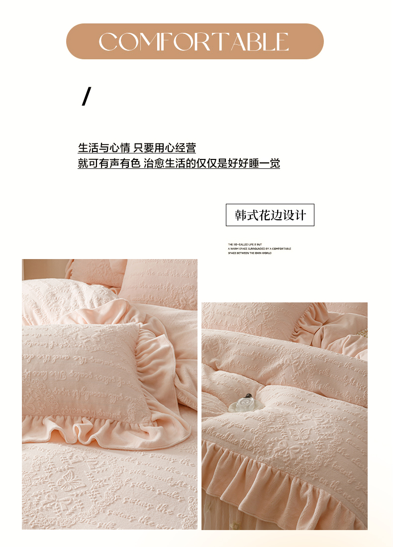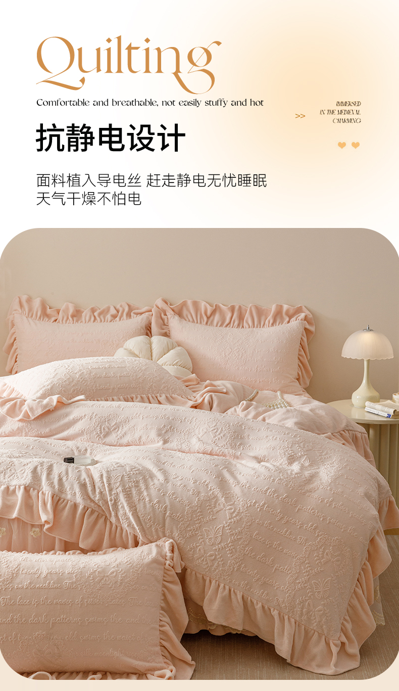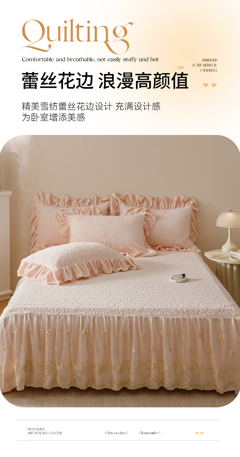 当前位置: 91家纺网 > 商品网购 > 床品套件 > 四件套 > 牛奶绒四件套 > (总)好儿喜家纺 2025新款雕花牛奶绒床裙款四件套-蝶韵
