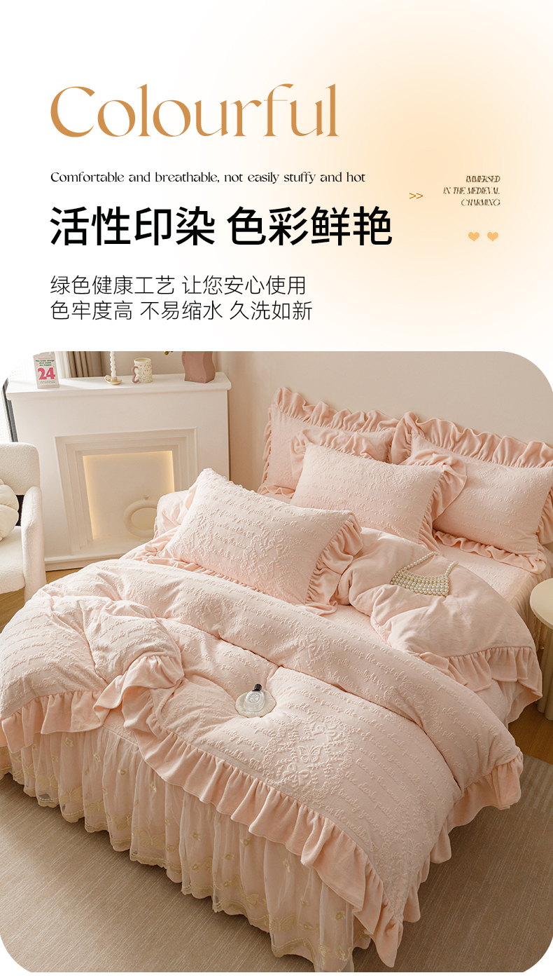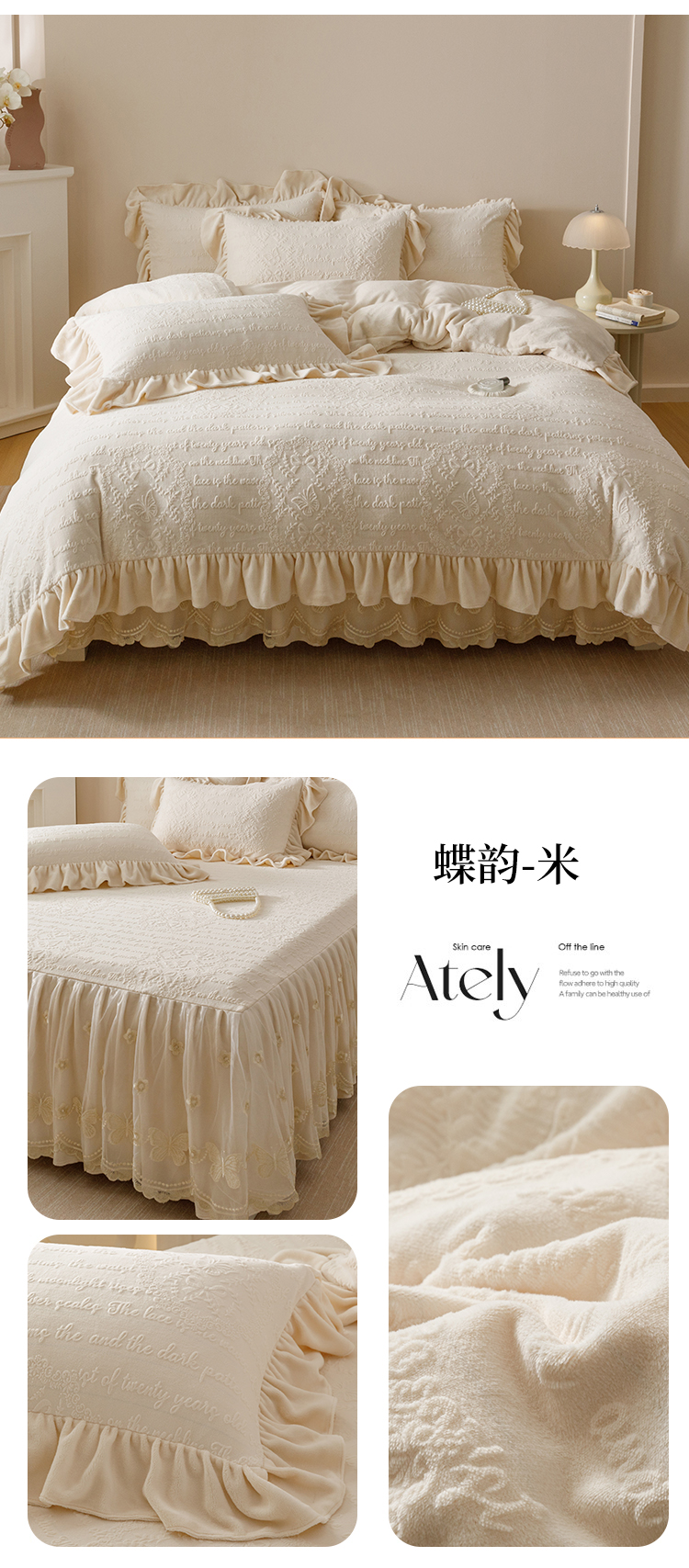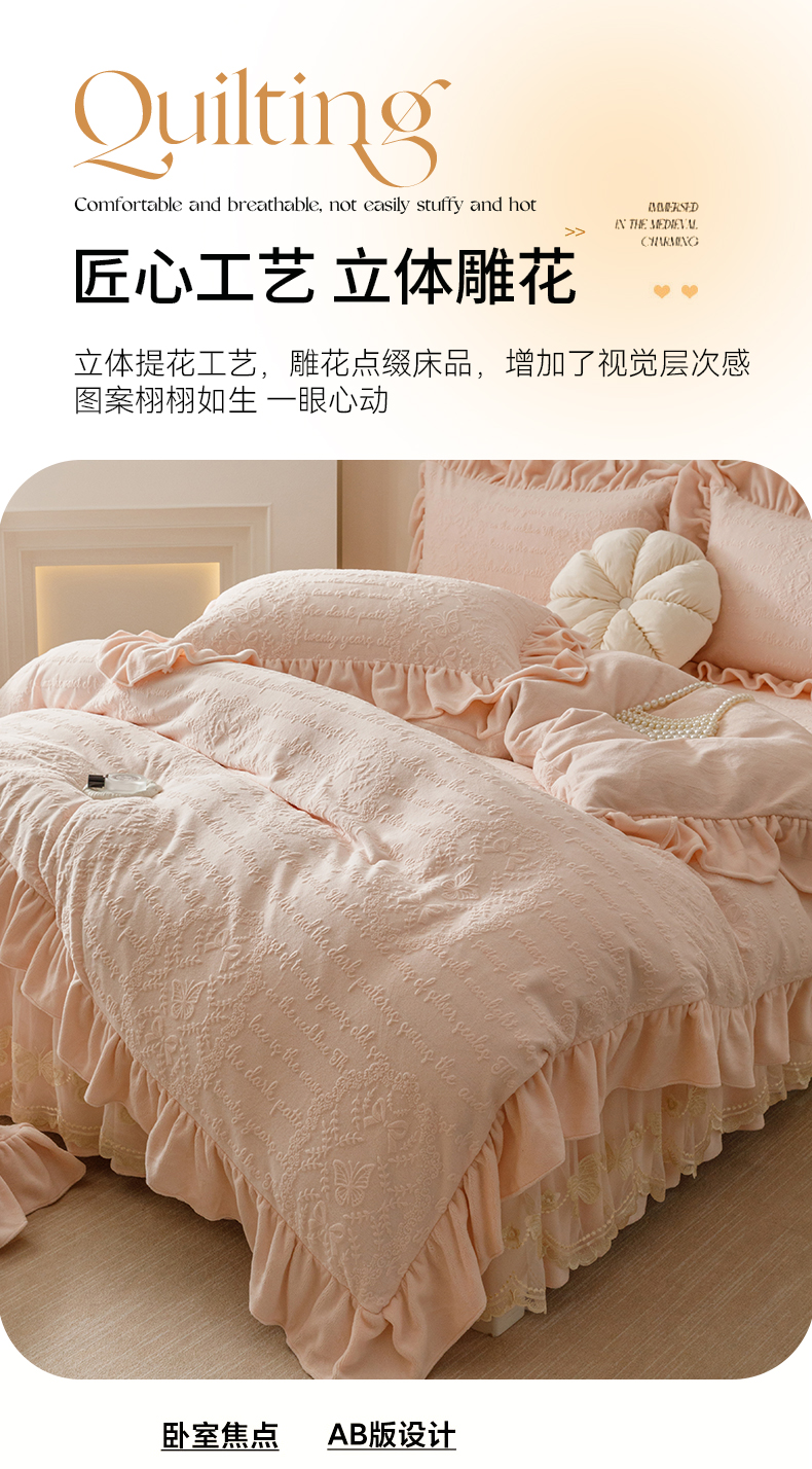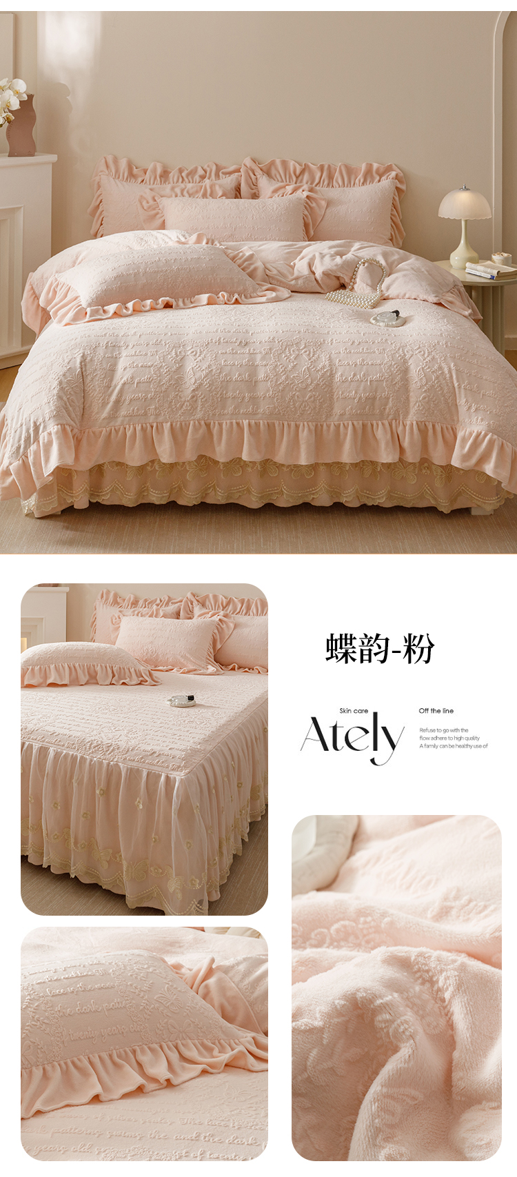 当前位置: 91家纺网 > 商品网购 > 床品套件 > 四件套 > 牛奶绒四件套 > (总)好儿喜家纺 2025新款雕花牛奶绒床裙款四件套-蝶韵