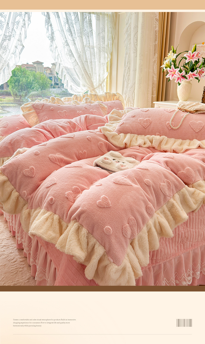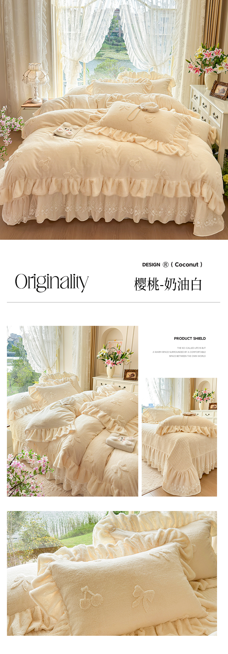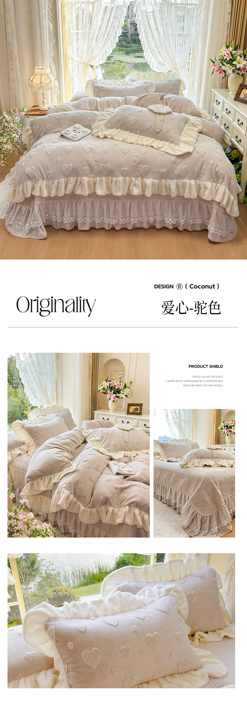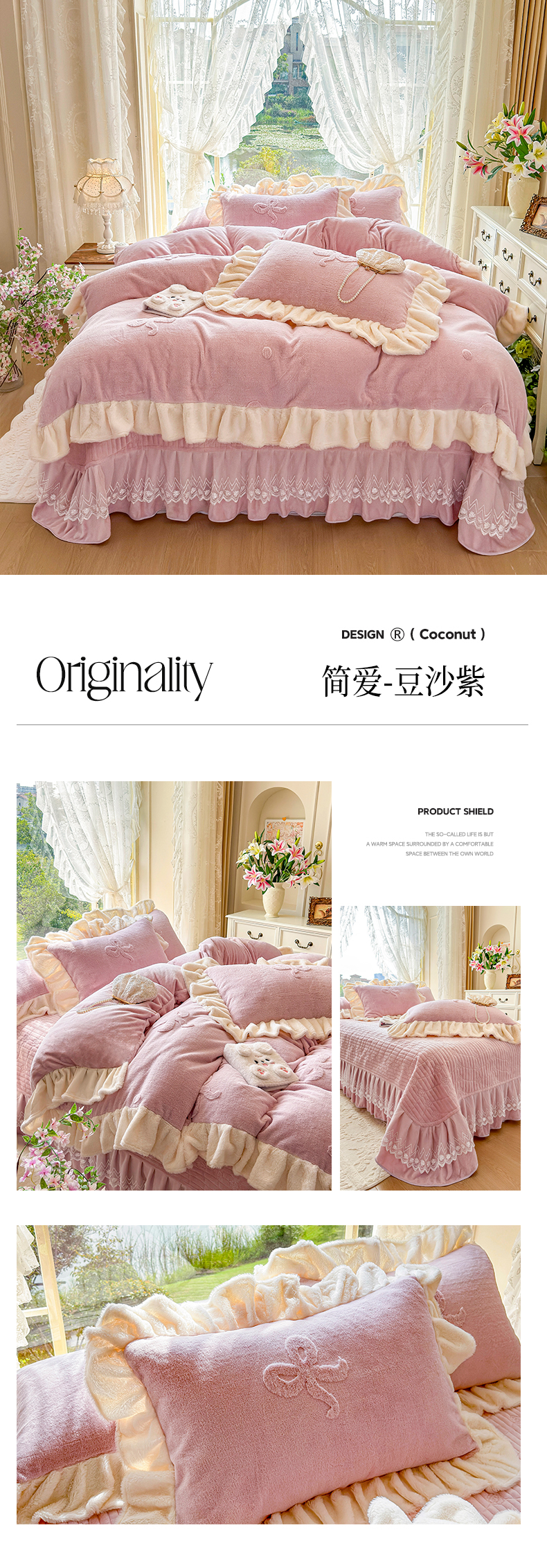 (总)宜凡家纺 2025新款兔绒提花牛奶绒夹棉床裙四件套,爱心 少女粉,爱心 粉紫,爱心 驼色,蝶舞 大红,蝶舞 米色,蝶舞 浅紫,蝶舞 玉色,简爱 苍青,简爱 豆沙紫,简爱 玉色,樱桃 苍青,樱桃 豆沙紫,樱桃 奶油白