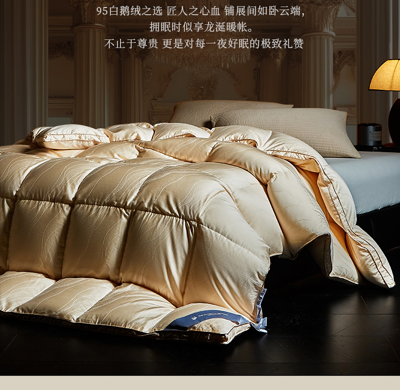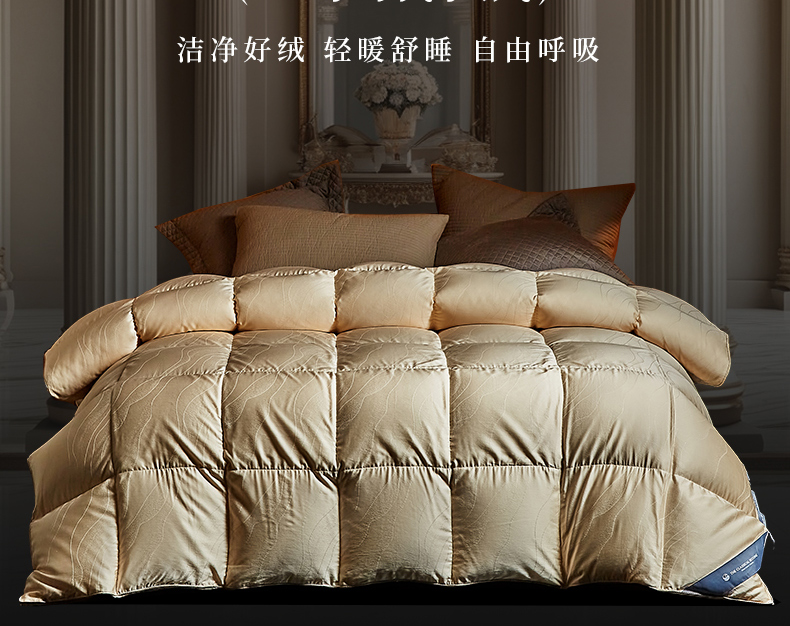 • 91家纺网 家纺一手货源 找家纺 (总)暖羽屋羽绒馆 2025新款国标95白鹅绒被子 绒子含量95羽绒被芯 双人2米加大冬被 婚庆羽绒被秋冬被,恒运莱 金-角度一,恒运莱 金-角度二