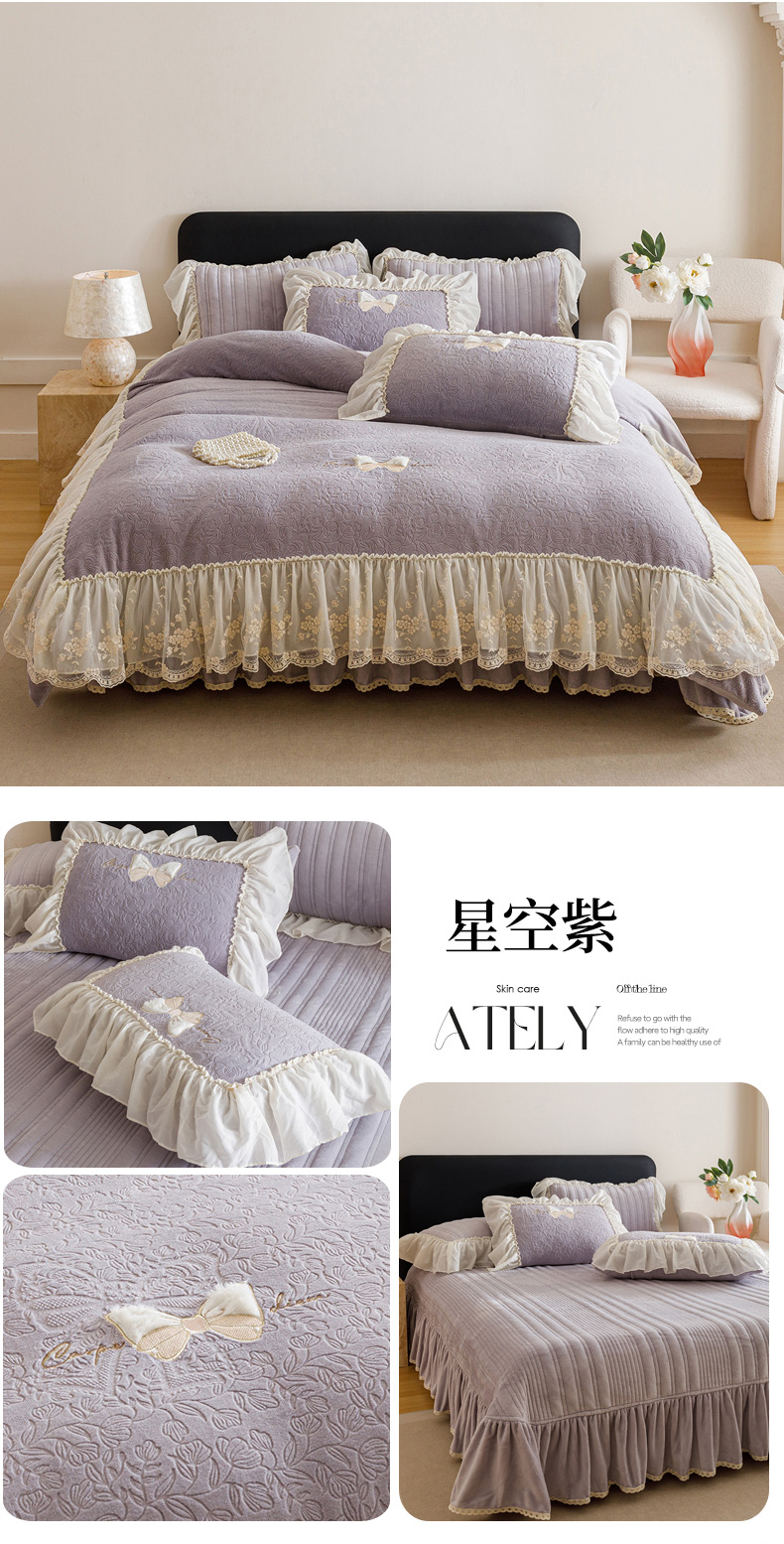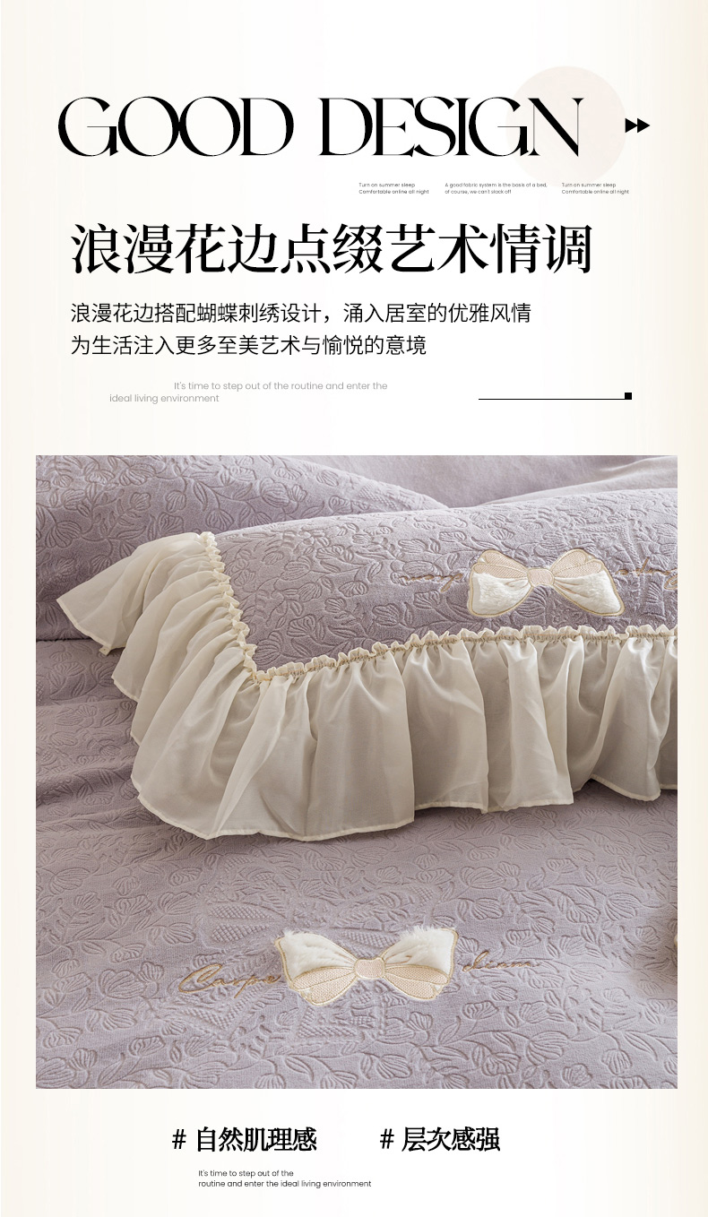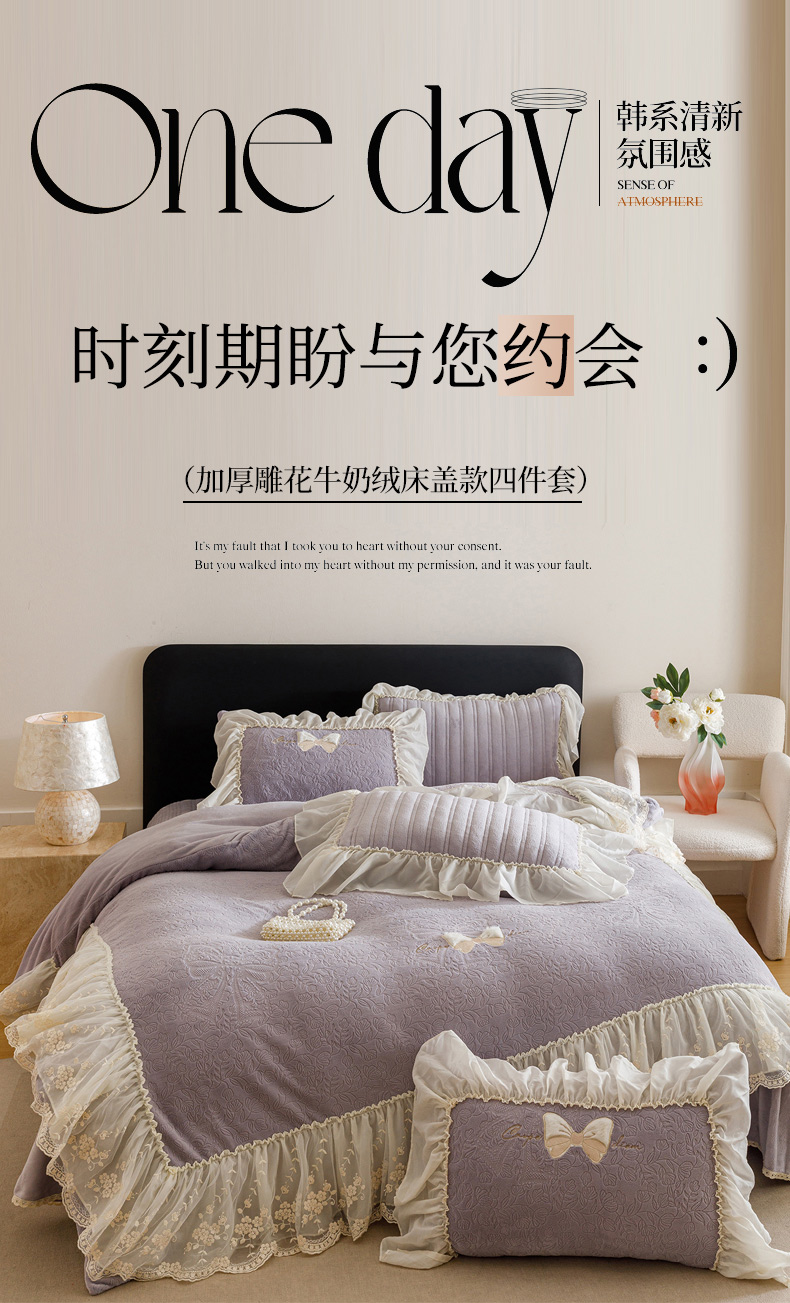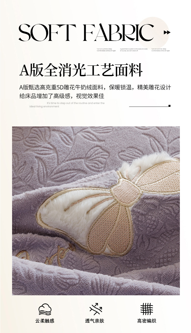 当前位置: 91家纺网 > 商品网购 > 床品套件 > 四件套 > 牛奶绒四件套 > 菊上家纺 2025新款雕花绒牛奶绒夹棉床盖款四件套-蝴蝶仙子 蝴蝶仙子-紫