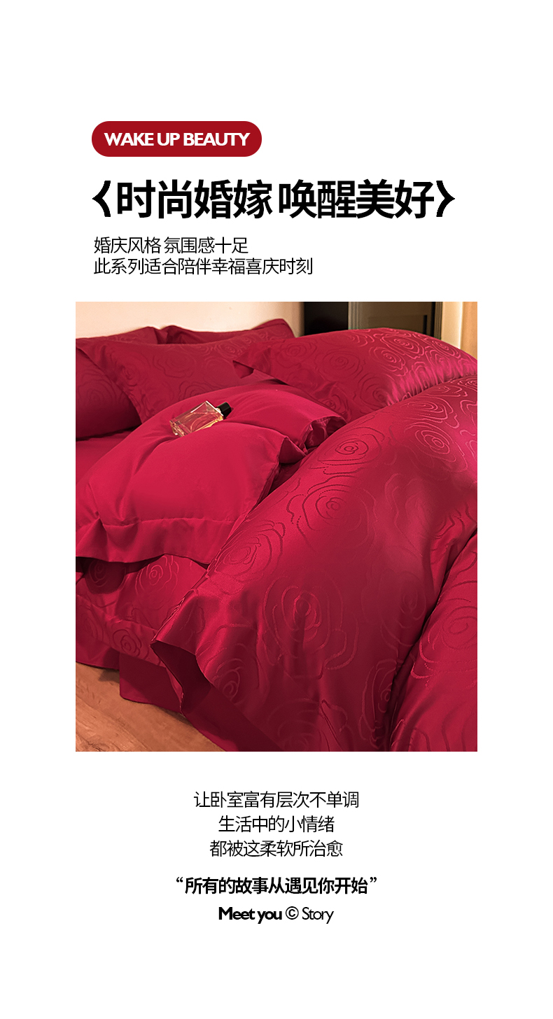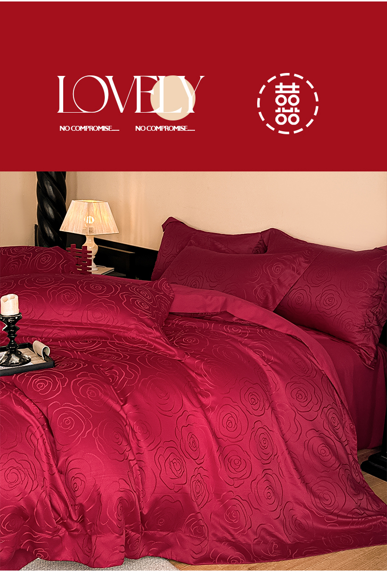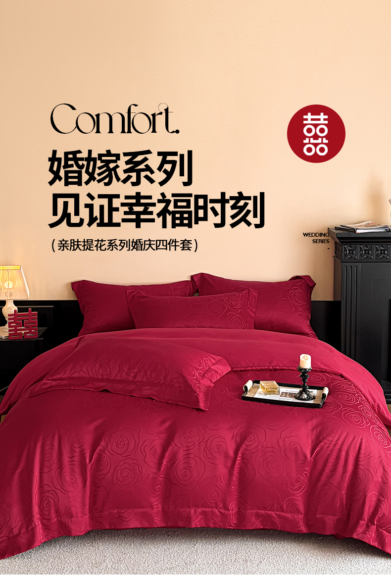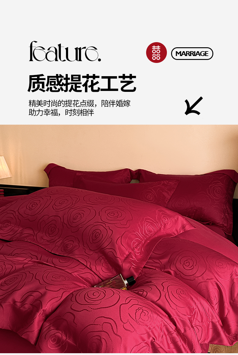 当前位置: 91家纺网 > 商品网购 > 床品套件 > 四件套 > 婚庆四件套 > 置顶家纺 2025新款亲肤提花玫瑰婚庆四件套 玫瑰予你-酒红