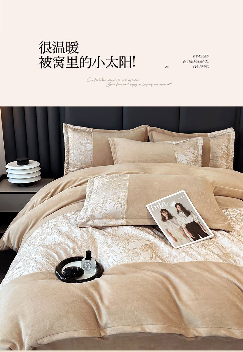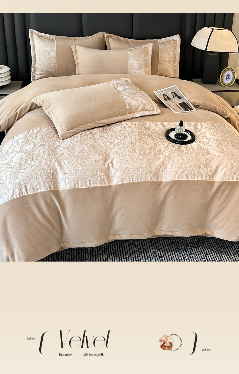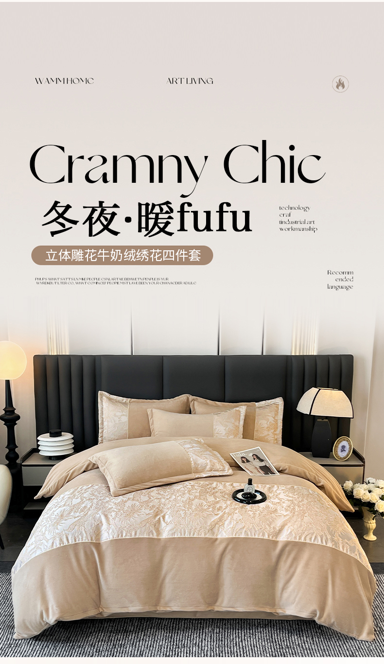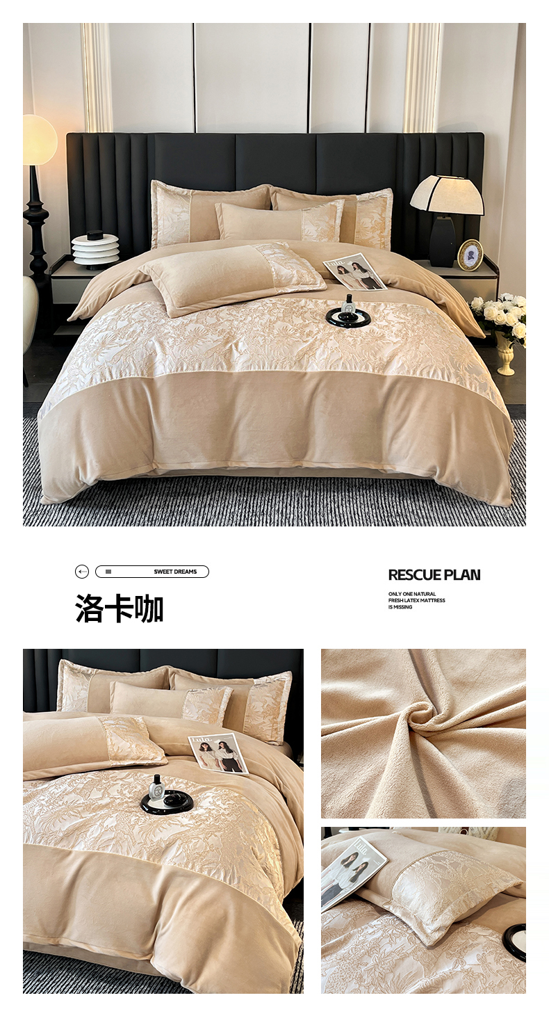 (总)富宁家纺 2025新款立体雕花牛奶绒绣花四件套-洛卡玫瑰系列,洛卡白,玫瑰灰,洛卡咖,玫瑰粉,洛卡蓝