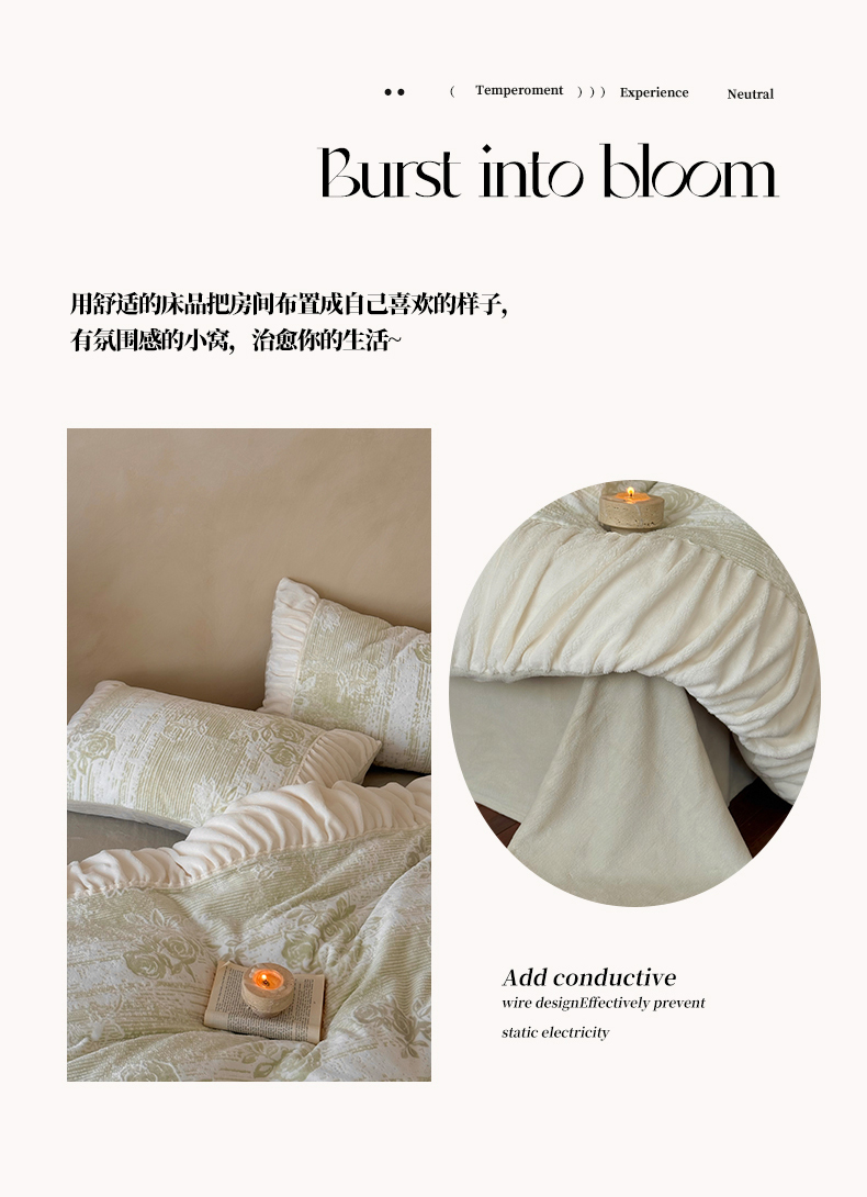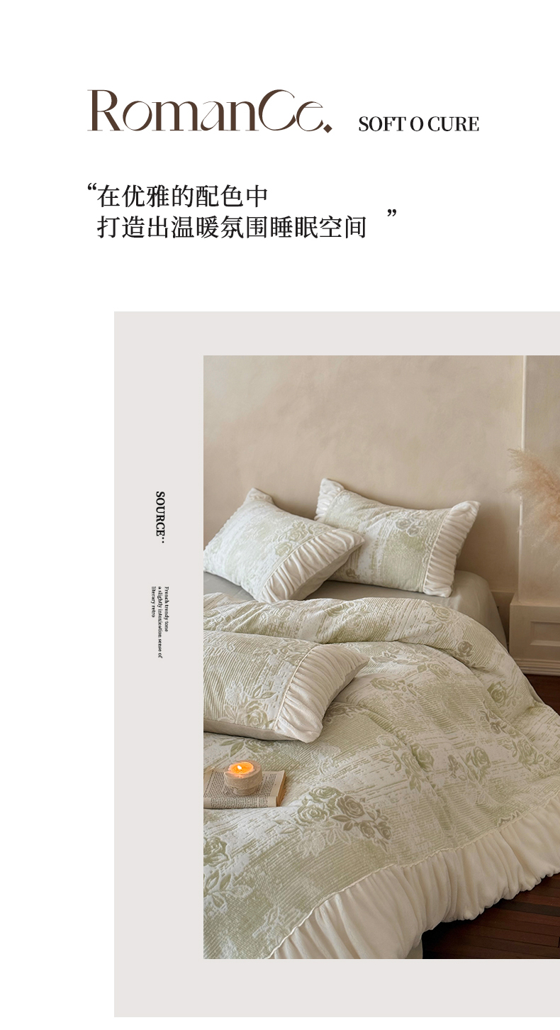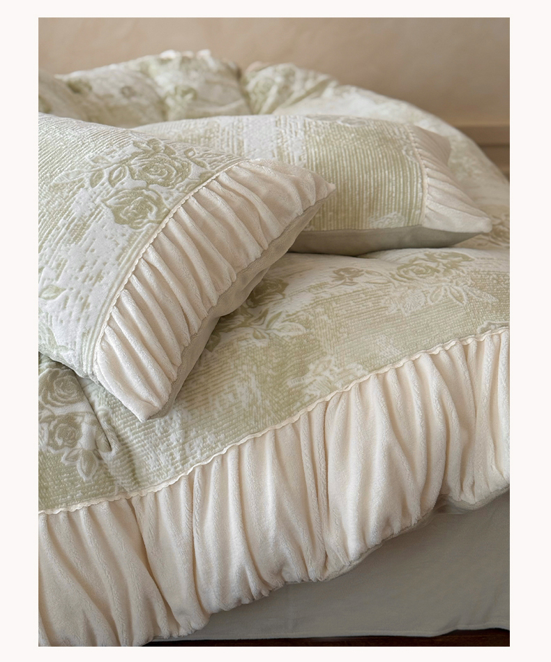 商品名称:凯儿家纺 2025新款全消光牛奶绒法式公主风花边工艺款四件套-蔷薇少女 蔷薇少女-绿
