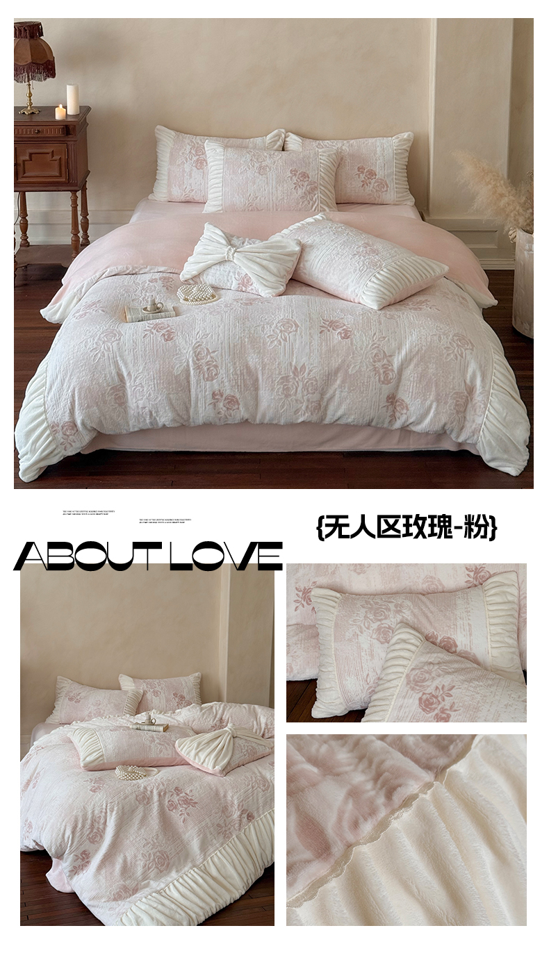(总)凯儿家纺 2025新款全消光牛奶绒法式公主风花边工艺款四件套-蔷薇少女,蔷薇少女-粉,蔷薇少女-绿