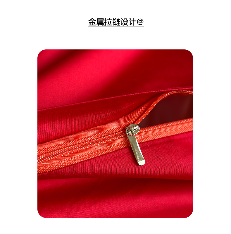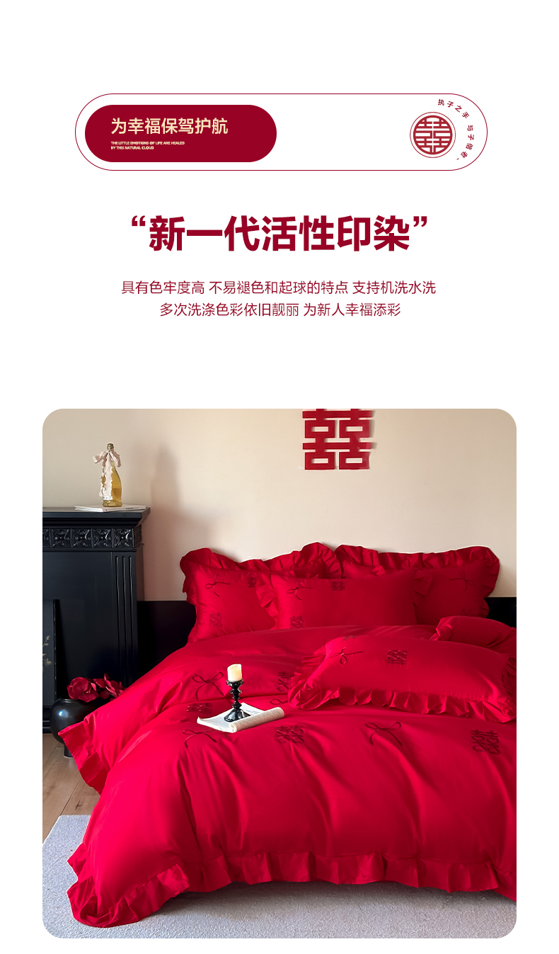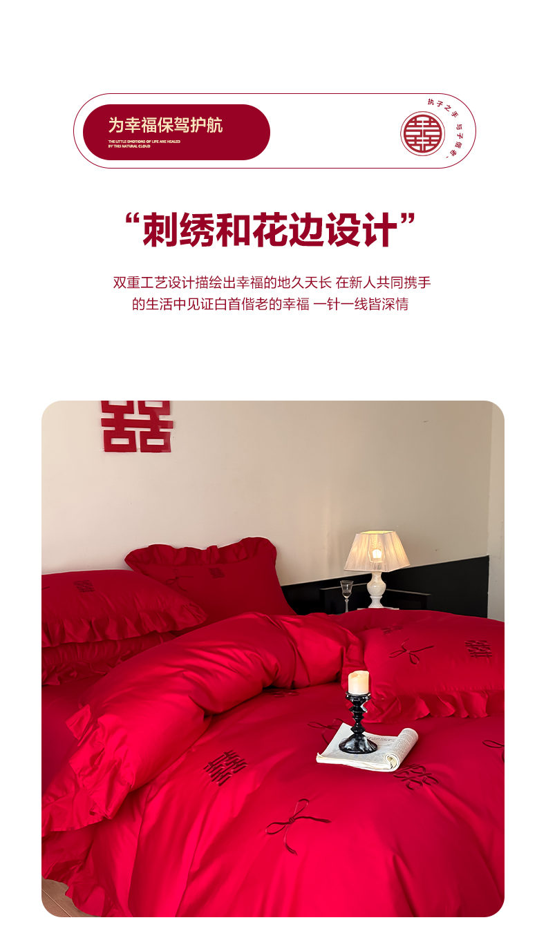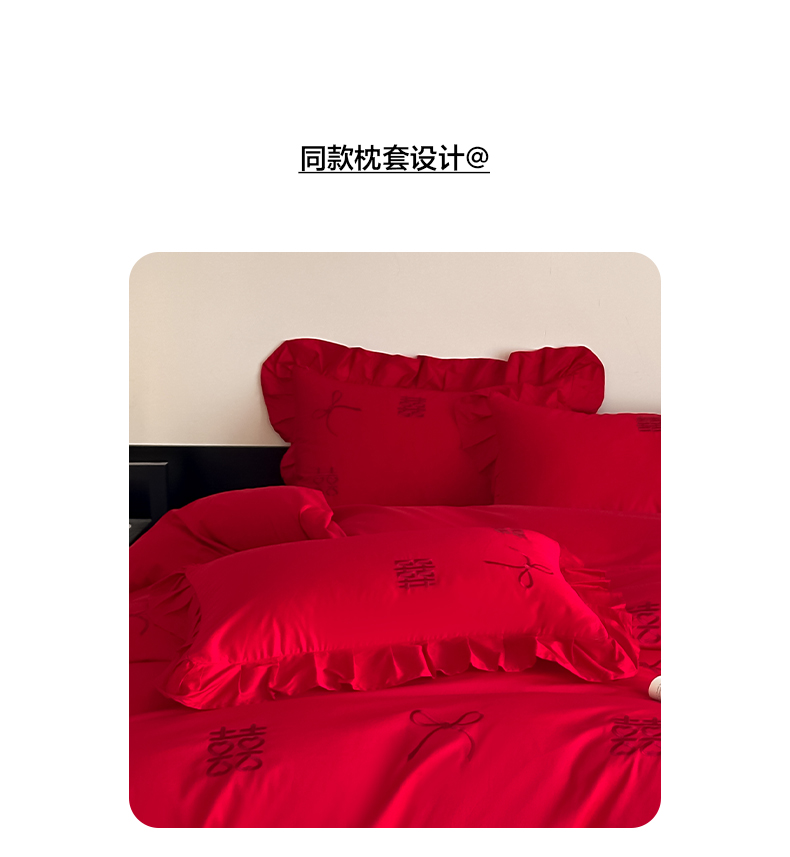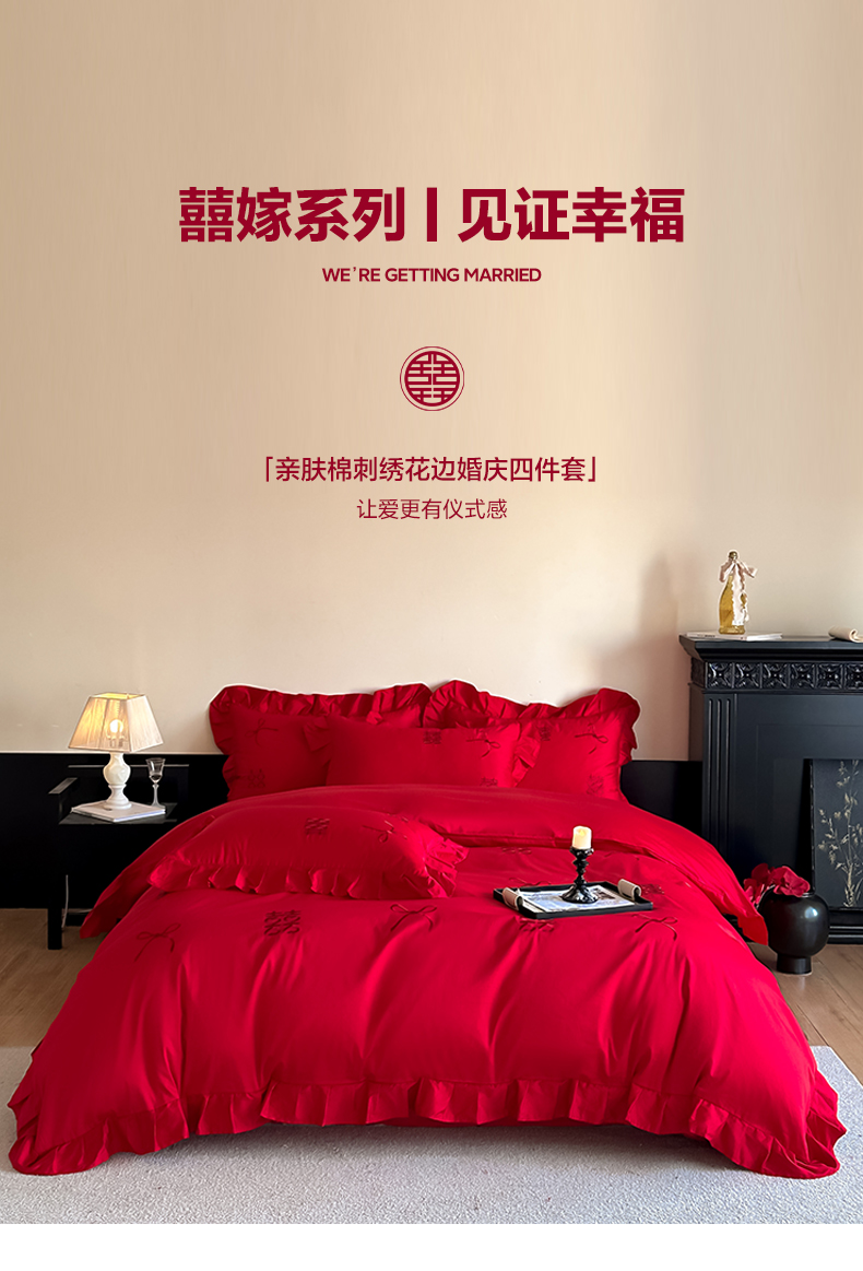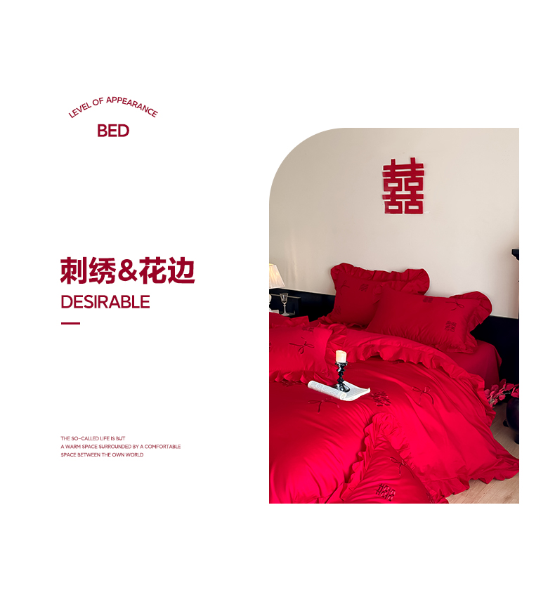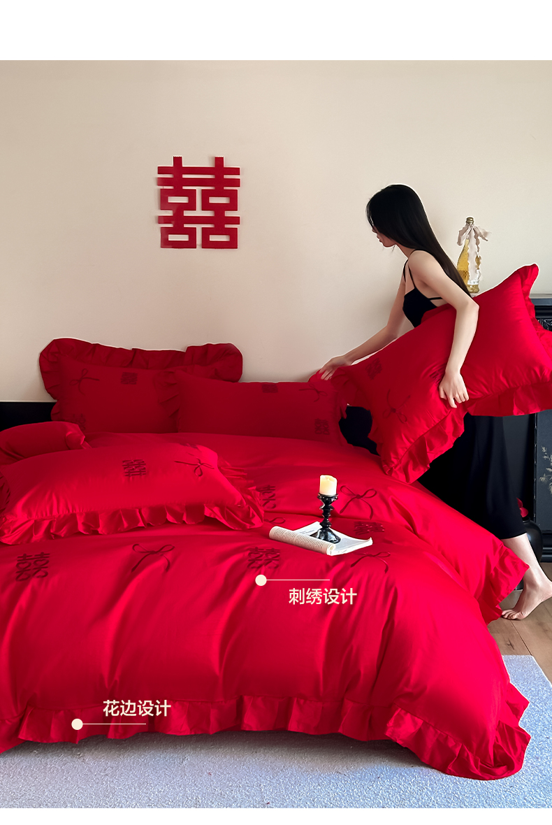 商品名称:欧乐蒂 2025新款亲肤棉刺绣花边婚庆四件套-倾城 倾城-喜红