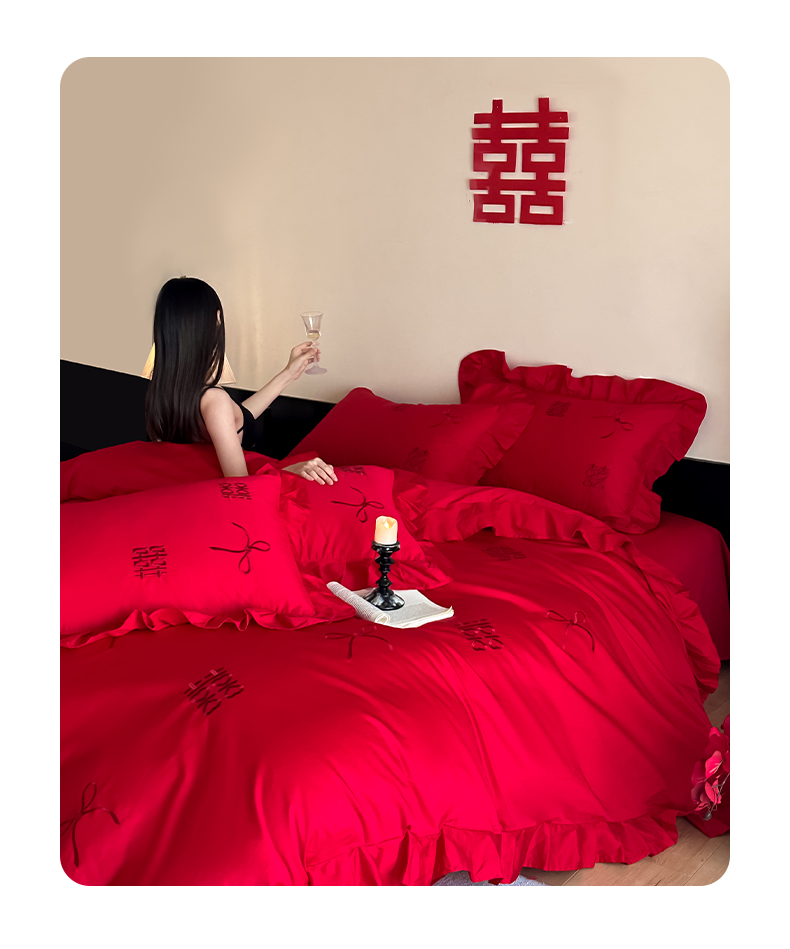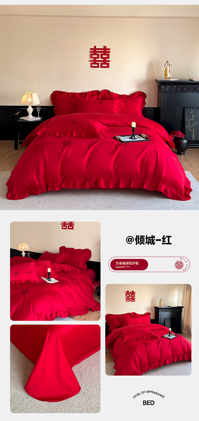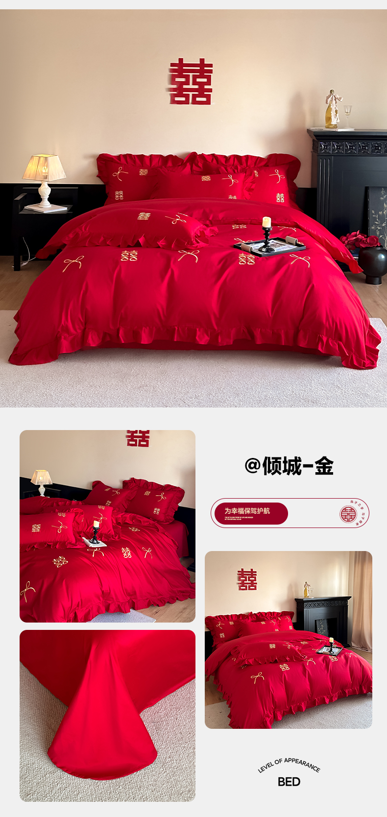 欧乐蒂 2025新款亲肤棉刺绣花边婚庆四件套-倾城 倾城-喜红