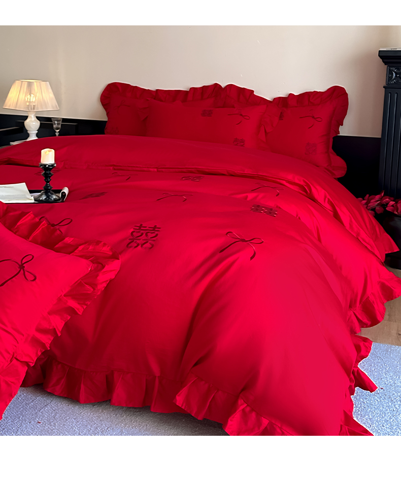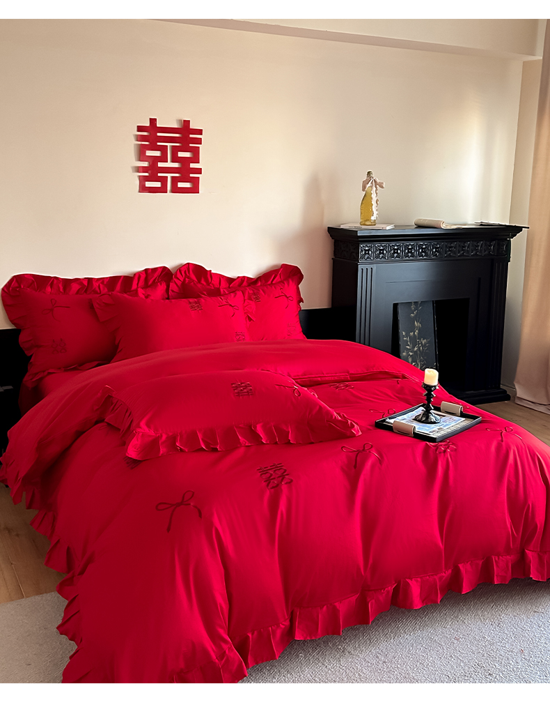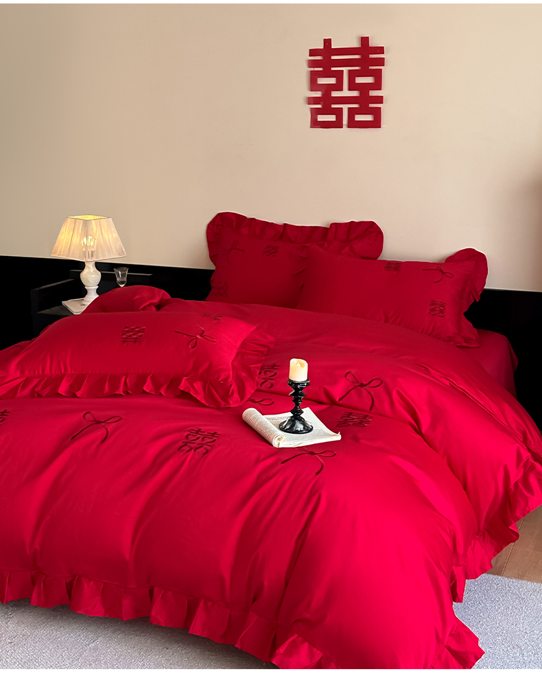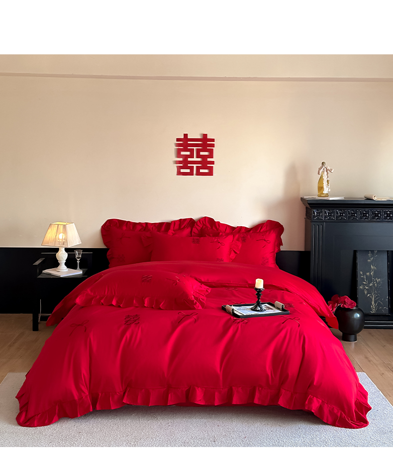 欧乐蒂 2025新款亲肤棉刺绣花边婚庆四件套-倾城 倾城-喜红