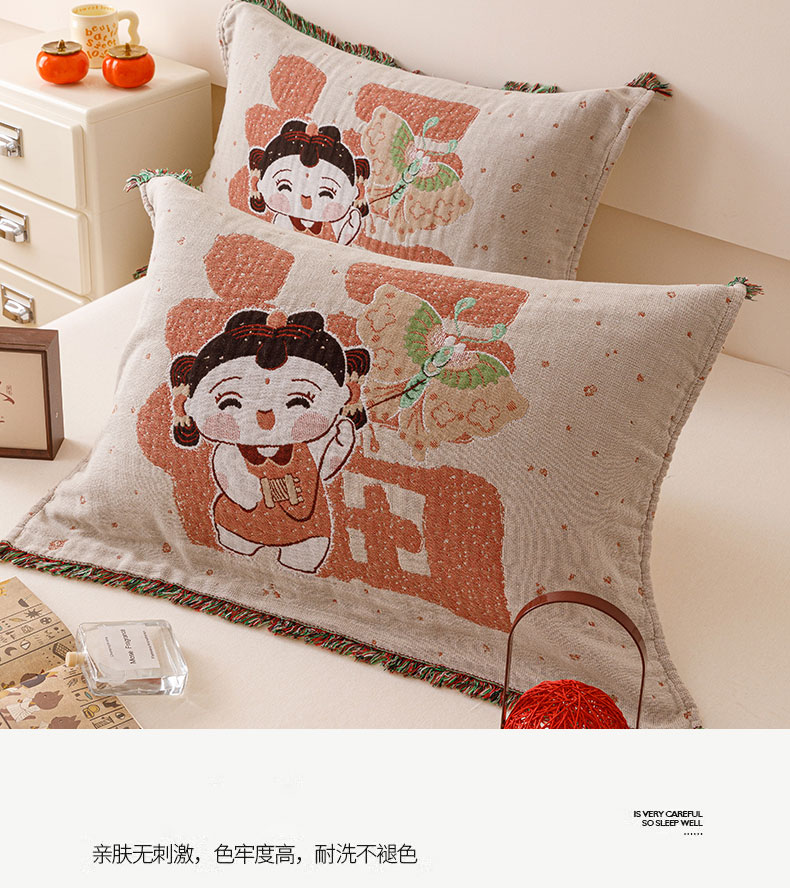 商品名称:麻依 2025新款四层纱布全棉新年大红枕巾流苏婚庆枕盖 福娃