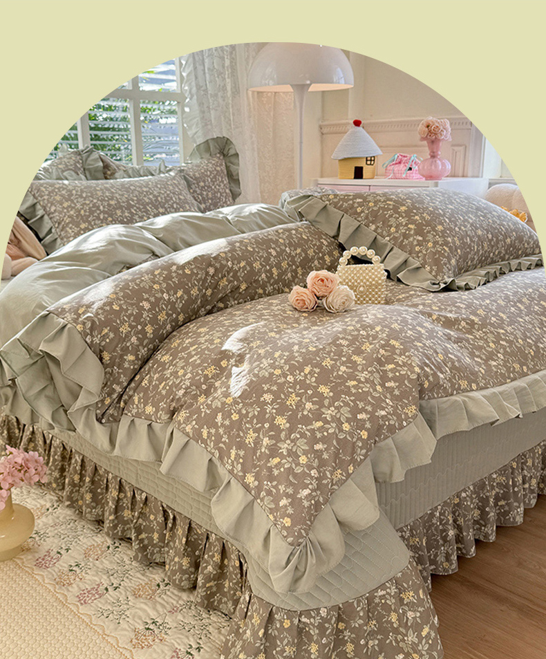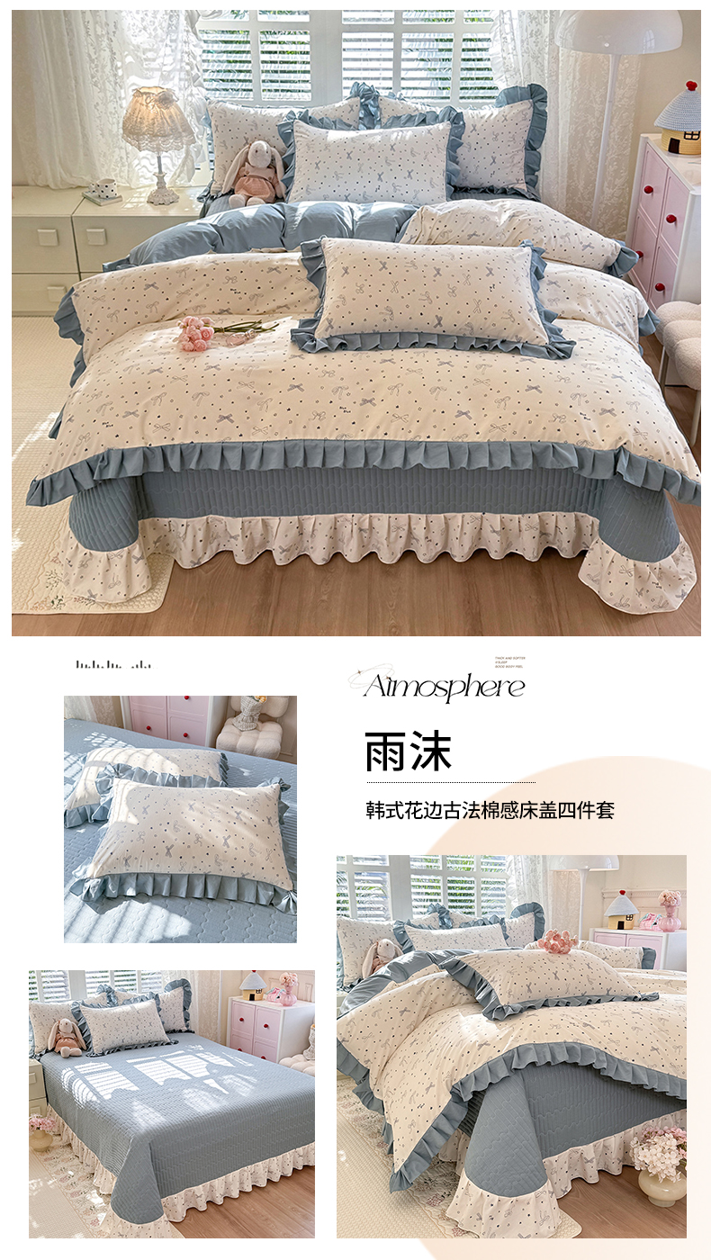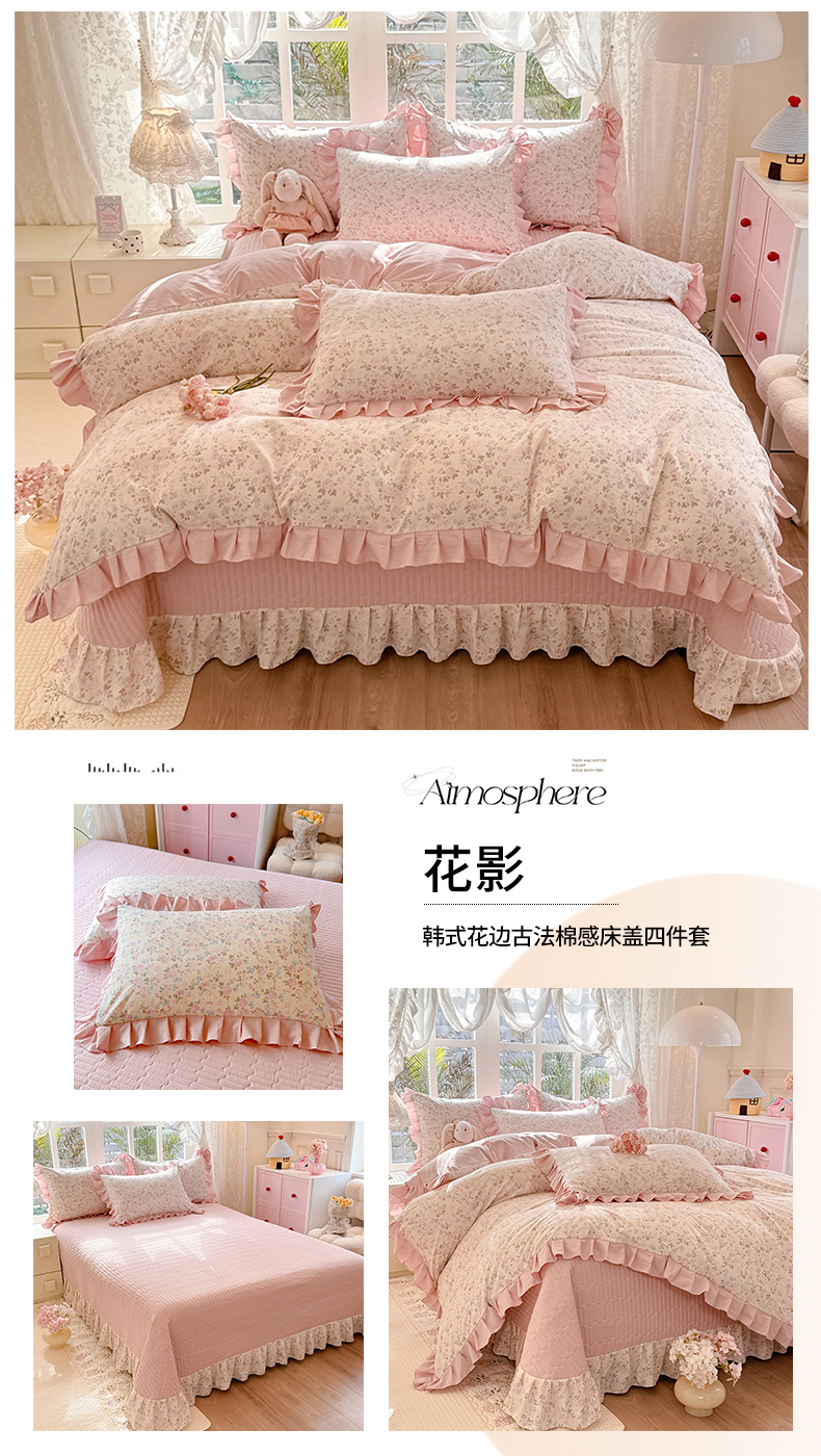 当前位置: 91家纺网 > 商品网购 > 床品套件 > 四件套 > 化纤普通四件套 > 韩约家纺 2026新款韩式花边古法棉感床盖四件套 初遇