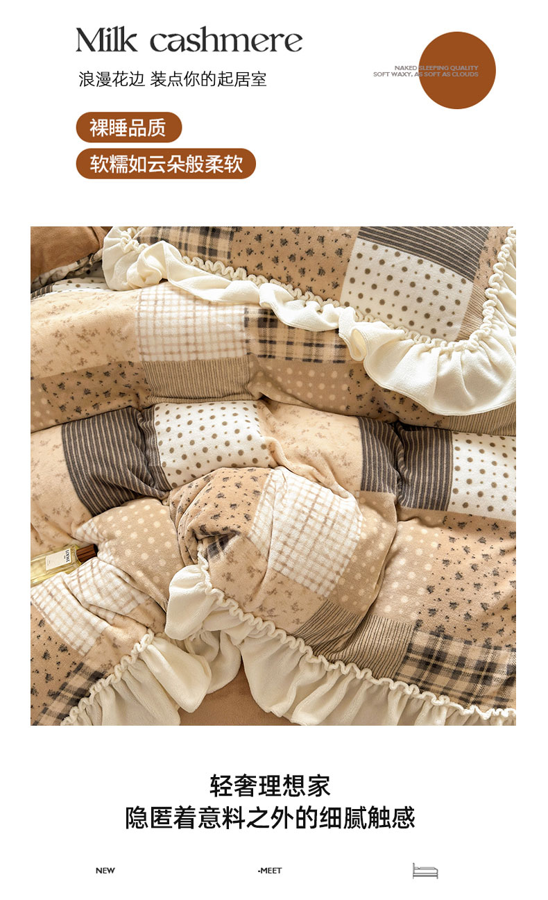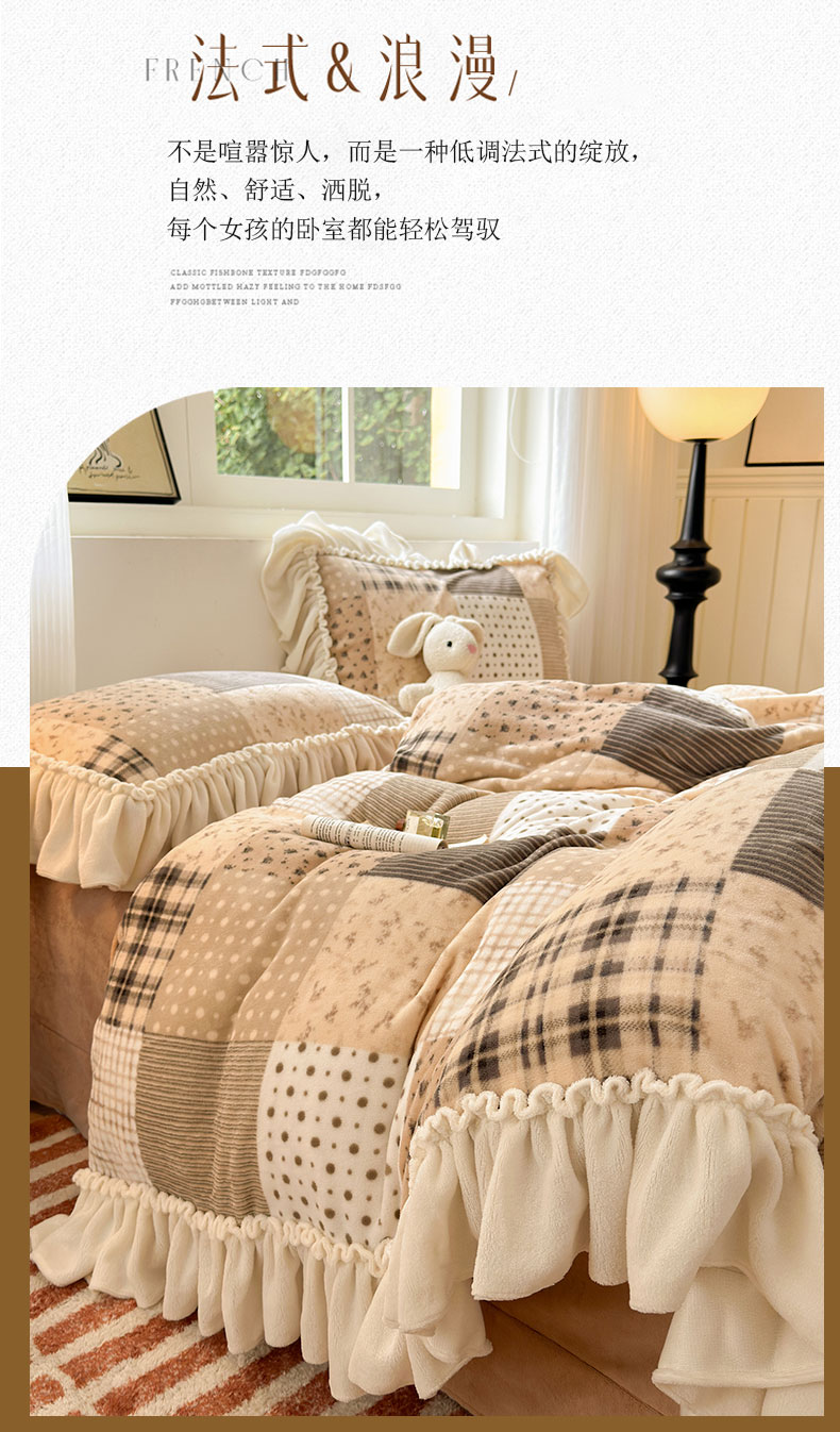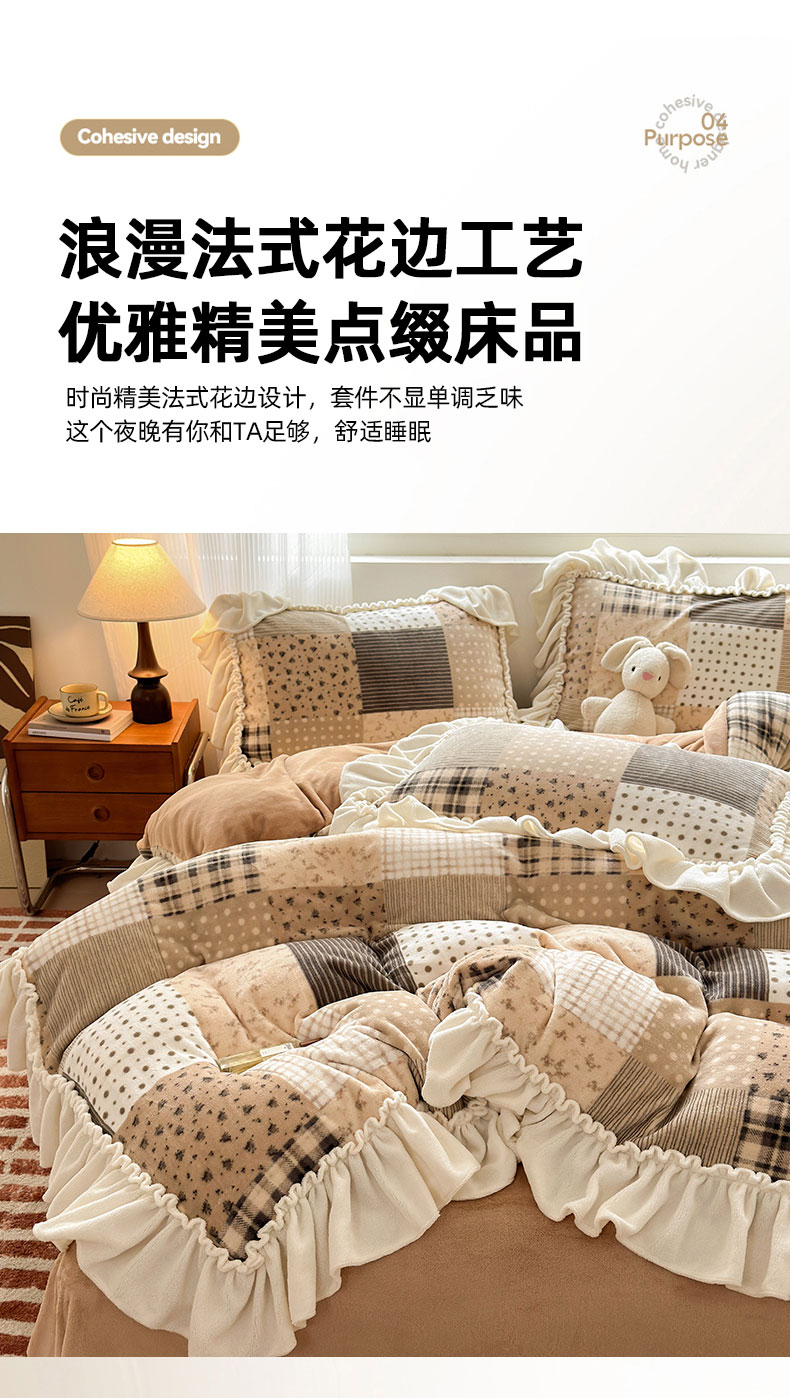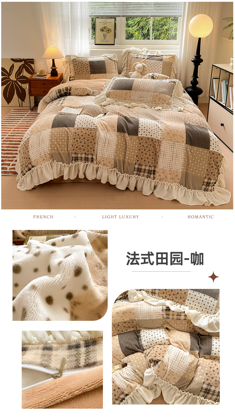 商品名称:欣宜家纺 2025秋冬新款加绒加厚田园拼布风法式花边款牛奶绒四件套 布鲁咖