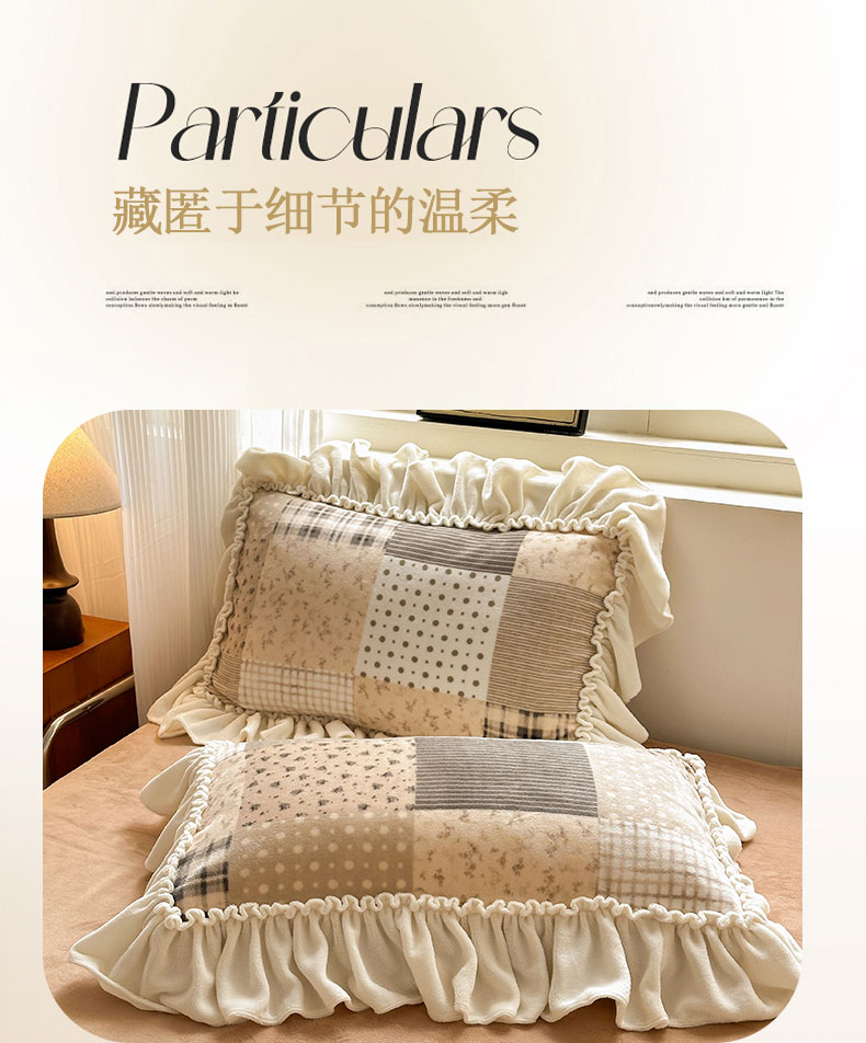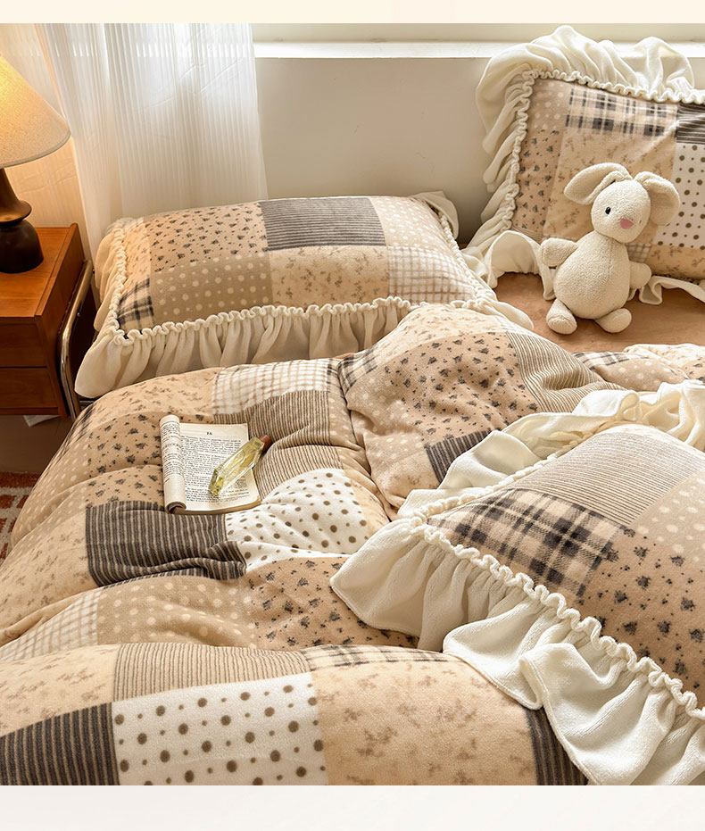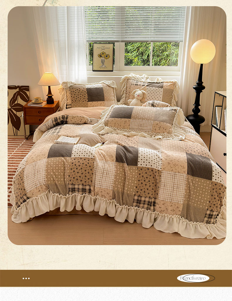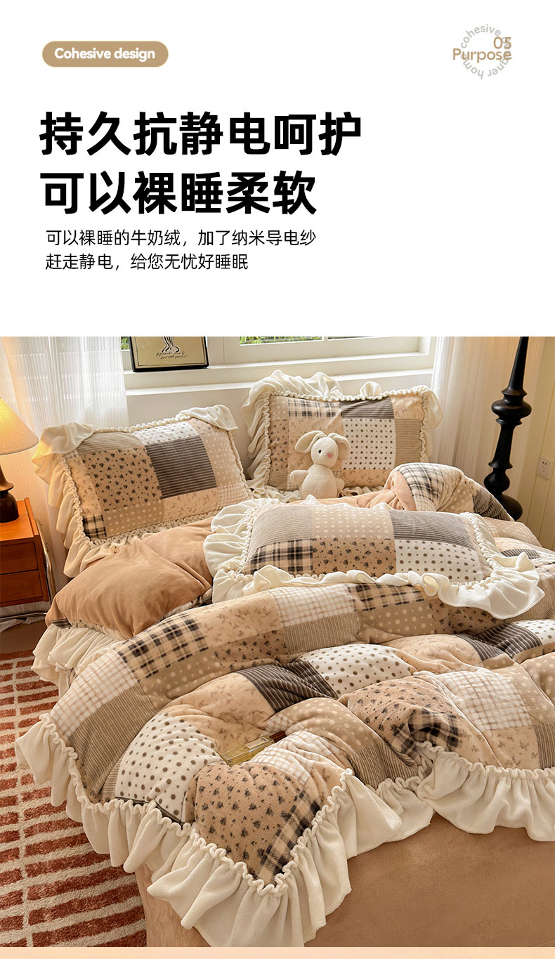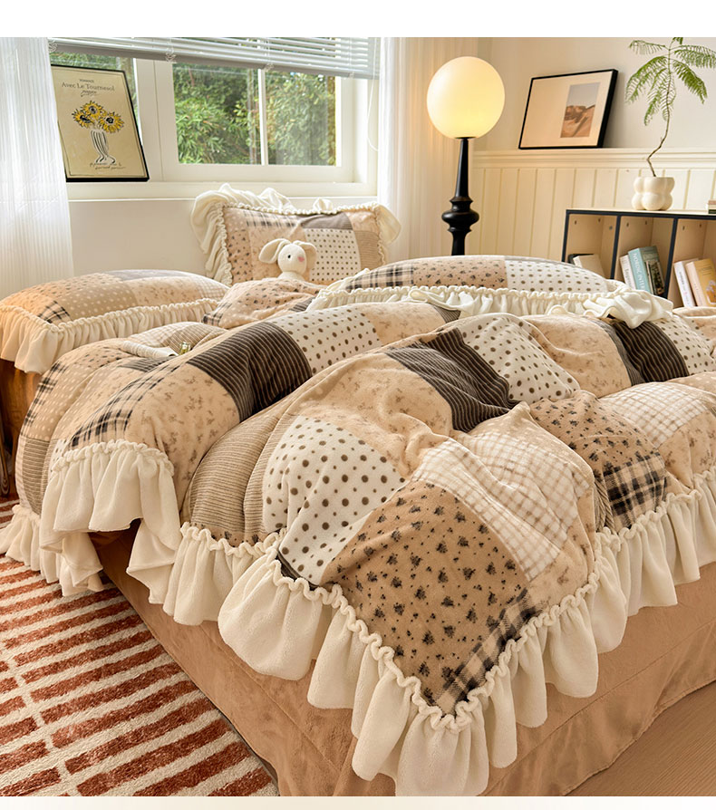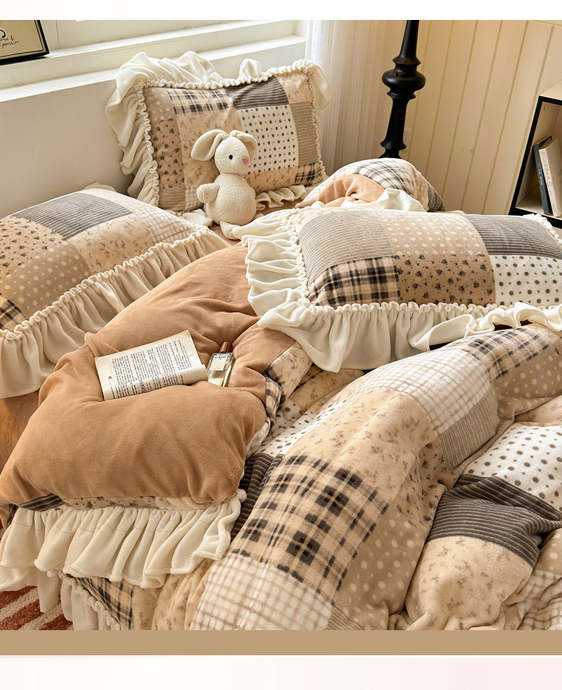 商品名称:欣宜家纺 2025秋冬新款加绒加厚田园拼布风法式花边款牛奶绒四件套 布鲁咖