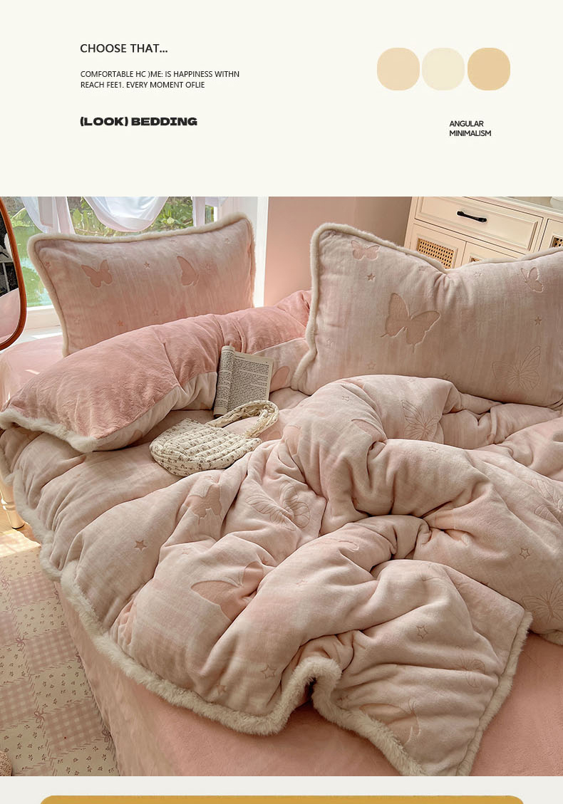 欣宜家纺 2025秋冬新款加绒加厚兔毛花边款烂花雕花牛奶绒四件套 蝶舞咖