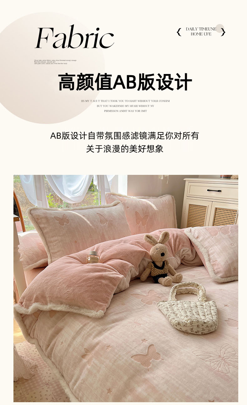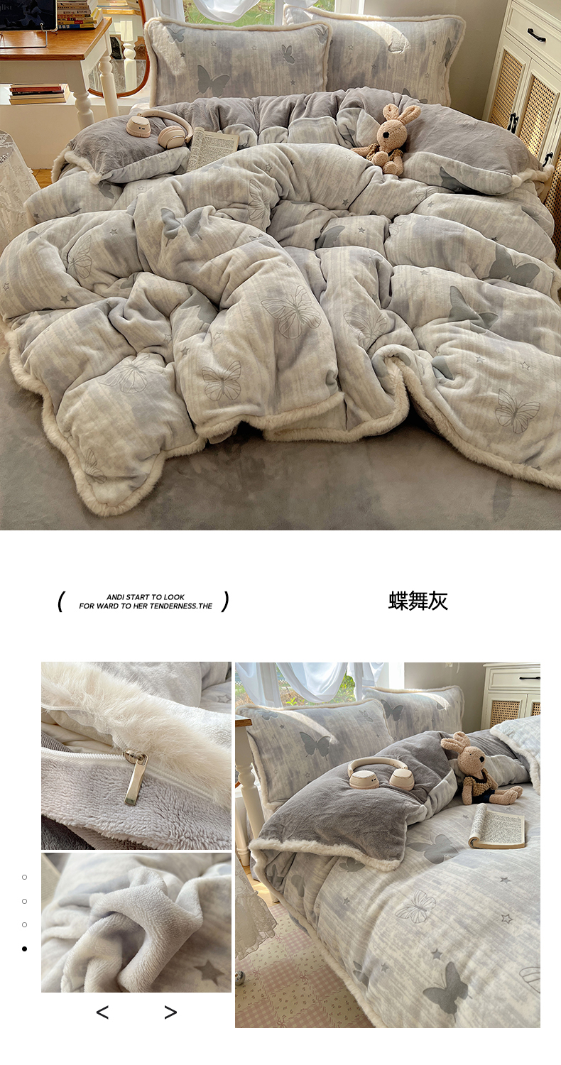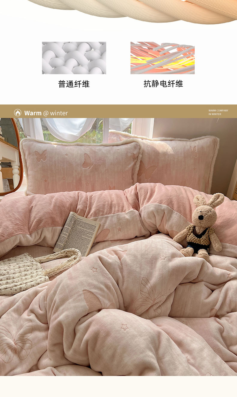 商品名称:欣宜家纺 2025秋冬新款加绒加厚兔毛花边款烂花雕花牛奶绒四件套 蝶舞咖
