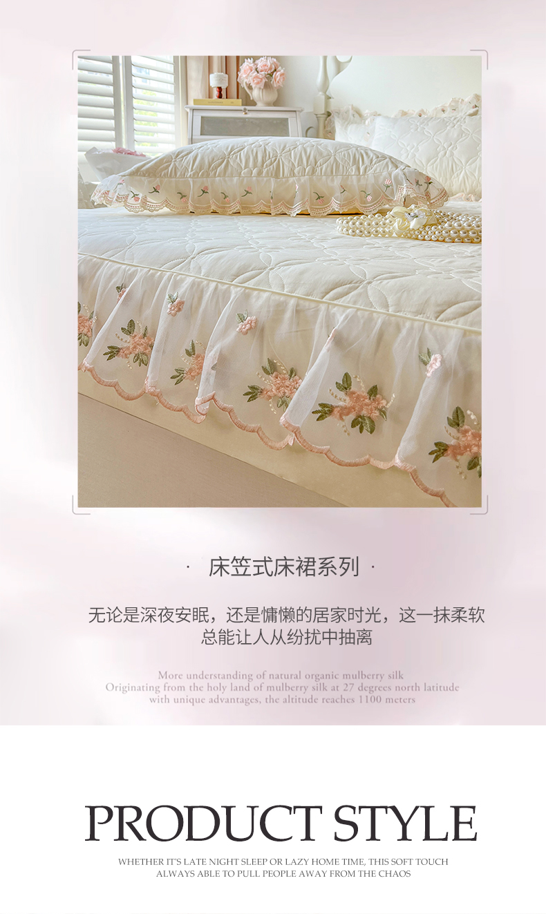 • 91家纺网 家纺一手货源 找家纺 (总)网红馆(ck家纺) 2026新款全棉蕾丝花边床裙款床笠晨暮花间系列,绯红,粉色,麦绿,米色,浅紫,雾蓝